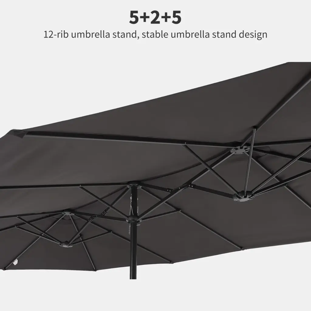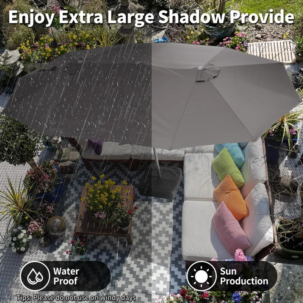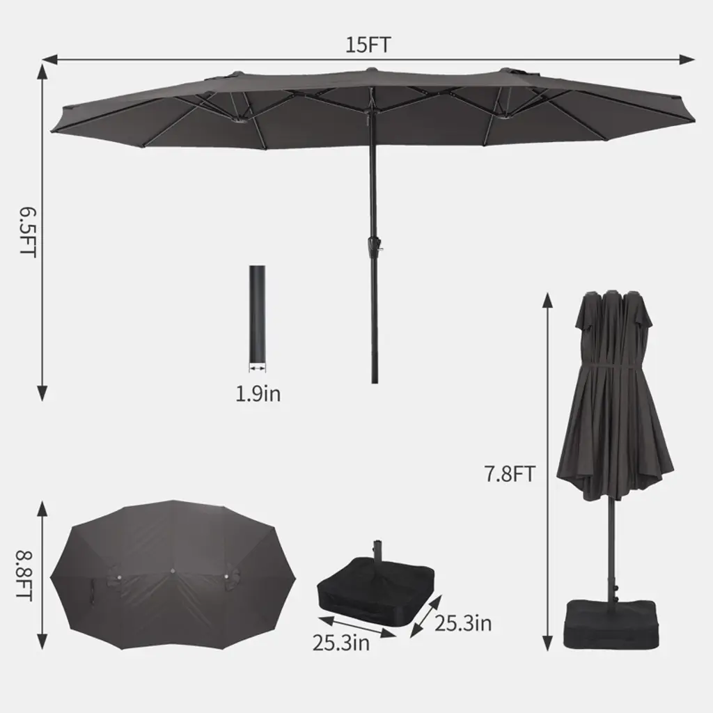 Elevate your outdoor experience with 15 FT Extra Large Patio Umbrella, offering generous shade, durable construction, and effortless convenience for your garden, backyard, or poolside gatherings!Highlights at a Glance:Generous 15 x 9 ft coverage for ultimate outdoor comfort.Double-sided market umbrella design for stylish shade.Convenient crank handle for easy opening and closing.UV protective and waterproof fabric ensures lasting durability.Sturdy base for reliable support by the poolside or patio.Specification:Color: Dark Gray/Navy Blue/Khaki/Wine RedMaterial: Iron+Polyester clothDimension: 14.93 ft x 8.79 ft x 9.15 ftBase Size: 25.39 inches x 25.39 inchesPacking List:1 x Patio Umbrella1 x Instruction ManualNote:For best results and to extend the life of your umbrella, please close and secure it when not in use, especially during windy or rainy conditions.Measure your patio or outdoor space to ensure the umbrella provides adequate shade. Double-sided umbrellas come in various sizes, so check the dimensions to make sure it fits your needs for sun protection.Carefully follow the installation instructions when assembling.