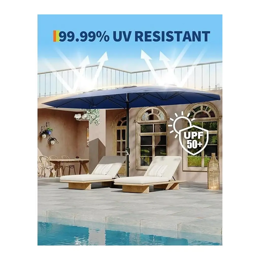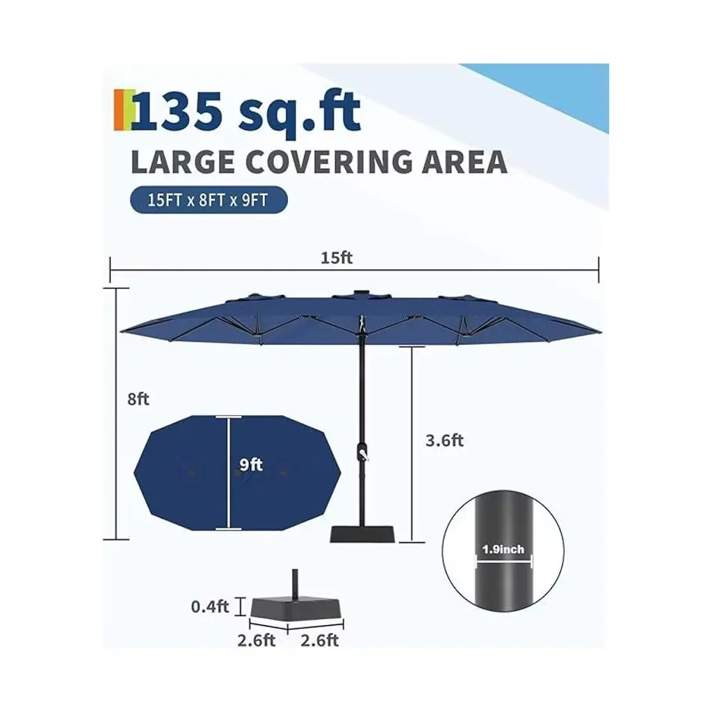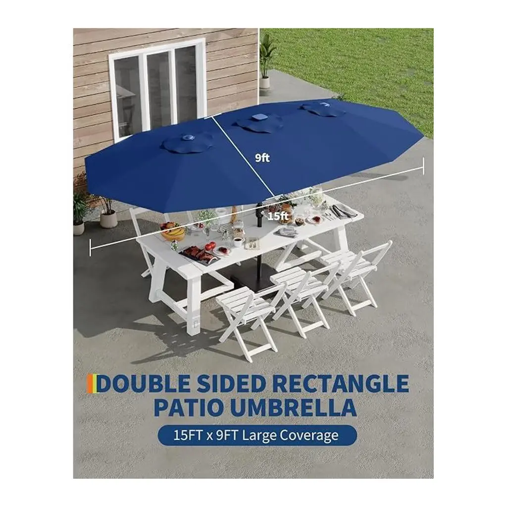 Garvee 15 FT Large Patio Umbrella with Base Included, Double-Sided Outdoor Market Rectangle Umbrellas Oversized Shade for 2-8 People, Weighted Base for Pool, Deck, Backyard