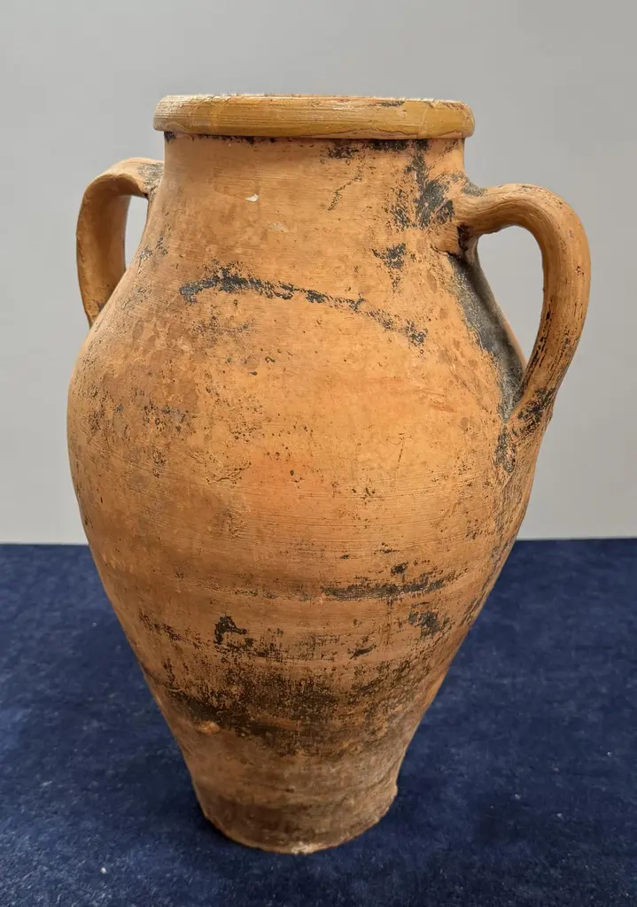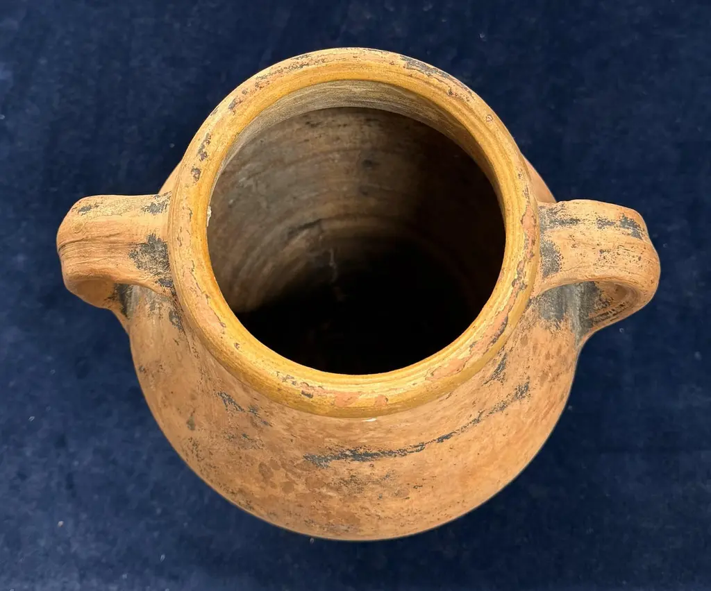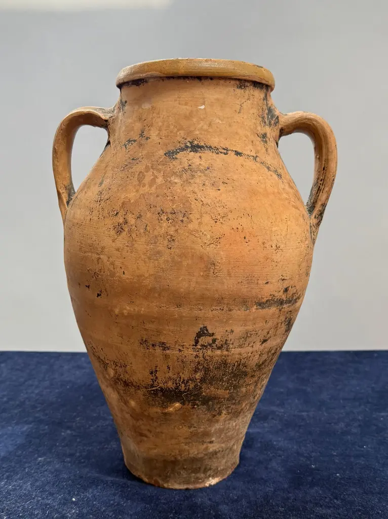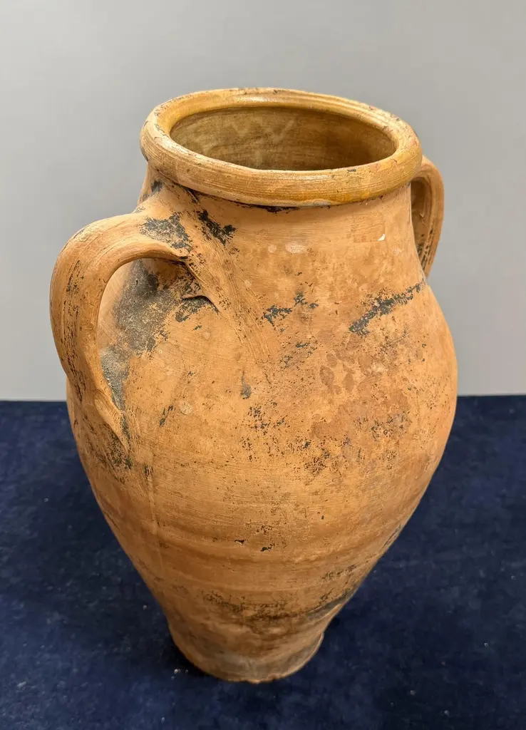 With its timeworn beauty and graceful silhouette, this 19th-century Turkish terracotta vessel captures the soulful elegance of Old World craftsmanship! Hand-thrown and kiln-fired circa 1880, the pot's elongated, amphora-inspired form is crowned with a softly flared rim and flanked by two sculptural handles, their curves inviting both touch and admiration.The surface retains a warm, earthen hue enriched by the faint sheen of its original glaze and centuries of gentle weathering. Smoky, charcoal-toned traces and natural mineral deposits lend painterly depth, while the tactile irregularities speak to its artisanal origins. Once a utilitarian object, likely used for storing or transporting provisions, it now stands as an evocative decorative piece, equally at home in a refined Mediterranean interior, a wabi-sabi vignette, or an elevated rustic setting.