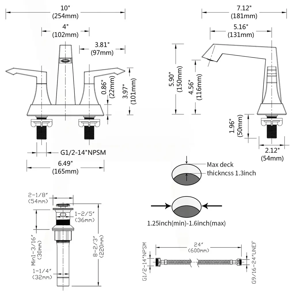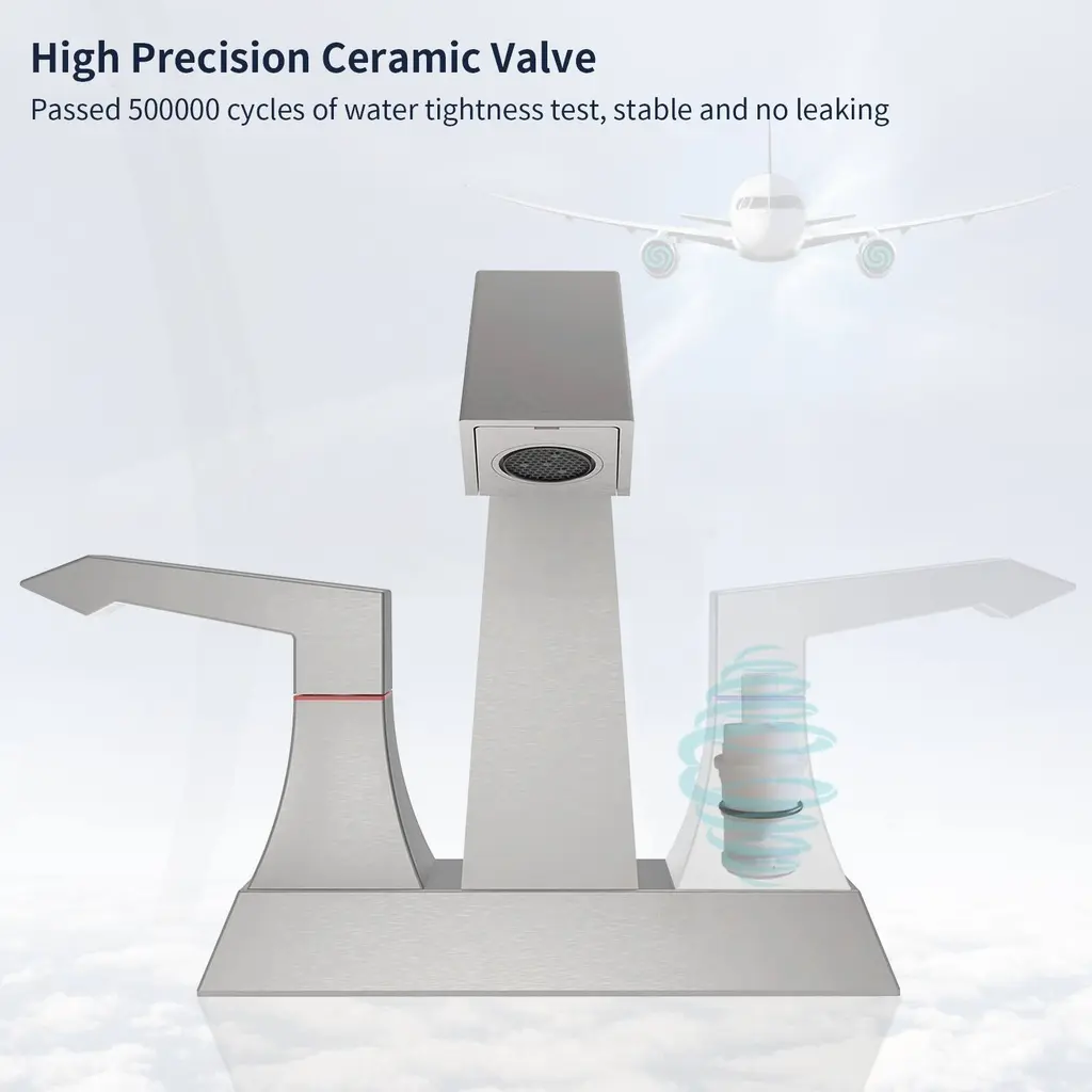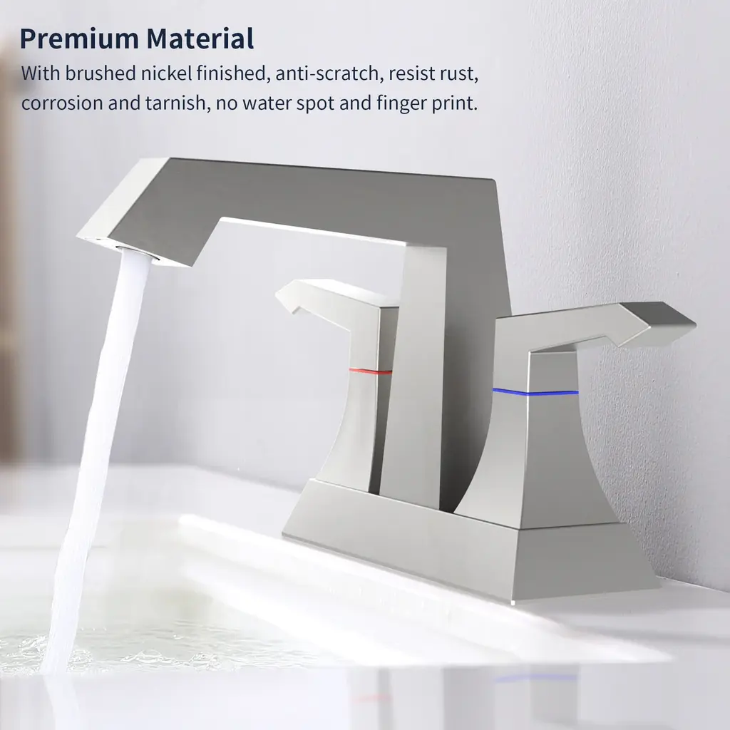 Product FeaturesCeramic valve --- The ceramic valve core of this bathroom sink faucet Brushed nickel has undergone many cycles of testing and is more durable than other bathroom sink faucets on the market.Modern Design: Minimalist design makes your bathroom more elegant. Strong metallic appearance and spaceship style design make your bathroom more personalized.Brushed nickel finish --- With premium surfaces resist rust, corrosion and tarnish. Also they resist fingerprints and water spots for neat looking.Accessories Included: Pop-up drain & water Inlet hoses.Easy to install --- This brushed nickel bathroom sink faucet is designed to fit 3-hole, 4"centerset configurations, and comes with step-by-step instruction with quick connect for easy installation.DescriptionRecommended Uses For Product BathroomMounting Type:Deck MountFinish Type:BrushedMaterial:MetalColor:Brushed Nickel4Number of Handles:2Included:Components Press Type Pop-up Drainx1, 60CM Supply Hosex2, User Manualx1, Built-In Water Filterx1Number Of Holes:3Special:Feature Pop Up DrainHandle Type:LeverStyle:ModernInstallation Method:CentersetMaximum Flow Rate:1.5 Gallons Per MinuteItem Dimensions:LxWxH 8.11x10.23x7.67 inchesHandle Material:ZincSpout Height:4.1 InchesSpout Reach:5.1 InchesHandle Location:Left Hot & Right ColdItem Weight:4.59 poundsProduct Dimensions:8.11x10.23x7.67 inchesSize:4" CentersetFinish:BrushedCertification:NSFSpecial:Features Pop Up DrainBatteries Included? NoBatteries Required? No