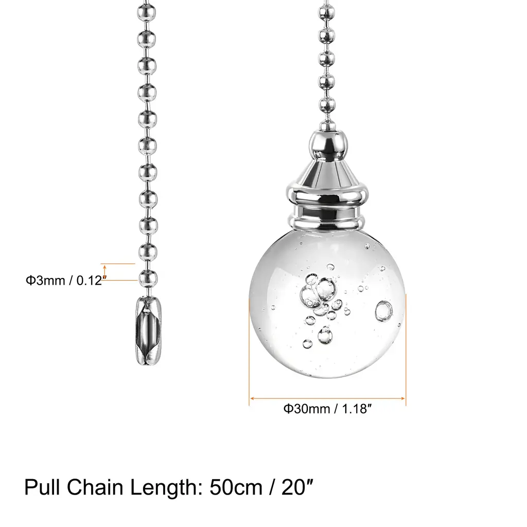 Pull Chain Length: 50cm / 20inch; Ball Diameter: 30mm / 1.18inch.Made of crystal and nickel plated ball chain, beautiful and durable.Replacement for broken or outdated pull chain.You can easily attach it to the existing chain from your lighting or fan.Used for Lighting, Fans, Ceiling Fans, Ventilation and etc.Features:Made of crystal and nickel plated ball chain, beautiful and durable.Replacement for broken or outdated pull chain.Used for Lighting, Fans, Ceiling Fans, Ventilation and etc.You can easily attach it to the existing chain from your lighting or fan.Specifications:Material: Crystal, Nickel-plated IronColor: Silver Tone, ClearPull Chain Length: 50cm / 20inchBall Diameter: 30mm / 1.18inchBead Dia: 3mm / 0.12inchPackage Contents:2Pcs x Pull Chain