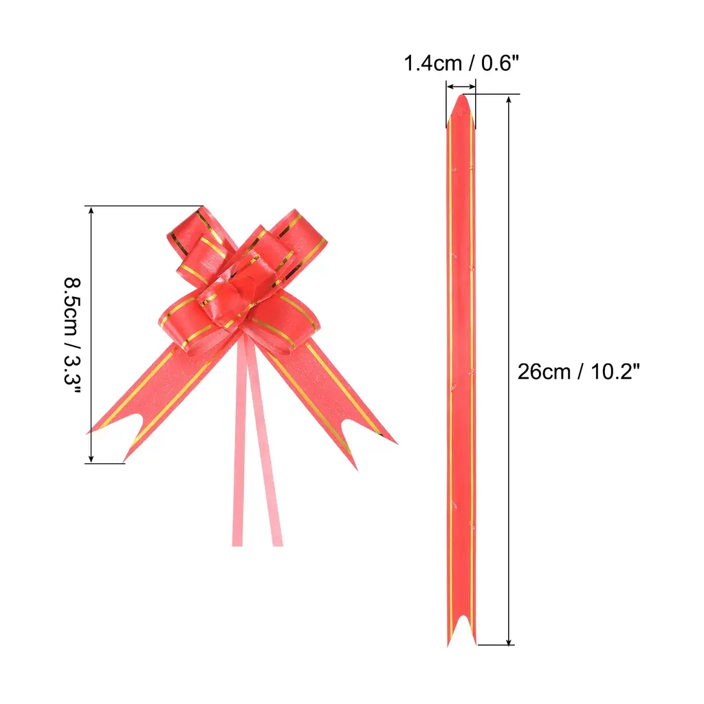 These pull bows can be widely used for the decoration of weddings, banquet, Christmas, New Year, Valentine's Day, and other festive celebrations, and can also be used for the decoration of birthday gifts, packaging boxes, bouquet gifts, wine bottles, fruit baskets, cars, etc, to add a festive atmosphere.SpecificationColor: RedMaterial: PP PlasticBow Diameter: 8.5 cm / 3.3 inchSize Before Pulling: 26 x 1.4 cm / 10.2 x 0.6 inch (L*W)Packing List: 200pcs x Gift Wrapping Pull BowsAdvantageThe pull bow is made of waterproof plastic, it won't tear easily when pulled, and it's reusable and durable.The bow ribbons have bright colors, and the surface is shiny and lustrous, which plays a very good role in decorating the holiday, making the gift more beautiful and delicate.InstructionPull the two inner ribbon cords, push the outer ribbon up gently, tie a knot, or glue it to the gift box, easy to assemble.NOTE:Just push it up gently along the ribbon, avoiding too much force to damage the fixed knots.Due to manual measurement, there may be slight errors.