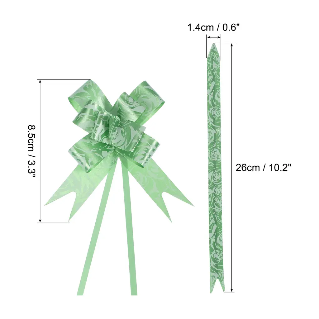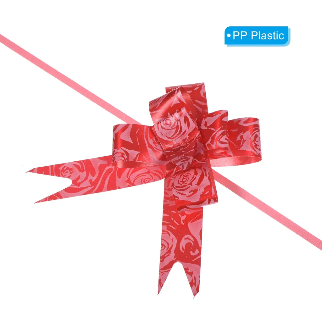 These pull bows can be widely used for the decoration of weddings, banquet, Christmas, New Year, Valentine's Day, and other festive celebrations, and can also be used for the decoration of birthday gifts, packaging boxes, bouquet gifts, wine bottles, fruit baskets, cars, etc, to add a festive atmosphere.SpecificationColor: RedMaterial: PP PlasticBow Diameter: 8.5 cm / 3.3 inchSize Before Pulling: 26 x 1.4 cm / 10.2 x 0.6 inch (L*W)Packing List: 200pcs x Gift Wrapping Pull BowsAdvantageThe pull bow is made of waterproof plastic, it won't tear easily when pulled, and it's reusable and durable.The bow ribbons have bright colors, and the surface is shiny and lustrous, which plays a very good role in decorating the holiday, making the gift more beautiful and delicate.InstructionPull the two inner ribbon cords, push the outer ribbon up gently, tie a knot, or glue it to the gift box, easy to assemble.NOTE:Just push it up gently along the ribbon, avoiding too much force to damage the fixed knots.Due to manual measurement, there may be slight errors.