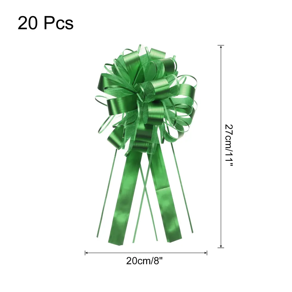 What is this?Personalized metallic bright colored organza big pull bows with ribbons are suitable for gift wrapping bows, present decorating bows, DIY crafts handicraft decoration, gift wrapping packaging, holiday decoration, wedding gift baskets decoration, flower design, party decoration, floral bouquet ribbon, scrapbooking, and can be used to decorate Christmas, Halloween, Thanksgiving, Teacher's Day, etc.What will I get?Gift wrapping bows, are in size of : 27cm x 20cm/11-inch x 8-inch(W*L)In the package of: 20pcs x Gift wrapping bowsIs there any advantages of the product?Bright color, beautiful, which plays a good decorative role, especially suitable for holiday, wedding and party decoration; Beautiful and elegant, soft, comfortable to the touch, and durableHow to use it?Steps of installation: 1. Select gift wrapping bows with appropriate specification; 2. For gift wrapping, holiday decorationWhat should I notice?Please pay attention to select the gift wrapping bows with suitable specifications