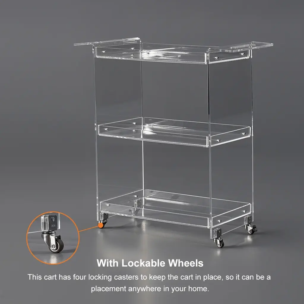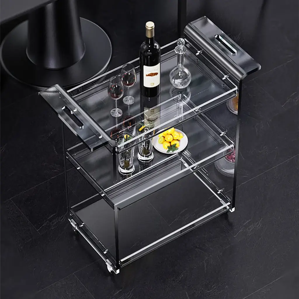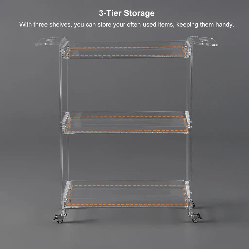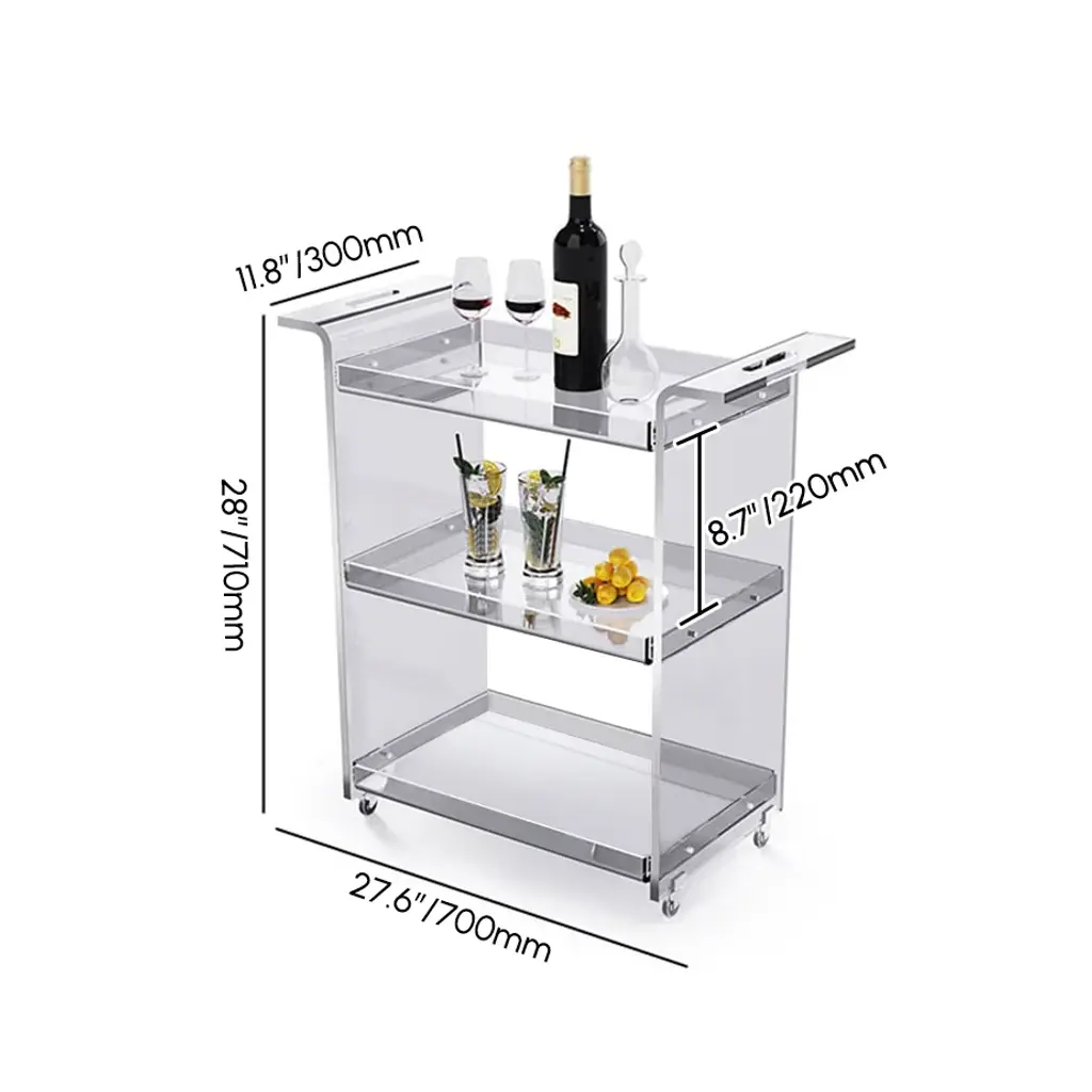 Bring modern elegance to your home with this 27.6" 3-tier acrylic serving cart. Designed for both style and practicality, this trolley features a sleek, transparent acrylic frame and tray-style shelves that provide ample storage for drinks, snacks, or decorative items. With two ergonomic handles and four smooth-rolling wheels, it offers easy maneuverability, perfect for entertaining or everyday use. The rectangular shape fits seamlessly into any room, adding a touch of sophistication to your decor.