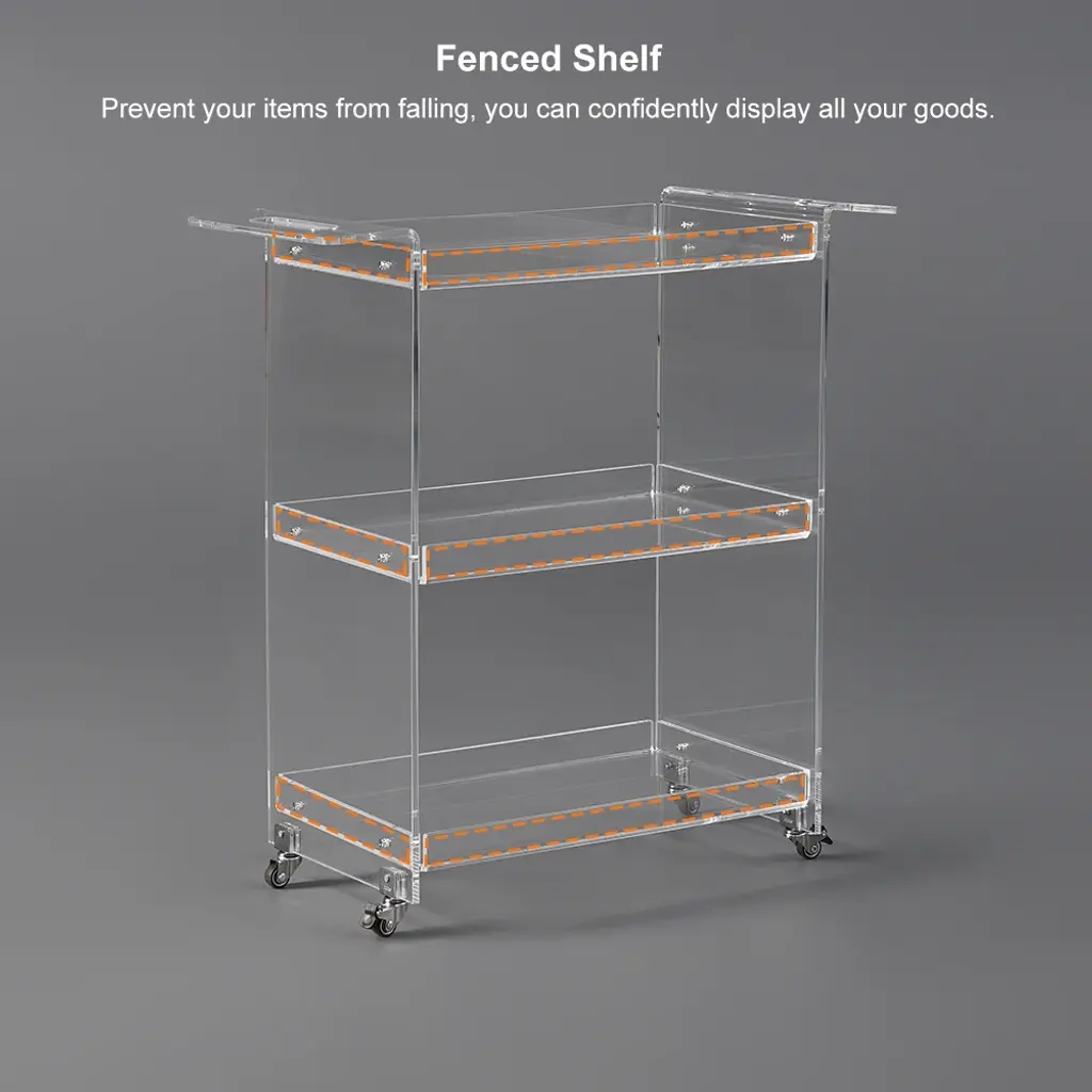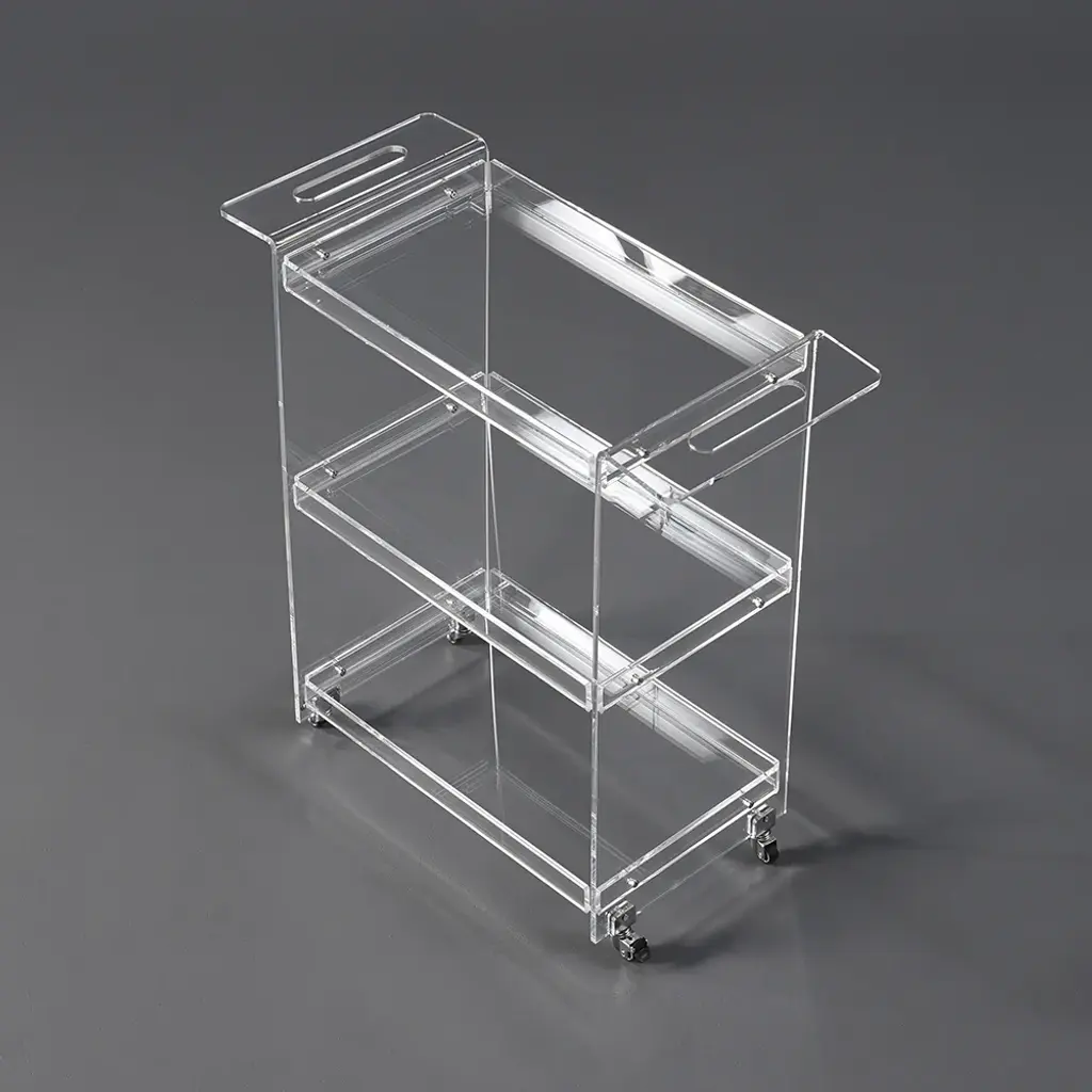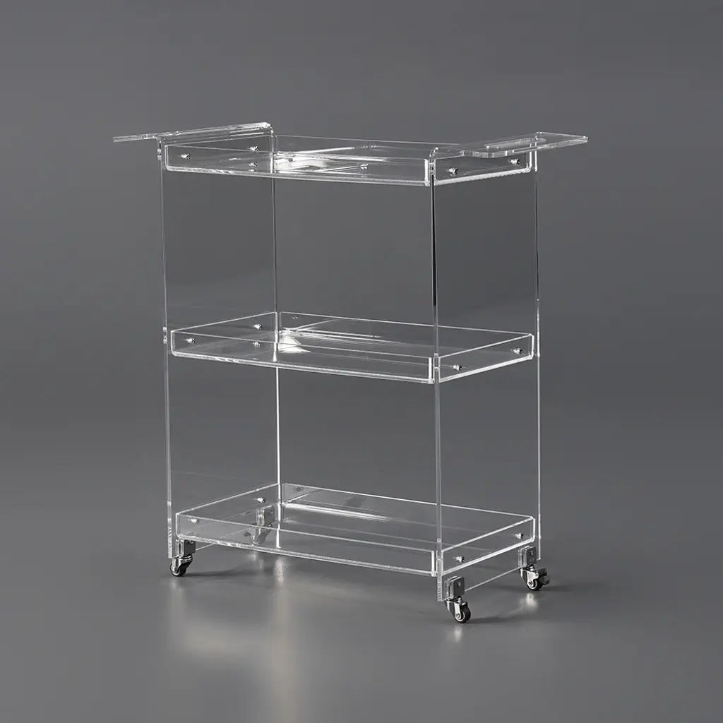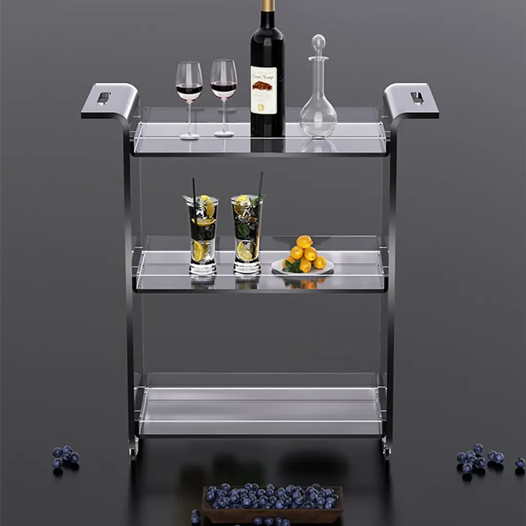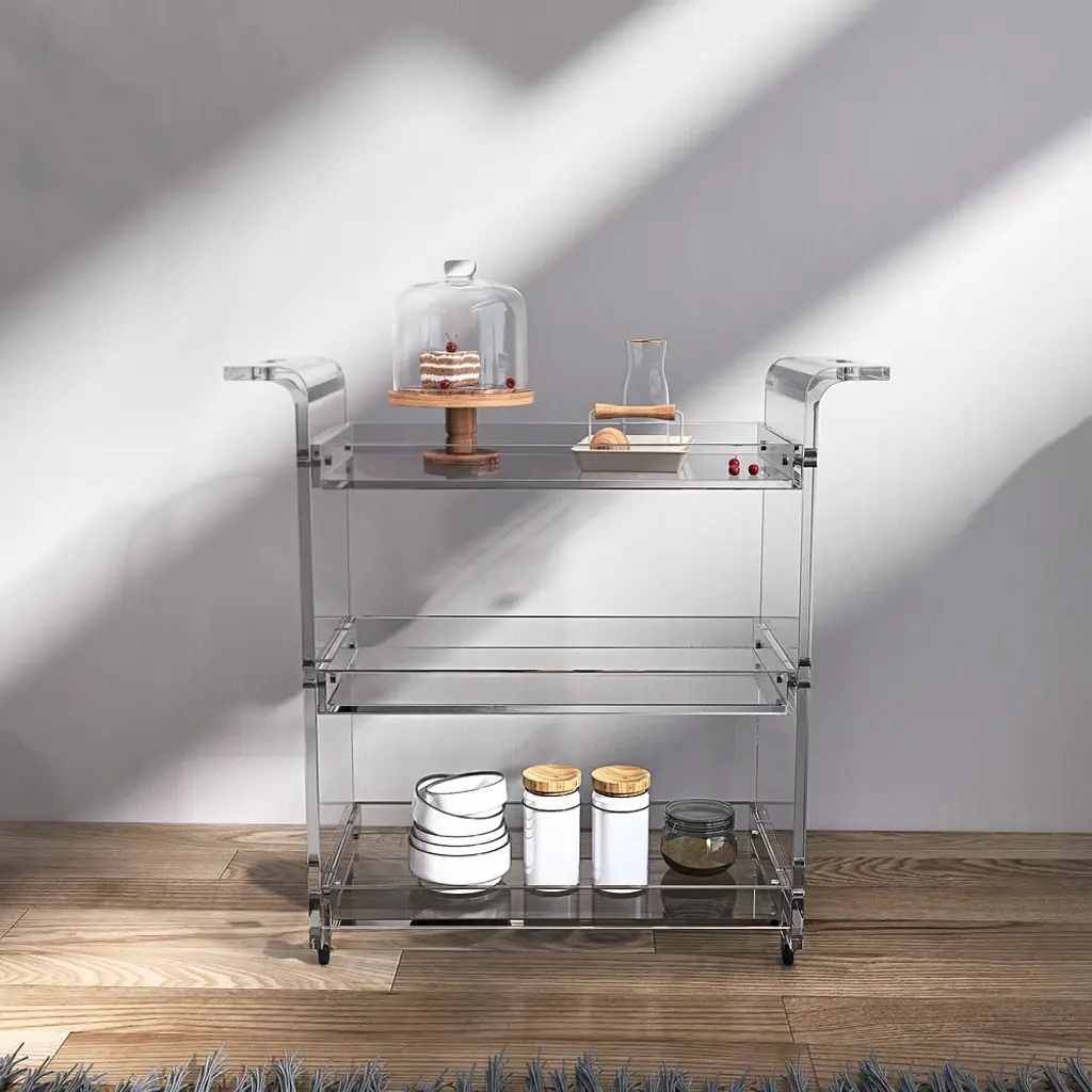 Bring modern elegance to your home with this 27.6" 3-tier acrylic serving cart. Designed for both style and practicality, this trolley features a sleek, transparent acrylic frame and tray-style shelves that provide ample storage for drinks, snacks, or decorative items. With two ergonomic handles and four smooth-rolling wheels, it offers easy maneuverability, perfect for entertaining or everyday use. The rectangular shape fits seamlessly into any room, adding a touch of sophistication to your decor.