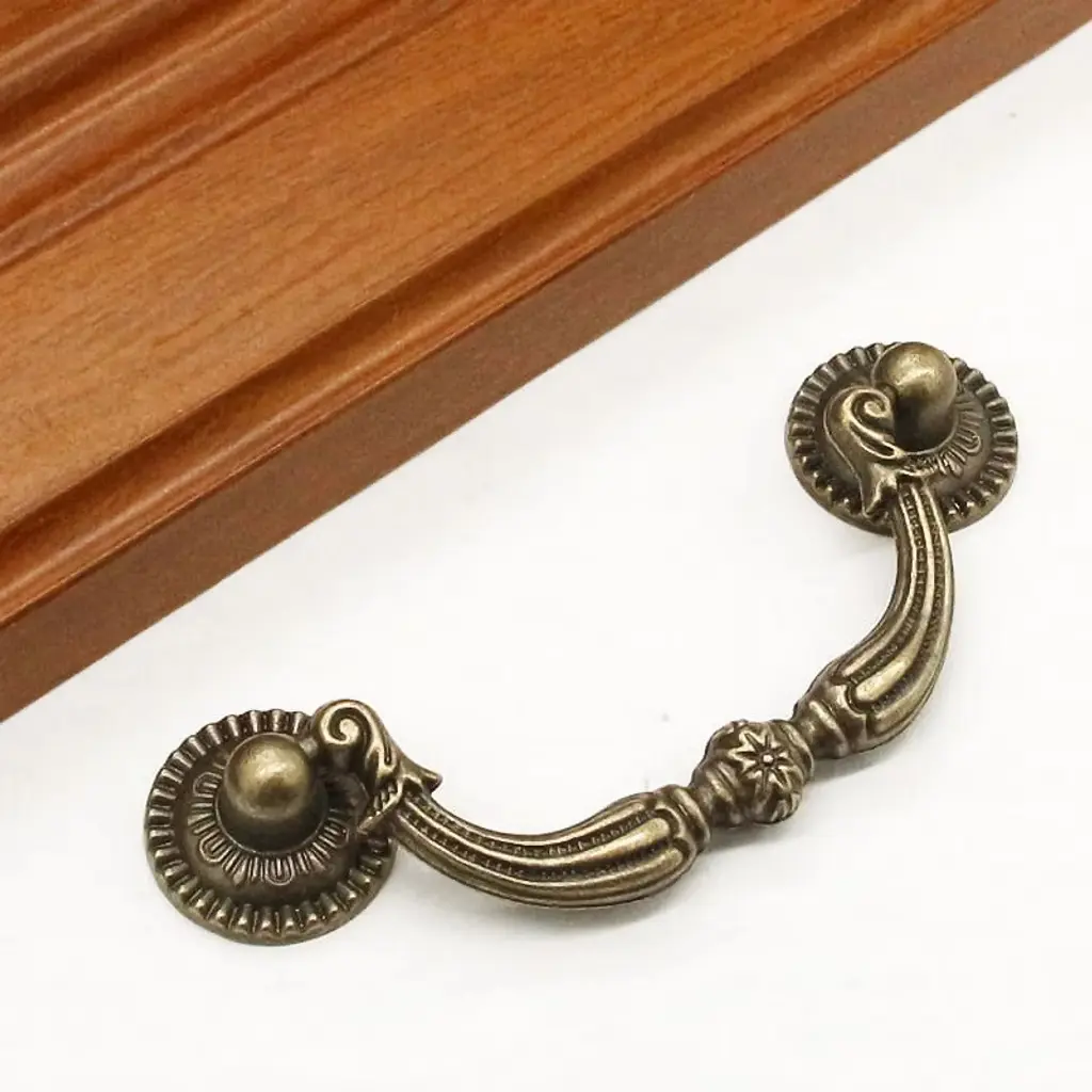 Easily update your cabinets and drawers with this elegant bail pull handle. Crafted from durable zinc alloy with a beautiful bronze coating finish, this handle is wear resistant, rust resistant, and corrosion resistant, ensuring it will not fade over time. The exquisite flower shape and simple, vintage design are perfect for adding a new look to your furniture and complement a European or classic style. With a standard hole distance of 3 inches, a total length of 3.8 inches, and a 1-inch base, this handle is ideal for replacing old or broken pulls. It is a versatile choice for wardrobes, cabinets, dressers, and more, blending timeless style with reliable quality.