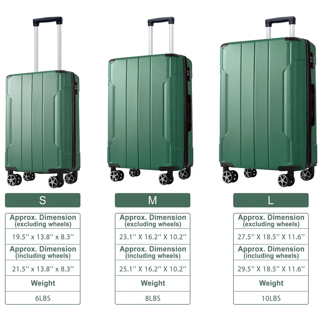 3 Piece Hard Shell Abs Lightweight Durable Suitcases Set W/double Spinner Wheels And Telescopic Handle - Green
