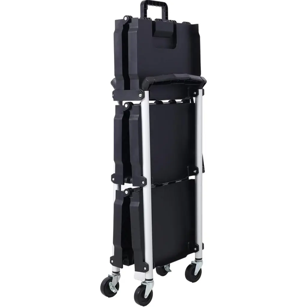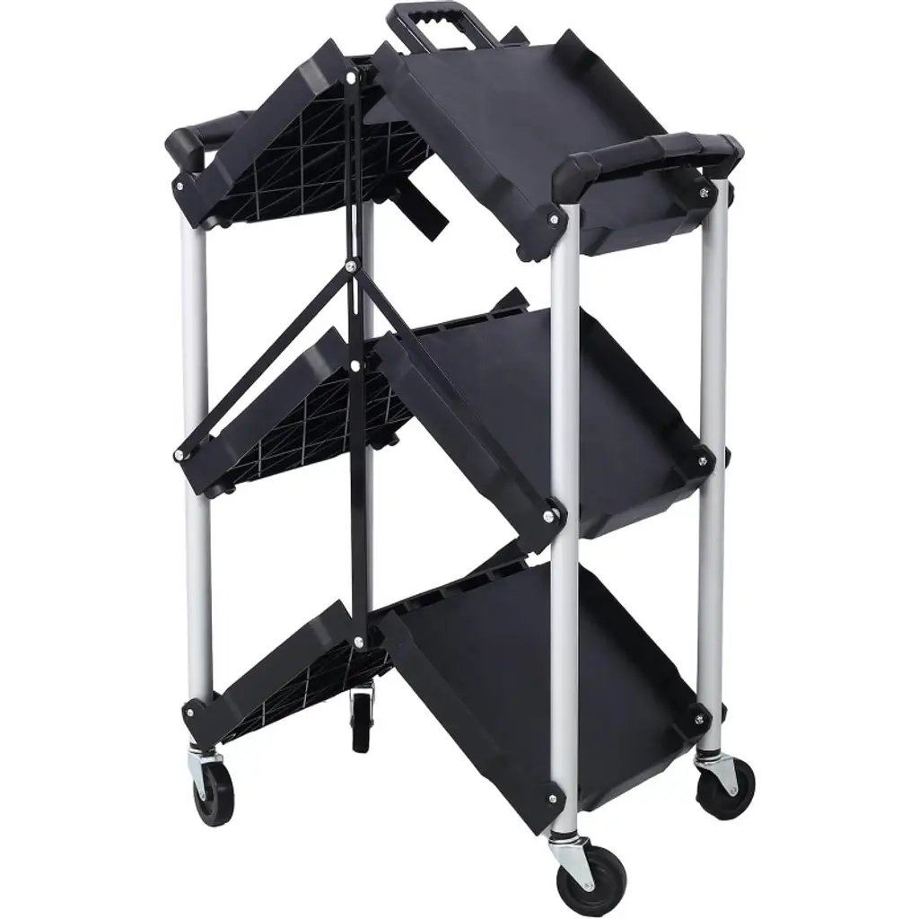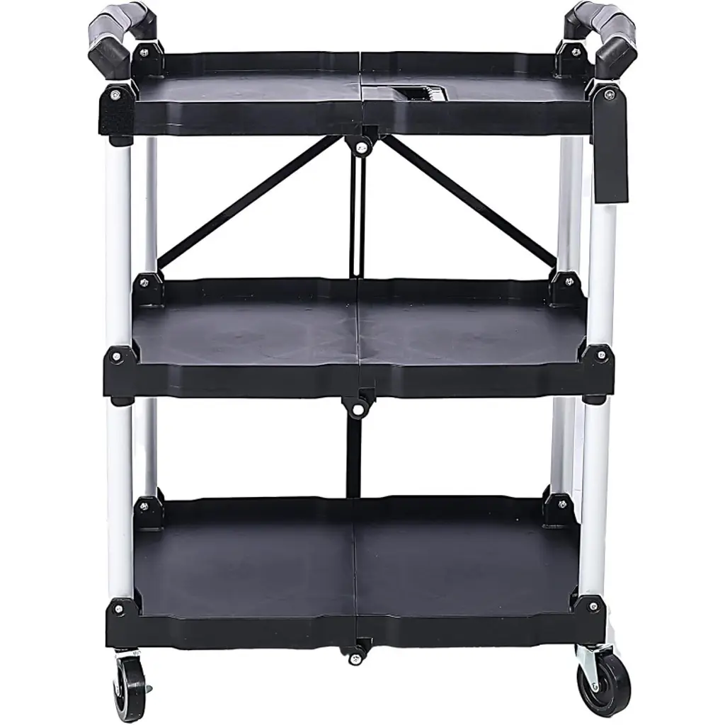 Product DescriptionEver wish you could move everything you need in one trip and then simply fold your cart away when you're done? Discover how effortless organizing and transporting your tools or supplies can be with this versatile rolling utility cart.Highlights at a glance:- Heavy duty plastic and metal frame supports a variety of heavy loads- Folds flat for easy storage and lightweight for effortless portability- Waterproof, anti-rust, UV and tear resistant for long-lasting durability- Dual handles and four swivel castors allow smooth and controlled movement- Instantly unfolds for quick use in your garage, home, or workspace- Three spacious tiers keep tools, supplies, and equipment organized and easy to reach- Perfect as a rolling utility cart, service cart, tool cart, or serving cart for any task.Product InformationMaterial: Polypropylene and MetalColor: BlackItem Weight: 18.7 PoundsProduct Dimensions: 15.4"D x 25.6"W x 32.7"HSpecial Feature: DurableNumber of Shelves: 3Packing list:1x Folding Utility Cart1x ManualFriendly note:Check that all parts are securely in place before loading items onto the cart.To ensure safe and stable use, place heavier items on the lower shelves.Avoid exceeding the weight limit for each tier.Lock the castors when the servicing cart is stationary.Keep away from open flames and sharp objects.