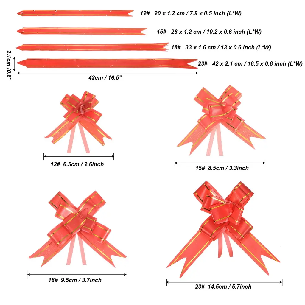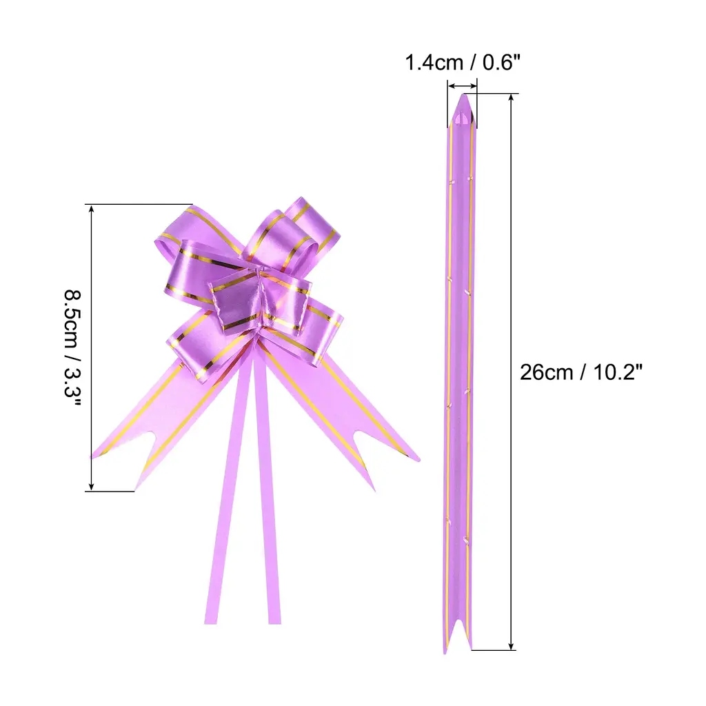 These pull bows can be widely used for the decoration of weddings, banquet, Christmas, New Year, Valentine's Day, and other festive celebrations, and can also be used for the decoration of birthday gifts, packaging boxes, bouquet gifts, wine bottles, fruit baskets, cars, etc, to add a festive atmosphere.SpecificationColor: Light PinkMaterial: PP PlasticBow Diameter: 8.5 cm / 3.3 inchSize Before Pulling: 26 x 1.4 cm / 10.2 x 0.6 inch (L*W)Packing List: 300pcs x Gift Wrapping Pull BowsAdvantageThe pull bow is made of waterproof plastic, it won't tear easily when pulled, and it's reusable and durable.The bow ribbons have bright colors, and the surface is shiny and lustrous, which plays a very good role in decorating the holiday, making the gift more beautiful and delicate.InstructionPull the two inner ribbon cords, push the outer ribbon up gently, tie a knot, or glue it to the gift box, easy to assemble.NOTE:Just push it up gently along the ribbon, avoiding too much force to damage the fixed knots.Due to manual measurement, there may be slight errors.