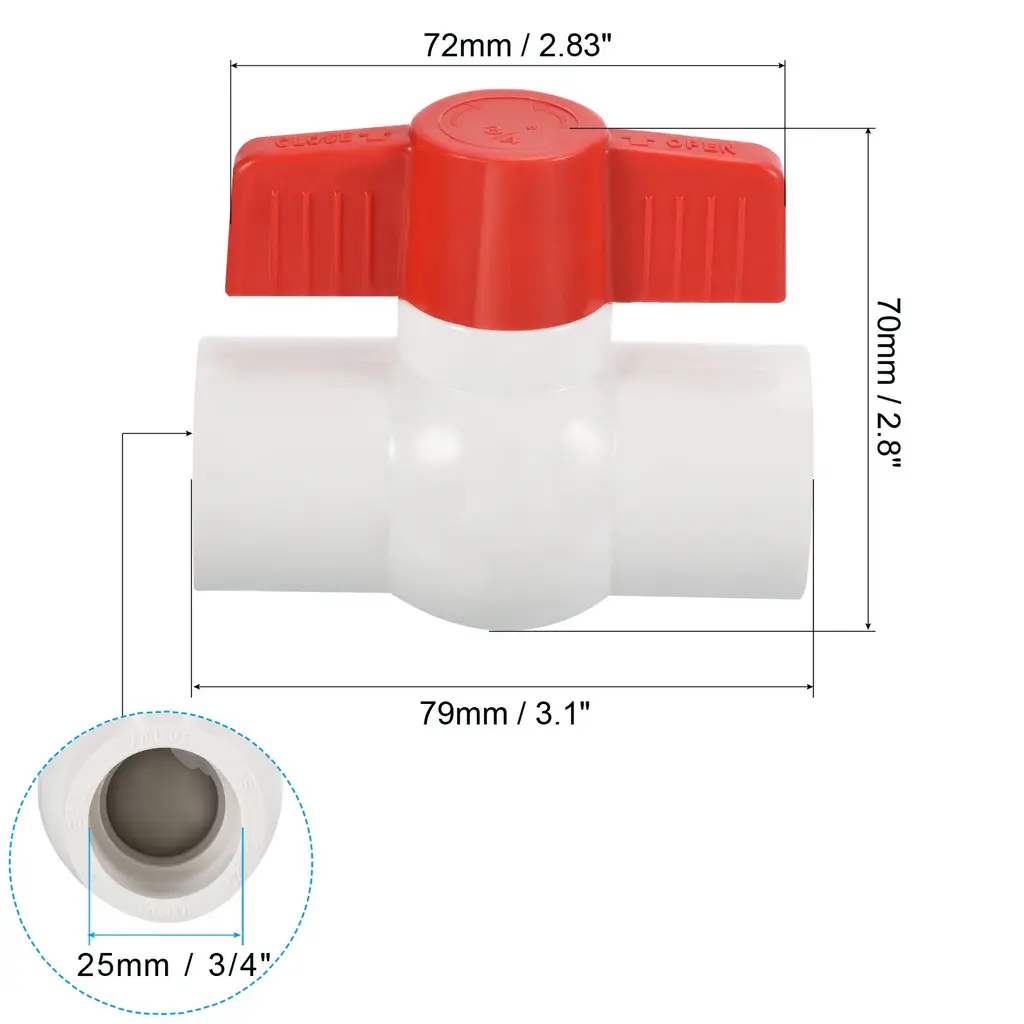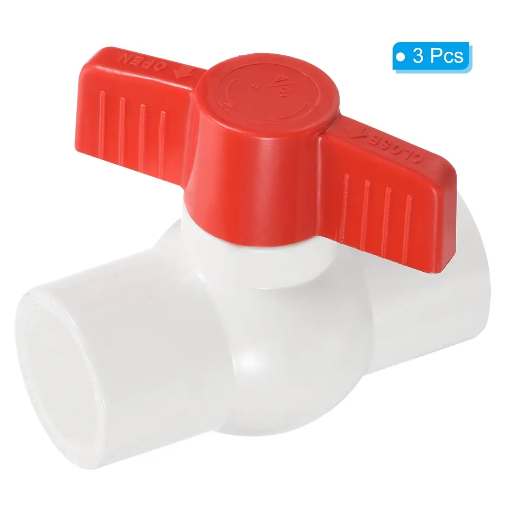 Color: White, Material: UPVC, Inner Diameter: 25mm / 3/4 Inch, Handle Length: 72mm / 2.83 Inch, Size: 79 x 70mm / 3.1 x 2.8 Inch (L*H), Packing List: 3 x UPVC Ball ValveAdvantage: Made of UPVC, the weight is lighter than metal fittings, the impact strength is high, it is not easy to rust and scale, and it is firmly installed; the butterfly handle with manual on/off control is easy to operate; the overall polishing treatment makes the pipe fittings beautiful and wear-resistant, and the water flow is smooth, The water pipe connection method is glued.INSTRUCTION: Made of UPVC material, smooth plastic tubes with corresponding outer diameters at both ends are bonded by glue.Application: UPVC Ball Valve Fittings is a straight-through valve connecting two pipes in the same direction, ball valves use a spherical disc to control flow between pipes, pipes, or hoses. Suitable for indoor and outdoor use such as sewer pipes, daily household, landscape and farmland irrigation, swimming pools, cold water, ventilation, waste applications, aquaculture, and agricultural irrigation systems.NOTE: Wear gloves to operate. The end of the casing should be smooth and tidy. Do not apply too much adhesive to the UPVC material. Regularly check during use, and replace it in time if it is aging.UPVC Ball Valve Fittings is a straight-through valve connecting two pipes in the same direction, ball valves use a spherical disc to control flow between pipes, pipes, or hoses. Suitable for indoor and outdoor use such as sewer pipes, daily household, landscape and farmland irrigation, swimming pools, cold water, ventilation, waste applications, aquaculture, and agricultural irrigation systems.Specification Color: WhiteMaterial: UPVCInner Diameter: 25mm / 3/4 InchHandle Length: 72mm / 2.83 InchSize: 79 x 70mm / 3.1 x 2.8 Inch (L*H)Packing List: 3 x UPVC Ball ValveAdvantage Made of UPVC, the weight is lighter than metal fittings, the impact strength is high, it is not easy to rust and scale, and it is firmly installed; the butterfly handle with manual on/off control is easy to operate; the overall polishing treatment makes the pipe fittings beautiful and wear-resistant, and the water flow is smooth, The water pipe connection method is glued. Instruction Made of UPVC material, smooth plastic tubes with corresponding outer diameters at both ends are bonded by glue.NOTE Wear gloves to operate. The end of the casing should be smooth and tidy. Do not apply too much adhesive to the UPVC material. Regularly check during use, and replace it in time if it is aging.