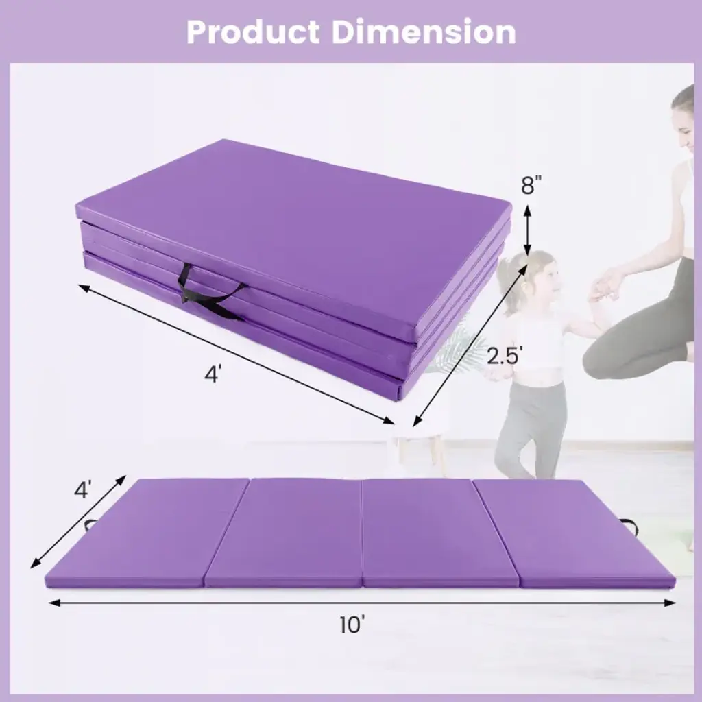 4-Panel Pu Leather Folding Exercise Mat With Carrying Handles - 10' X 4' X 2" - Purple