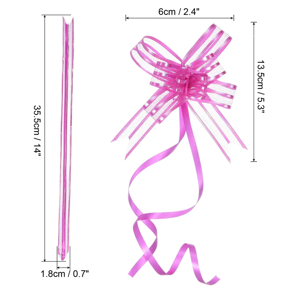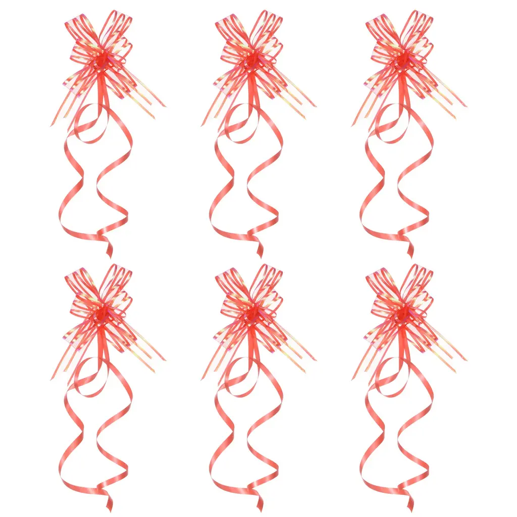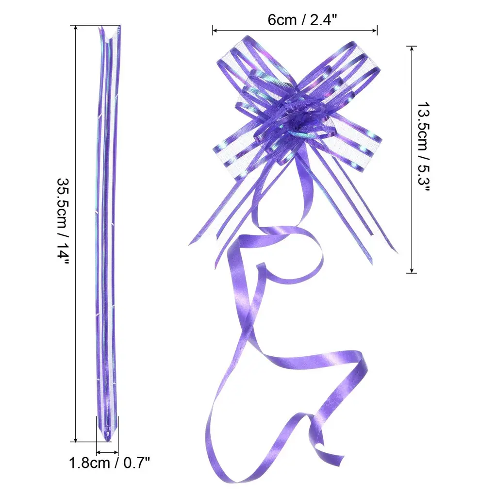 These pull bows can be widely used for the decoration of weddings, banquet, Christmas, New Year, and other festive celebrations, and can also be used for the decoration of birthday gifts, packaging boxes, bouquet gifts, wine bottles, fruit baskets, cars, etc, to add a festive atmosphere.SpecificationColor: RedMaterial: PlasticBow Size: 13.5 x 6 cm / 5.3 x 2.4 inch (L*W)Dimensions Before Pulling: 35.5 x 1.8 cm / 14 x 0.7 inch (L*W)Packing List: 40Pcs x Sparkling Pull BowsAdvantageThe pull bow is made of waterproof plastic, it won't tear easily when pulled, and it's reusable and durable.The bow ribbons have bright colors, and the surface is shiny and lustrous, which plays a very good role in decorating the holiday, making the gift more beautiful and delicate.InstructionPull the two inner ribbon cords, push the outer ribbon up gently, tie a knot, or glue it to the gift box, easy to assemble.NOTE:Just push it up gently along the ribbon, avoiding too much force to damage the fixed knots.Please note that the size is correct before placing an order.