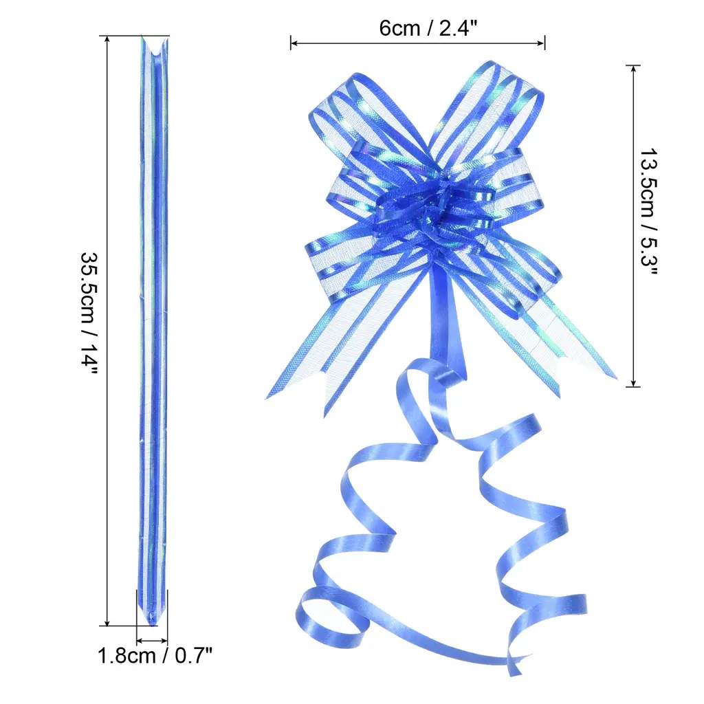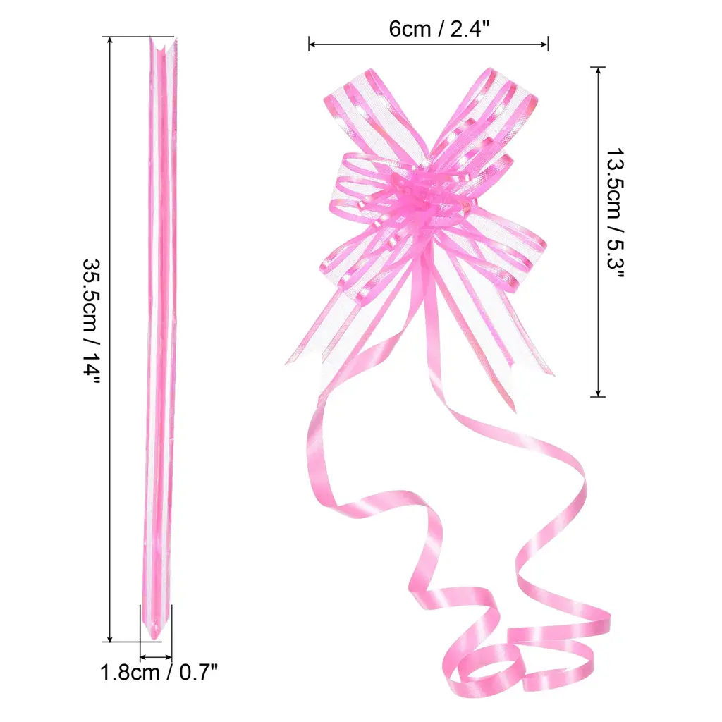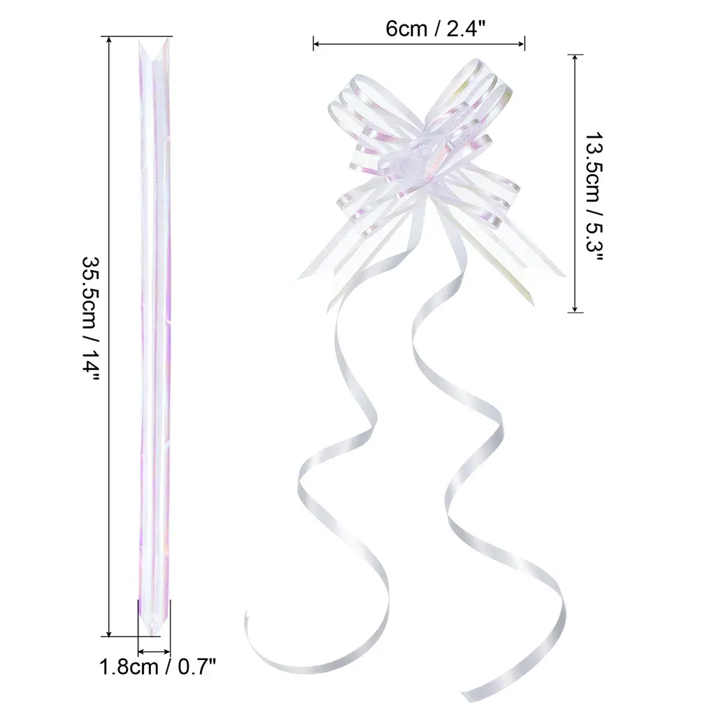 These pull bows can be widely used for the decoration of weddings, banquet, Christmas, New Year, and other festive celebrations, and can also be used for the decoration of birthday gifts, packaging boxes, bouquet gifts, wine bottles, fruit baskets, cars, etc, to add a festive atmosphere.SpecificationColor: RedMaterial: PlasticBow Size: 13.5 x 6 cm / 5.3 x 2.4 inch (L*W)Dimensions Before Pulling: 35.5 x 1.8 cm / 14 x 0.7 inch (L*W)Packing List: 40Pcs x Sparkling Pull BowsAdvantageThe pull bow is made of waterproof plastic, it won't tear easily when pulled, and it's reusable and durable.The bow ribbons have bright colors, and the surface is shiny and lustrous, which plays a very good role in decorating the holiday, making the gift more beautiful and delicate.InstructionPull the two inner ribbon cords, push the outer ribbon up gently, tie a knot, or glue it to the gift box, easy to assemble.NOTE:Just push it up gently along the ribbon, avoiding too much force to damage the fixed knots.Please note that the size is correct before placing an order.