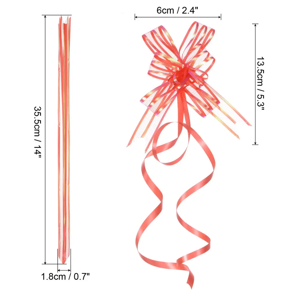 These pull bows can be widely used for the decoration of weddings, banquet, Christmas, New Year, and other festive celebrations, and can also be used for the decoration of birthday gifts, packaging boxes, bouquet gifts, wine bottles, fruit baskets, cars, etc, to add a festive atmosphere.SpecificationColor: RedMaterial: PlasticBow Size: 13.5 x 6 cm / 5.3 x 2.4 inch (L*W)Dimensions Before Pulling: 35.5 x 1.8 cm / 14 x 0.7 inch (L*W)Packing List: 40Pcs x Sparkling Pull BowsAdvantageThe pull bow is made of waterproof plastic, it won't tear easily when pulled, and it's reusable and durable.The bow ribbons have bright colors, and the surface is shiny and lustrous, which plays a very good role in decorating the holiday, making the gift more beautiful and delicate.InstructionPull the two inner ribbon cords, push the outer ribbon up gently, tie a knot, or glue it to the gift box, easy to assemble.NOTE:Just push it up gently along the ribbon, avoiding too much force to damage the fixed knots.Please note that the size is correct before placing an order.