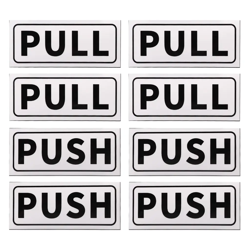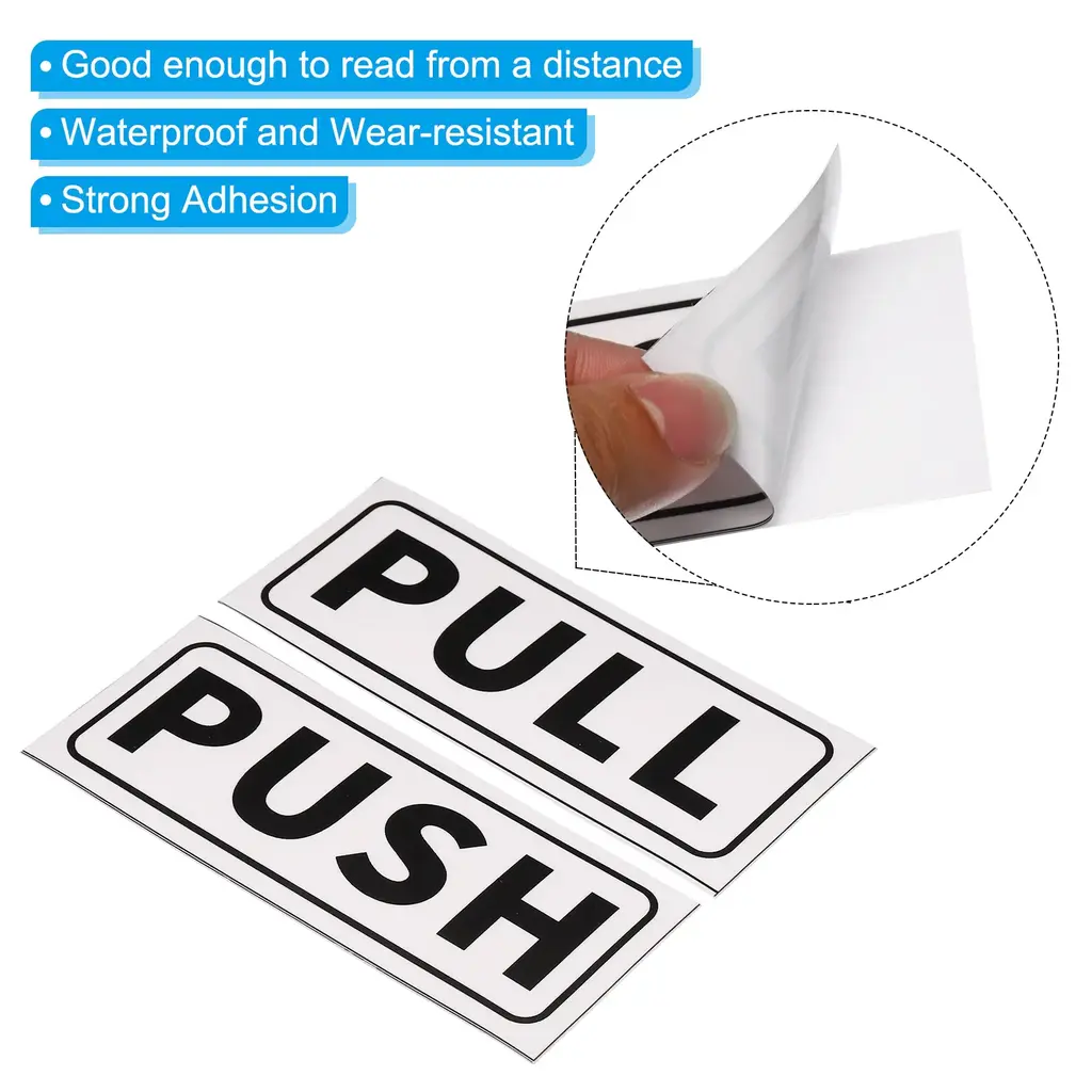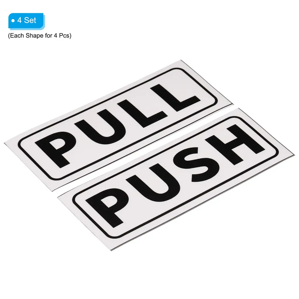 This door sign is convenient for you to distinguish the push door and the sliding door in the entrance passage, effectively preventing you from confuse the sliding direction of the door and avoiding hitting the door. Widely used in offices, convenience stores, commercial shops, cafes, supermarkets, etc.SpecificationColor: White/BlackMaterial: PVCThickness: 0.3 mm / 0.01 inchSize: 12.7 x 5 cm / 5 x 1.97 inch (L*W)Packing List: 4 Set - 4 x Push Pull Door Sticker (including 4 x PUSH and 4 x PULL)Advantage1. Made of durable PVC material, waterproof, weatherproof and wear-resistant, easy to clean, will not fade and can be used for a long time;2. Clear text is good enough to read from a distance, preventing guests from being confused about the sliding direction of the door;3. Adhesive-backed design can adhere well to smooth glass door surfaces for easy application and strong adhesion.InstructionEasy to use, just tear off the sticker on the back of the sign and stick it on a flat and smooth door surface.NOTE: Please note that the label needs to be attached to a smooth and clean door surface.