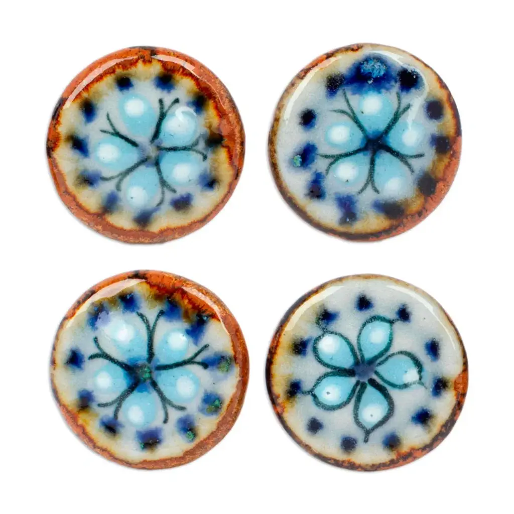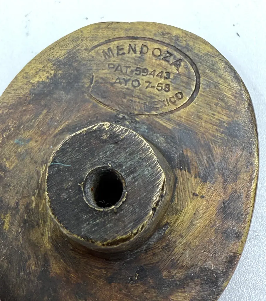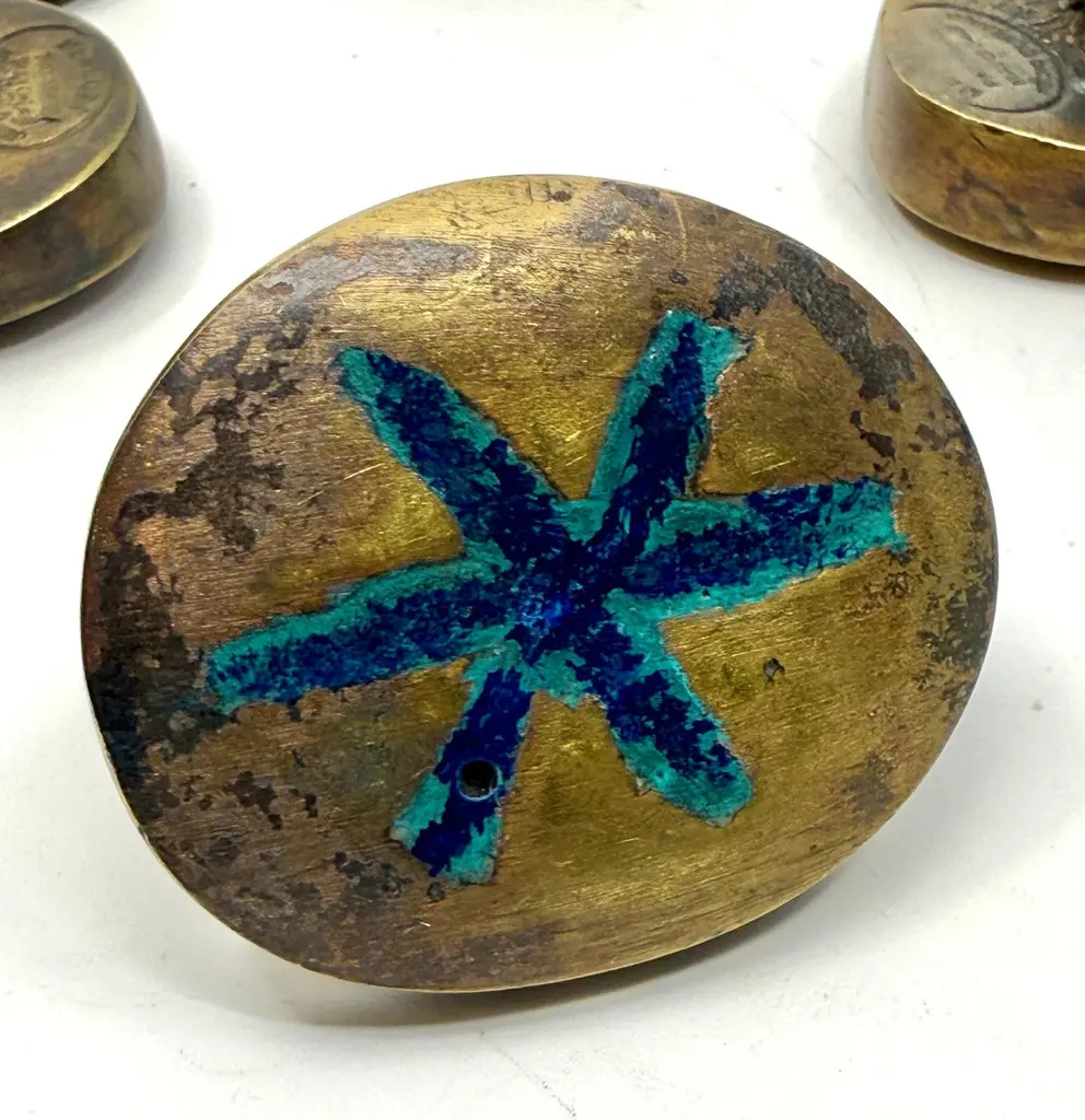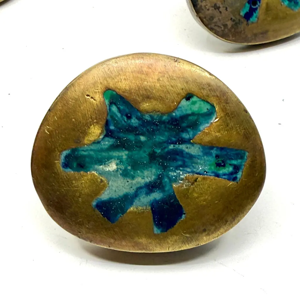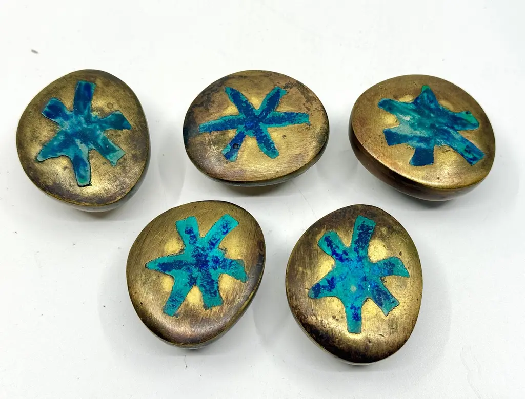 A beautiful set of 5 brass and inlaid malachite by Pepe Mendoza of Mexico. They are approximately 2.5 inches in diameter and approximately 1.5 inches in height. Each is stamped and dated 1958. They are in good condition with some nicks, scratches and imperfections from use.