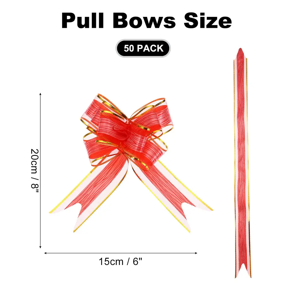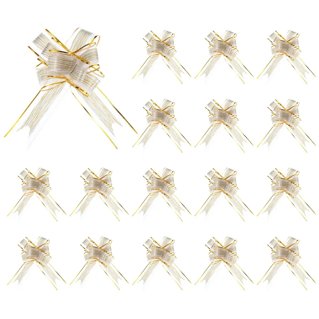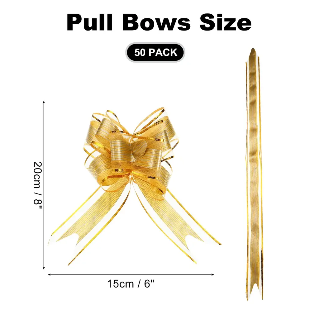Description1. These large ribbon pull bows are made from waterproof pp material, a good-quality material that is not easy to break and deform, the color of the bow is not easy to fade, and it can be reused for a long time.2. Pull bows for gift wrapping are a great match for the gift and presents, and feature a convenient pull design, allowing you to quickly and easily create a beautiful bow, making your gift box more romantic and aesthetic.3. To use the pull bows, simply hold the two inner strings and pull them apart to create a full and beautiful bow, and then adjust the loops to your desired shape and size, and attach the bow to your gift or decoration with the adhesive backing.4. These versatile pull bows not only can ornament gift box packaging, flower packaging, wedding tables, Christmas presents, and decorating baskets but also can be applied to Christmas, weddings, and more, making your important day full of romantic and fresh atmosphere.5. Avoid pulling the strings too hard, as this can cause the pull bow to become deformation, and keep away from small children, as the ribbons can pose a risk.SpecificationMaterial: PP MaterialColor: WhiteRibbon Size: 76x5cm/29.9x2 inch(L*W)Formed Size: 20x15cm/7.9x5.9 inch(L*W)Package included: 50pcs x pull bows