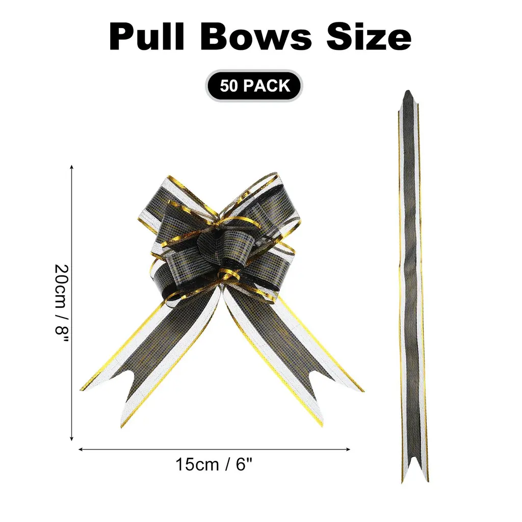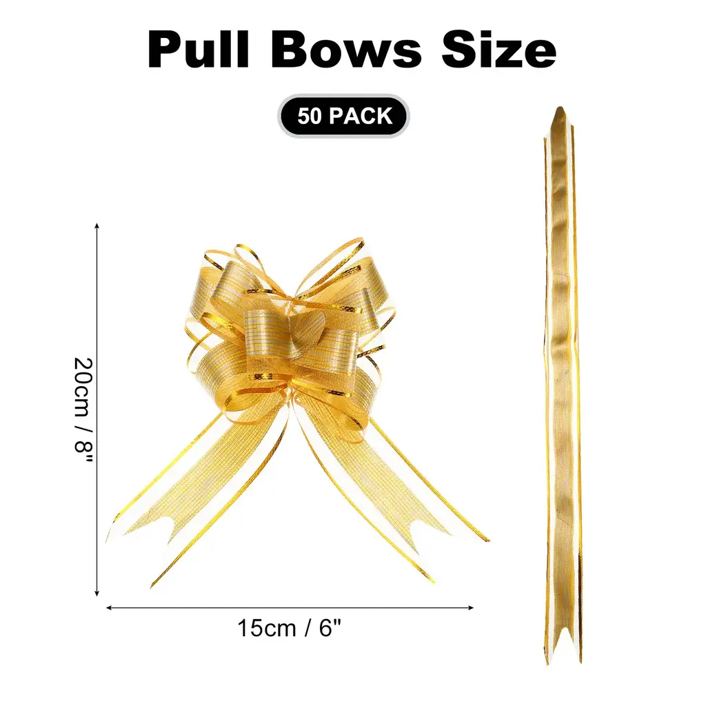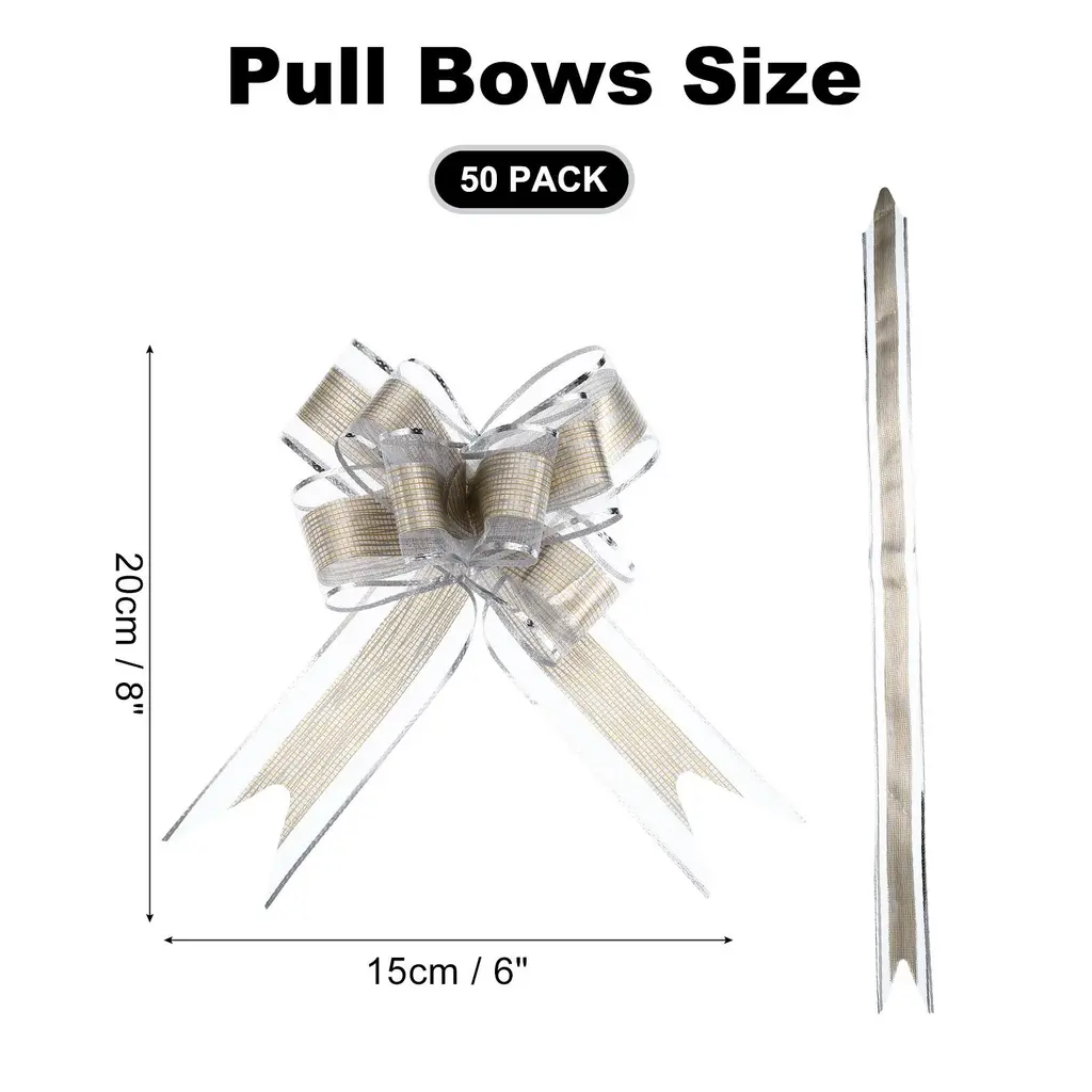 Description1. These large ribbon pull bows are made from waterproof pp material, a good-quality material that is not easy to break and deform, the color of the bow is not easy to fade, and it can be reused for a long time.2. Pull bows for gift wrapping are a great match for the gift and presents, and feature a convenient pull design, allowing you to quickly and easily create a beautiful bow, making your gift box more romantic and aesthetic.3. To use the pull bows, simply hold the two inner strings and pull them apart to create a full and beautiful bow, and then adjust the loops to your desired shape and size, and attach the bow to your gift or decoration with the adhesive backing.4. These versatile pull bows not only can ornament gift box packaging, flower packaging, wedding tables, Christmas presents, and decorating baskets but also can be applied to Christmas, weddings, and more, making your important day full of romantic and fresh atmosphere.5. Avoid pulling the strings too hard, as this can cause the pull bow to become deformation, and keep away from small children, as the ribbons can pose a risk.SpecificationMaterial: PP MaterialColor: WhiteRibbon Size: 76x5cm/29.9x2 inch(L*W)Formed Size: 20x15cm/7.9x5.9 inch(L*W)Package included: 50pcs x pull bows