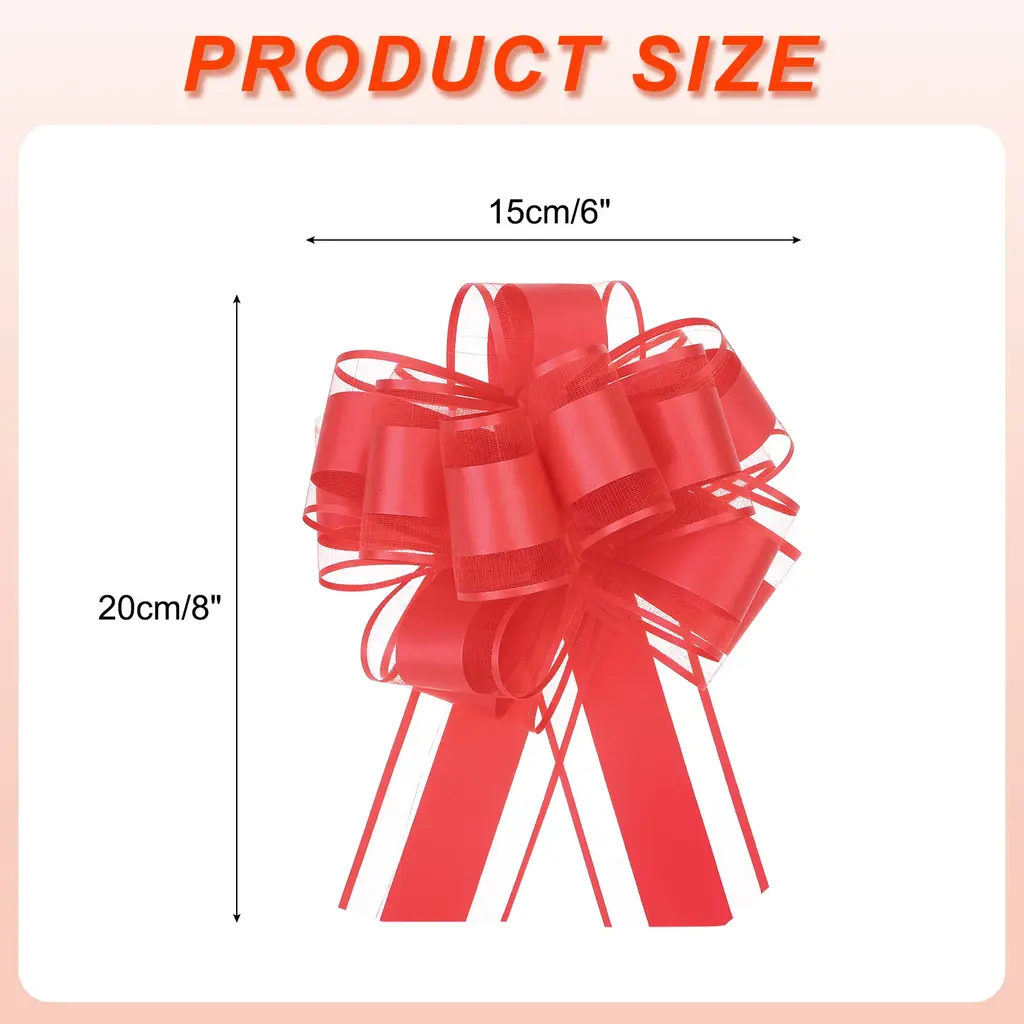 What is this?Iridescent bright colored organza pull bows with ribbons are suitable for wedding car decoration bows, gift wrapping bows, large present decorating bows, DIY crafts handicraft decoration, gift wrapping packaging, holiday decoration, wedding gift baskets decoration, flower design, party decoration, floral bouquet ribbon, scrapbooking, and can be used to decorate Valentine's Day, Christmas, Halloween, Thanksgiving, Teacher's Day, etc.What will I get?Gift wrapping bows, are in size of :15cm/6 inch width, 20cm/8 inch heightIn the package of: 5pcs x Gift wrapping bowsIs there any advantages of the product?Extra large glitter pull Bow, bright color, beautiful, which plays a good decorative role, especially suitable for holiday, wedding and party decoration, as ribbons and bows for gift wrapping; Sparkling gift big bows for presents, beautiful and elegant, soft, comfortable to the touch, and durableHow to use it?Steps of installation: 1. Select gift wrapping bows with appropriate specification; 2. For gift wrapping, holiday decorationWhat should I notice?Please pay attention to select the gift wrapping bows with suitable specifications