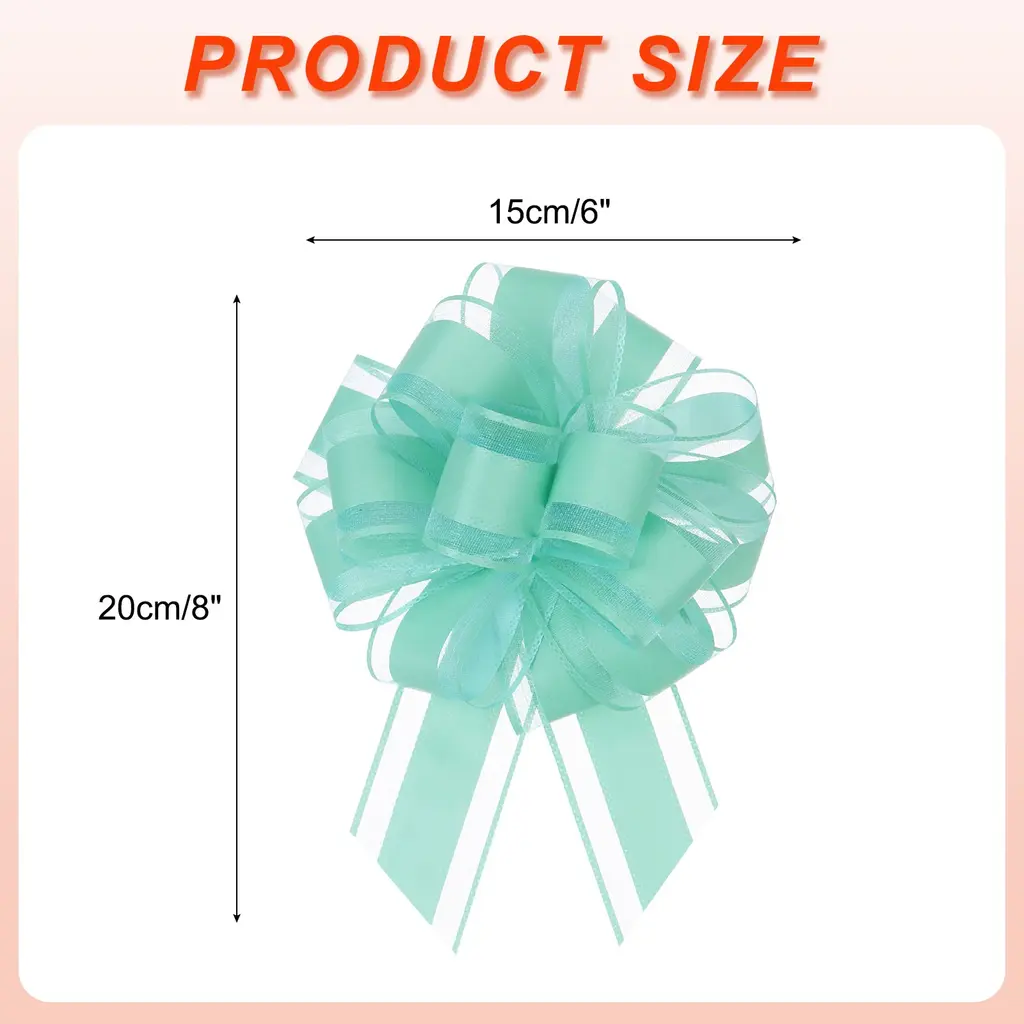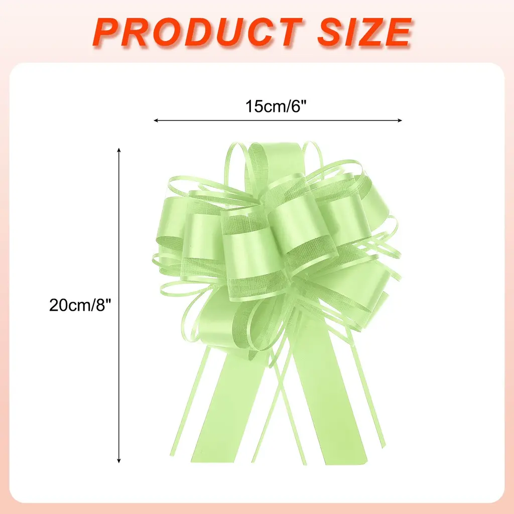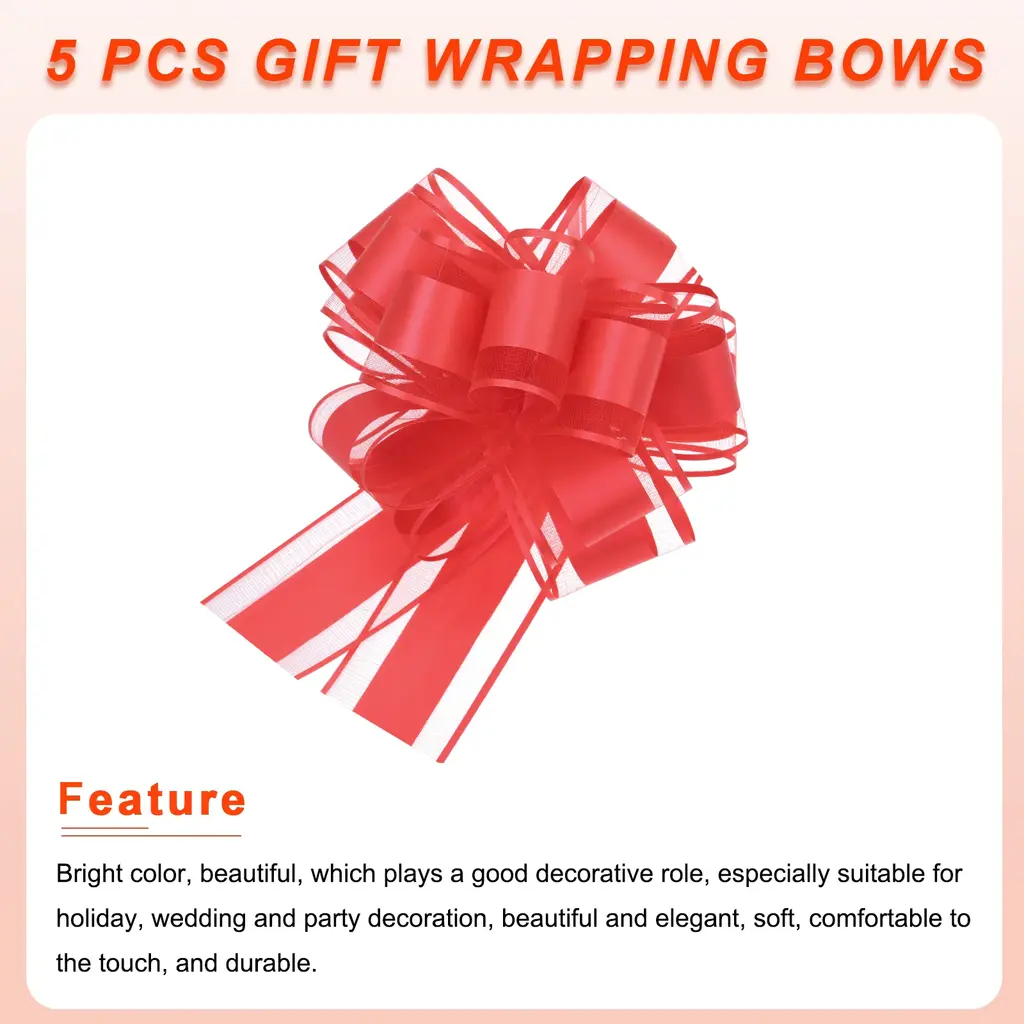 What is this?Iridescent bright colored organza pull bows with ribbons are suitable for wedding car decoration bows, gift wrapping bows, large present decorating bows, DIY crafts handicraft decoration, gift wrapping packaging, holiday decoration, wedding gift baskets decoration, flower design, party decoration, floral bouquet ribbon, scrapbooking, and can be used to decorate Valentine's Day, Christmas, Halloween, Thanksgiving, Teacher's Day, etc.What will I get?Gift wrapping bows, are in size of :15cm/6 inch width, 20cm/8 inch heightIn the package of: 5pcs x Gift wrapping bowsIs there any advantages of the product?Extra large glitter pull Bow, bright color, beautiful, which plays a good decorative role, especially suitable for holiday, wedding and party decoration, as ribbons and bows for gift wrapping; Sparkling gift big bows for presents, beautiful and elegant, soft, comfortable to the touch, and durableHow to use it?Steps of installation: 1. Select gift wrapping bows with appropriate specification; 2. For gift wrapping, holiday decorationWhat should I notice?Please pay attention to select the gift wrapping bows with suitable specifications