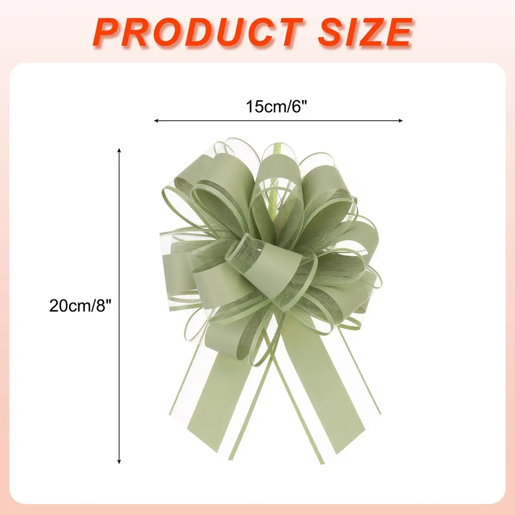 What is this?Iridescent bright colored organza pull bows with ribbons are suitable for wedding car decoration bows, gift wrapping bows, large present decorating bows, DIY crafts handicraft decoration, gift wrapping packaging, holiday decoration, wedding gift baskets decoration, flower design, party decoration, floral bouquet ribbon, scrapbooking, and can be used to decorate Valentine's Day, Christmas, Halloween, Thanksgiving, Teacher's Day, etc.What will I get?Gift wrapping bows, are in size of :15cm/6 inch width, 20cm/8 inch heightIn the package of: 5pcs x Gift wrapping bowsIs there any advantages of the product?Extra large glitter pull Bow, bright color, beautiful, which plays a good decorative role, especially suitable for holiday, wedding and party decoration, as ribbons and bows for gift wrapping; Sparkling gift big bows for presents, beautiful and elegant, soft, comfortable to the touch, and durableHow to use it?Steps of installation: 1. Select gift wrapping bows with appropriate specification; 2. For gift wrapping, holiday decorationWhat should I notice?Please pay attention to select the gift wrapping bows with suitable specifications