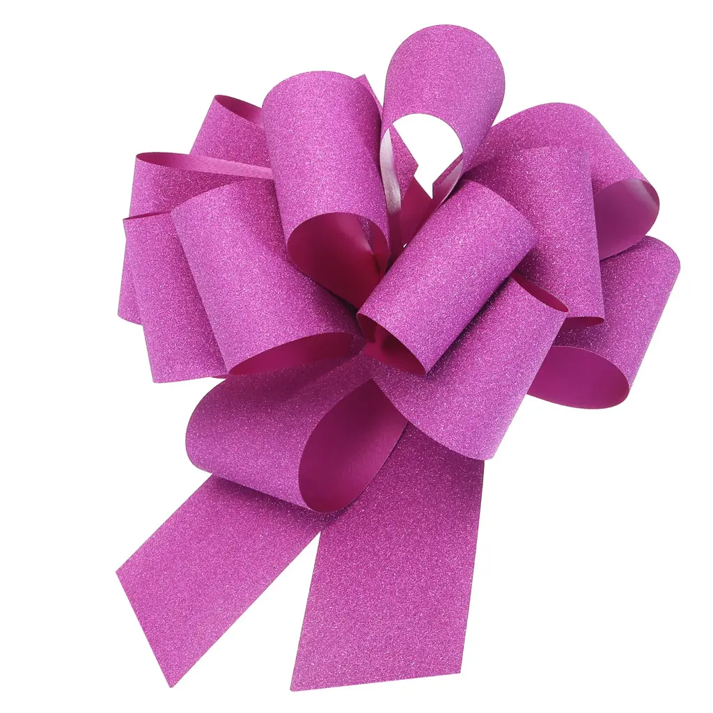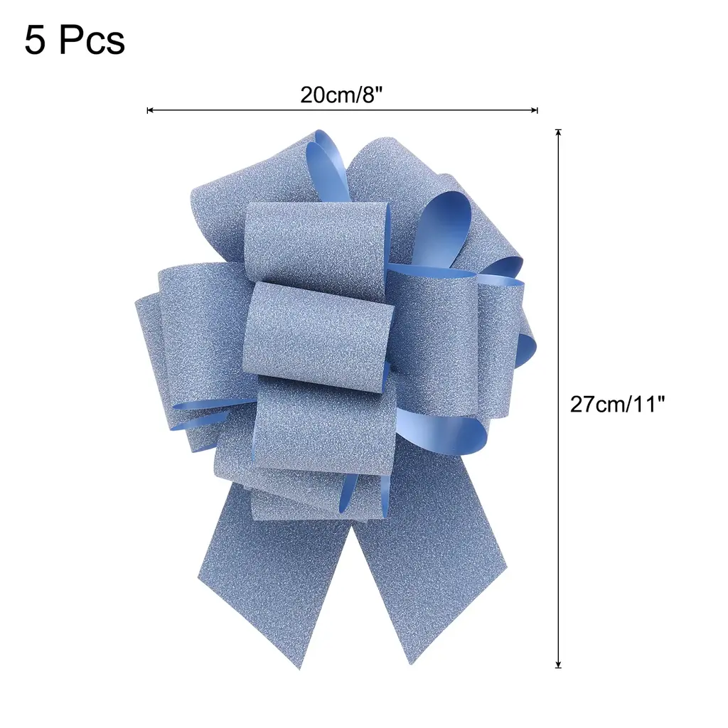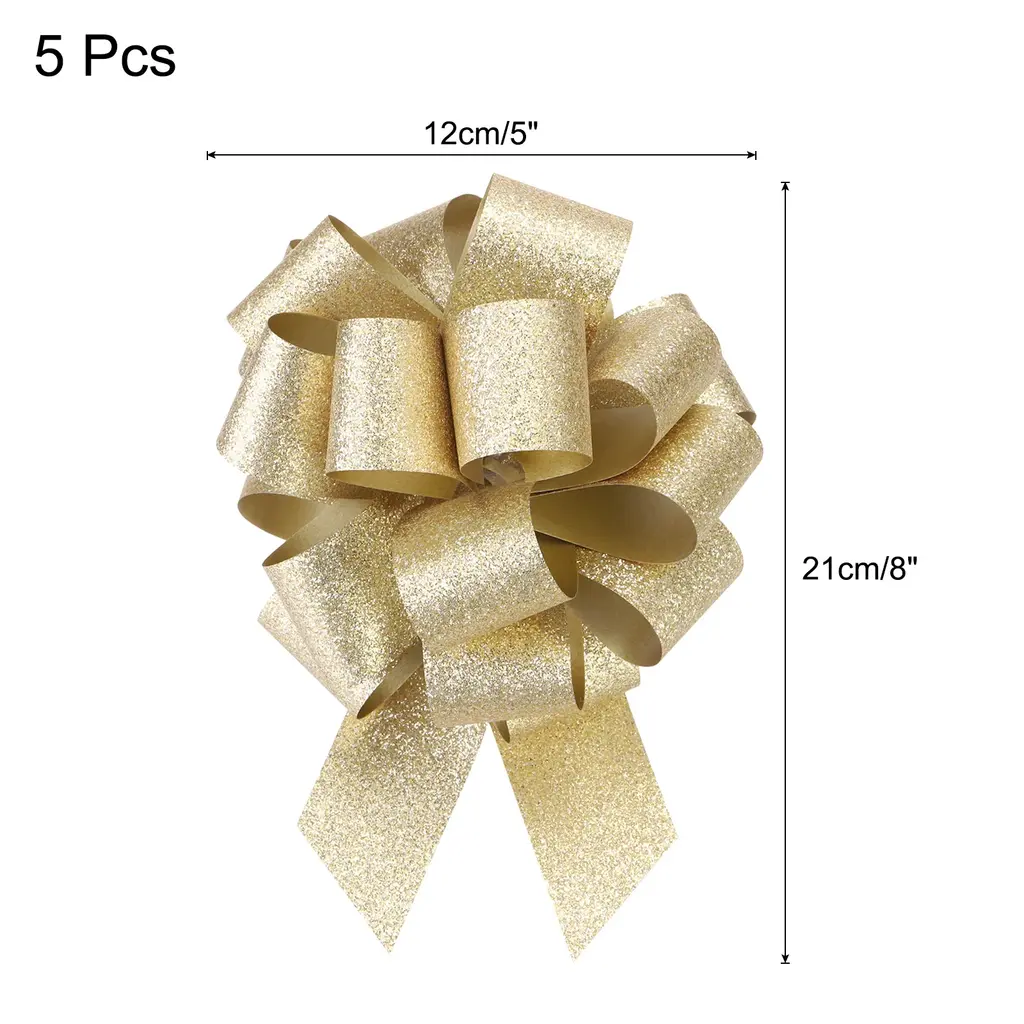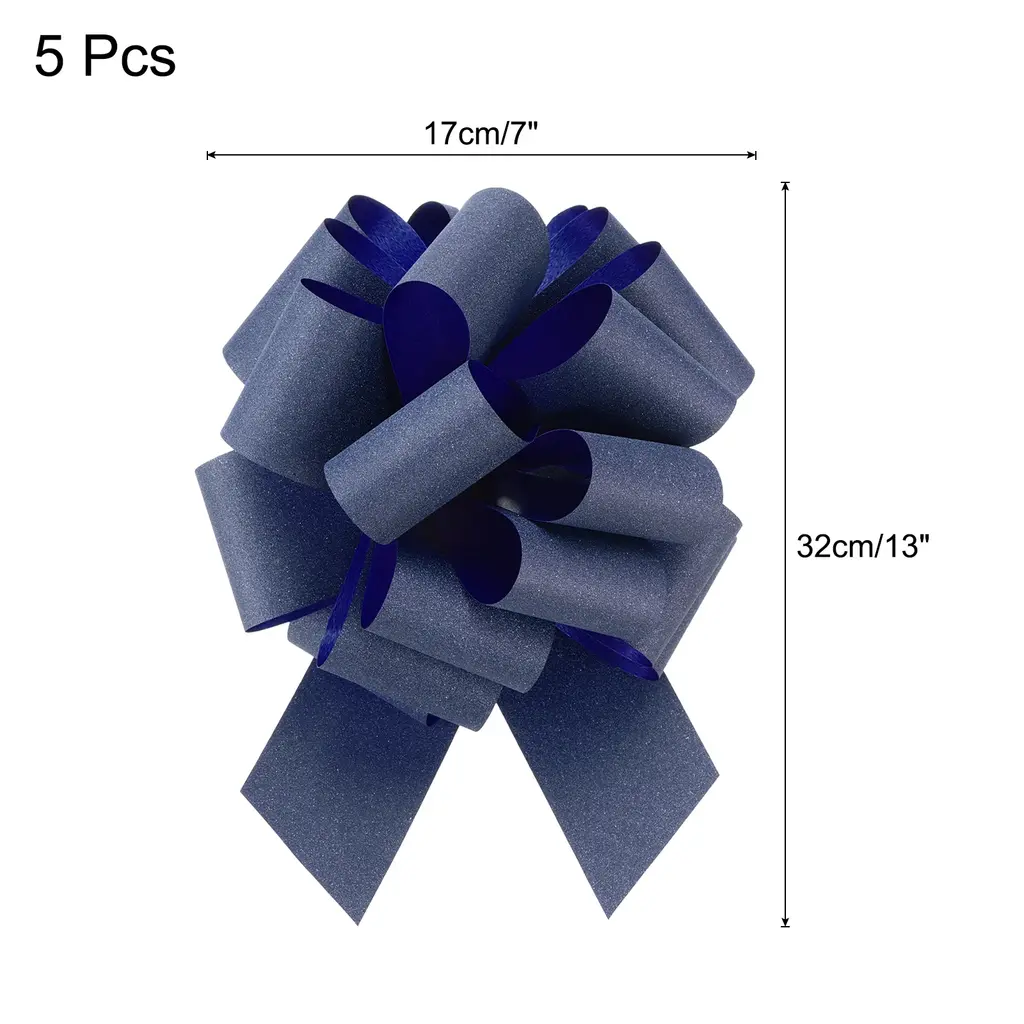 What is this?Personalized sparkly bling bright colored big pull bows with ribbons are suitable for gift wrapping bows, car decoration pull bows, present decorating bows, DIY crafts handicraft decoration, gift wrapping packaging, holiday decoration, wedding gift baskets decoration, flower design, party decoration, floral bouquet ribbon, scrapbooking, and can be used to decorate Christmas, Halloween, Thanksgiving, Teacher's Day, etc.What will I get?Gift wrapping bows, are in size of : 17cm x 32cm/7-inch x 13-inch(W*L)In the package of: 5pcs x Gift wrapping bowsIs there any advantages of the product?Bright color, beautiful, which plays a good decorative role, especially suitable for holiday, wedding and party decoration; Beautiful and elegant, soft, comfortable to the touch, and durableHow to use it?Steps of installation: 1. Select gift wrapping bows with appropriate specification; 2. For gift wrapping, holiday decorationWhat should I notice?Please pay attention to select the gift wrapping bows with suitable specifications