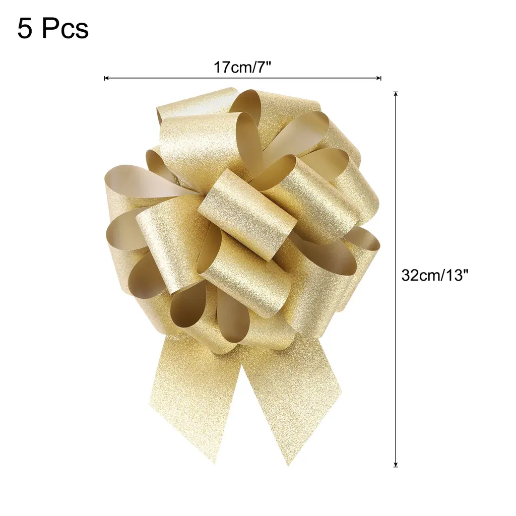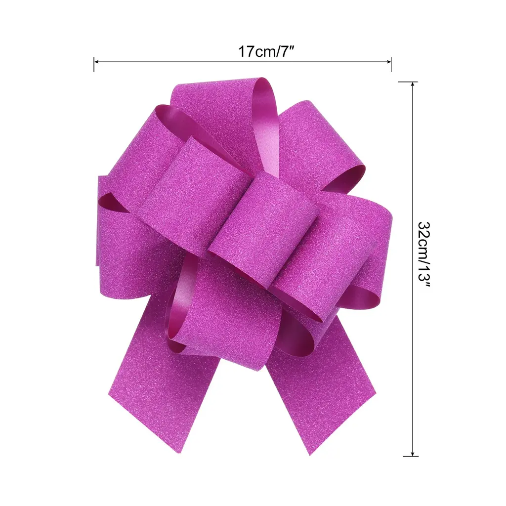 What is this?Personalized sparkly bling bright colored big pull bows with ribbons are suitable for gift wrapping bows, car decoration pull bows, present decorating bows, DIY crafts handicraft decoration, gift wrapping packaging, holiday decoration, wedding gift baskets decoration, flower design, party decoration, floral bouquet ribbon, scrapbooking, and can be used to decorate Christmas, Halloween, Thanksgiving, Teacher's Day, etc.What will I get?Gift wrapping bows, are in size of : 17cm x 32cm/7-inch x 13-inch(W*L)In the package of: 5pcs x Gift wrapping bowsIs there any advantages of the product?Bright color, beautiful, which plays a good decorative role, especially suitable for holiday, wedding and party decoration; Beautiful and elegant, soft, comfortable to the touch, and durableHow to use it?Steps of installation: 1. Select gift wrapping bows with appropriate specification; 2. For gift wrapping, holiday decorationWhat should I notice?Please pay attention to select the gift wrapping bows with suitable specifications