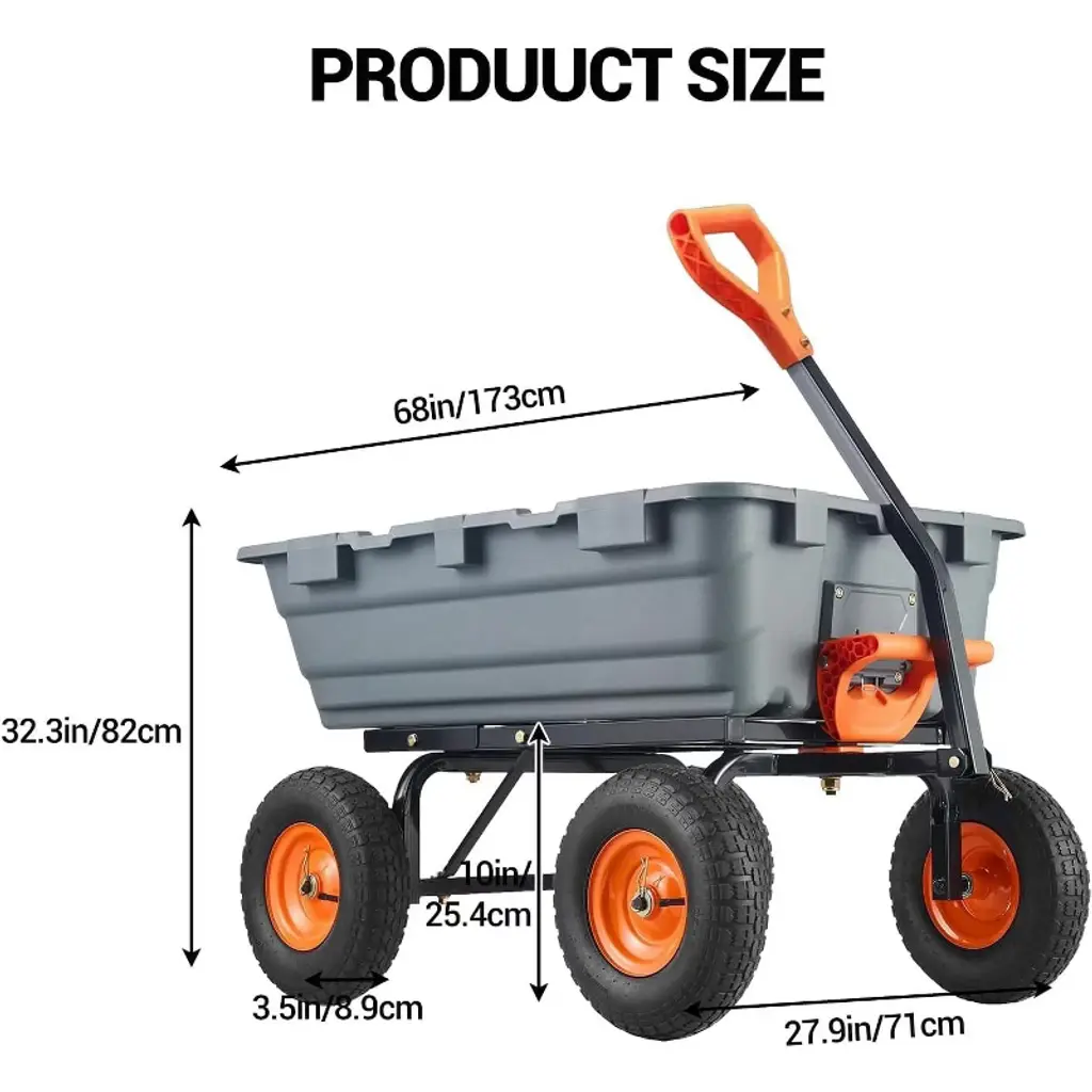 Quick Release Dump: Our unique quick release dump system lets you unload your cargo with ease, while the compact and flexible steering allows you to maneuver easily over different terrains Maintenance-Free Tires: 10-inch maintenance-free tires are designed to withstand rough terrain and are sturdy and will not leak Easy Assembly: The durable steel frame of this versatile cart is easy to assemble, while the sturdy polyethylene bucket is easy to clean and rust-resistant Years of Quality and Innovation: Our carts are designed for strength and performance to help you complete any size project and have fun doing it; this yard cart