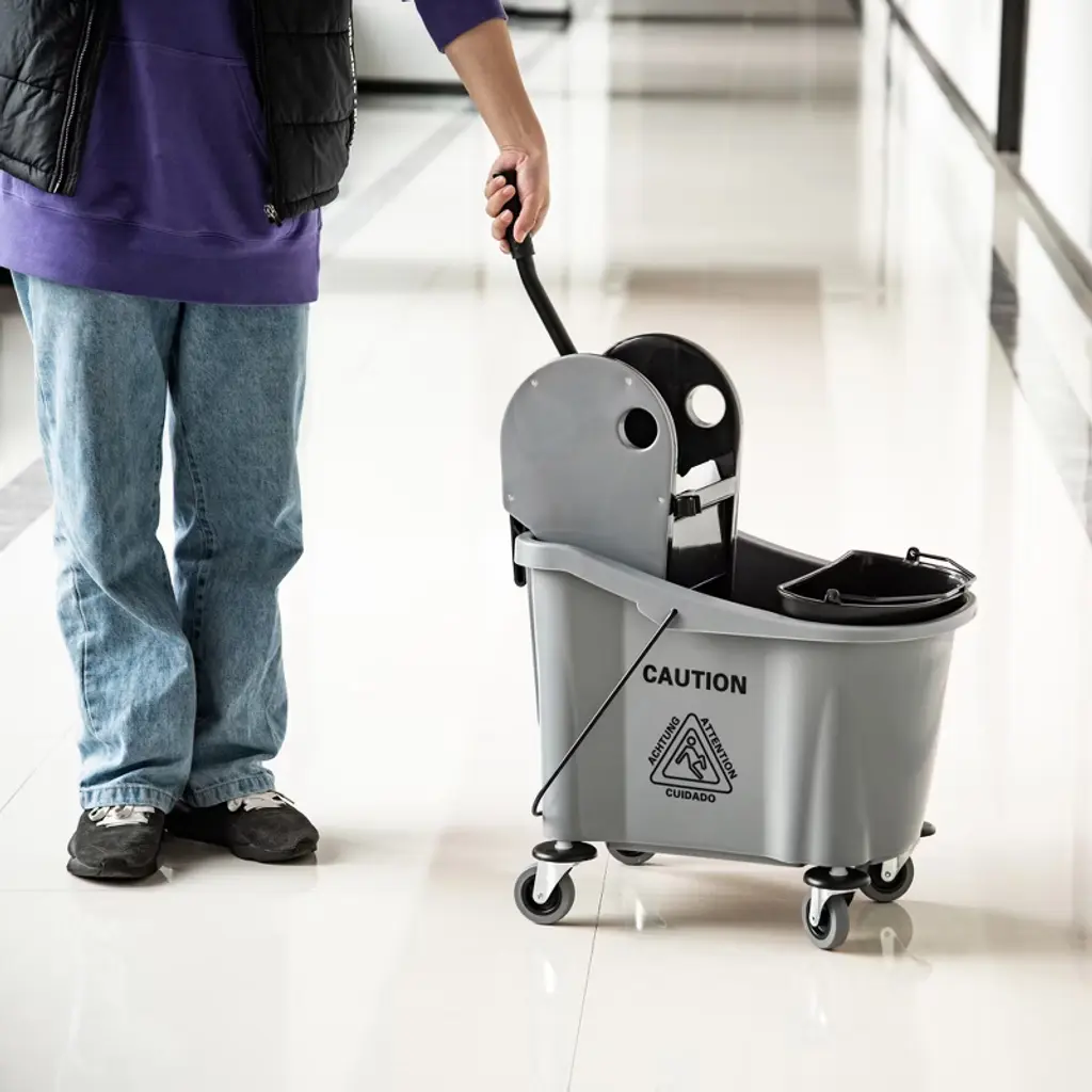 Create a commercial-grade janitorial supplies cleaning solution in your home, work, business, or office with this industrial style mop bucket from HOMCOM. This large capacity mop bucket with wringer and water-separation panel is easy to operate, while the castor wheels make movement easier. The water bucket features a water-separation design to help keep clean and dirty water separate while mopping. Let this cleaning bucket make your life easier.Features:- 9.5-gallon capacity mop bucket for home-grade and commercial-grade cleaning- Removable down press wringer design is easier for the user to operate- Mop-handle holder for mop- Water-separation design keeps clean and dirty water separate- Non-marking casters provide quick and easy mobility- quality, plastic molded body and metal handleNOTE: Mop not included.Specification:- Color: Black, Grey- Material: PP Plastic, Metal (handle)- Max Load: 110 lbs- Capacity: 9.5 gallons(38 quart)- Small Bucket Capacity: 3.2 gallons- Overall Dimension: 21.25" L x 16.25" W x 36" H- Wringer Dimension: 9.75" L x 9.75" W x 22.5" H- Wheel Diameter: 3"- Net Weight: 15 lbsPackage Includes:1 x wringer bucket1 x manual