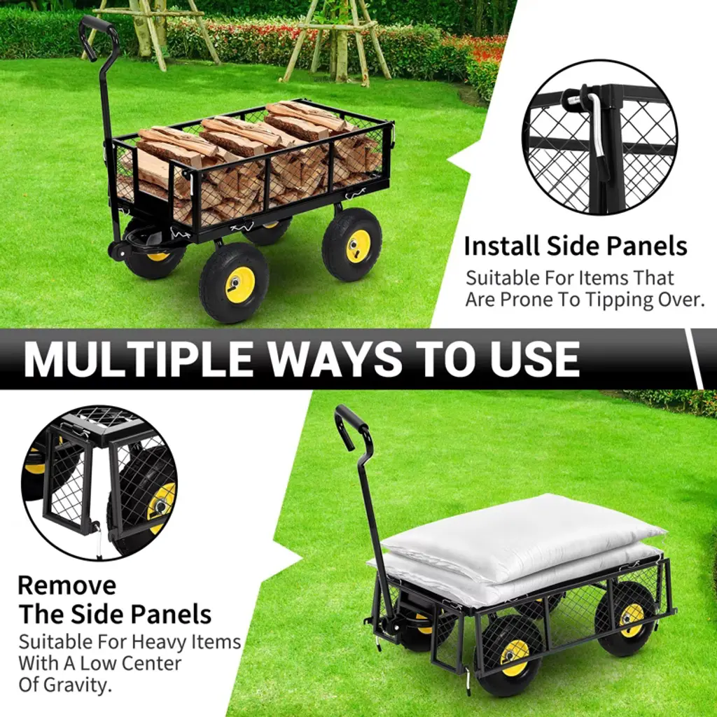 Tackle heavy-duty yard work with this 3-in-1 steel garden cart, built to carry up to 900 lbs with ease. Its removable sides quickly transform it into a flatbed for oversized loads, making it perfect for gardening, landscaping, or farm projects. The 10" pneumatic tires ensure smooth movement across grass, gravel, or dirt, while the 180¡ã swivel handle with rubber grip offers effortless control and comfort. Crafted from all-steel mesh for durability and corrosion resistance, this versatile wagon is built to last through any outdoor task.