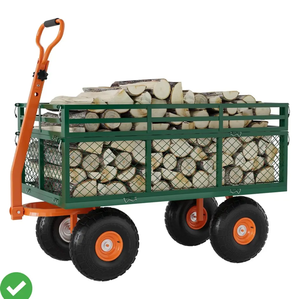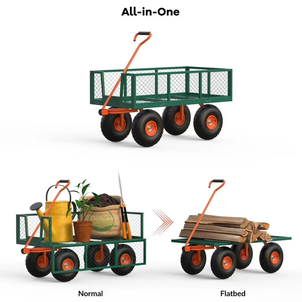 Steel Garden Cart, 3-in-1 Folding Utility Wagon with Removable Sides, 10 inch Tires, 180° Rotating Handle for Outdoor, Farm, Lawn and Garden, Heavy Duty Flatbed, Green & Orange