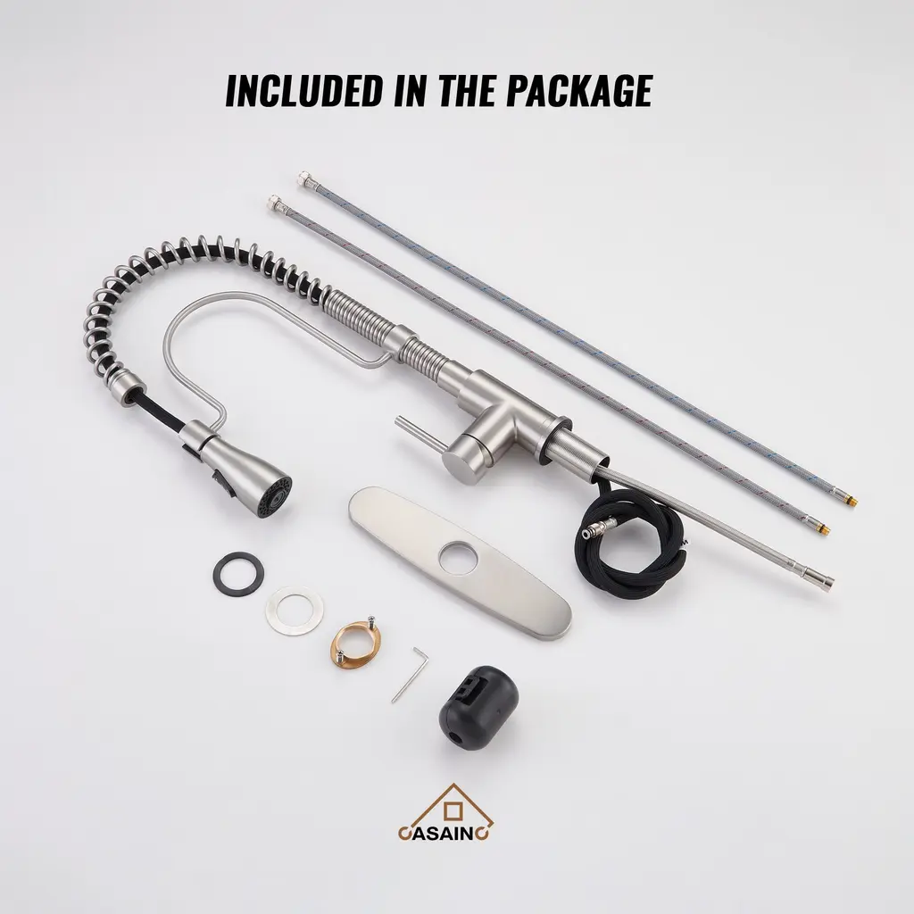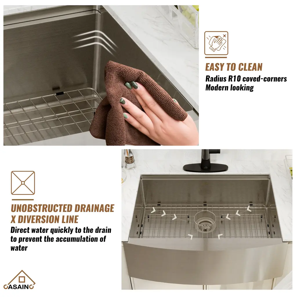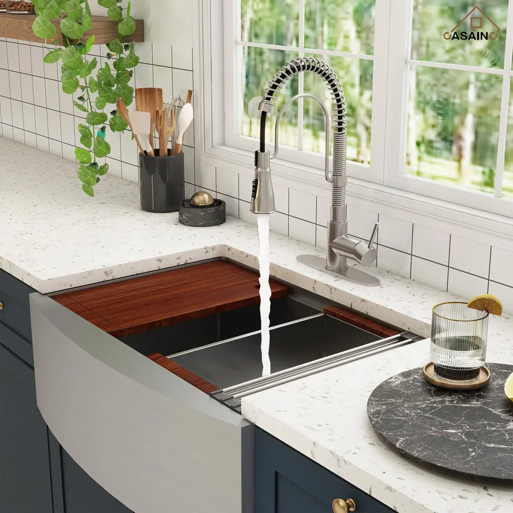 Elevate your kitchen with the CASAINC Kitchen Sink and Faucet Combo, featuring a convenient pull-down sprayer faucet and a sink equipped with a cutting board, colander, roll mat, drainer, and bottom grid - the perfect complement to any kitchen style. Constructed from premium 304 stainless steel, renowned for its corrosion resistance and durability, the sink ensures long-lasting quality. Its 10R round corners facilitate easy cleaning and prevent residue buildup. The classic appeal of the stainless-steel sink, paired with the high-performance faucet, not only enhances your kitchen's aesthetics but also streamlines your culinary tasks, providing an all-in-one solution for your cooking needs.✔The 304 stainless steel, enhanced with a brushed surface treatment, is designed to resist scratches and oil, ensuring durability and longevity✔This farmhouse apron workstation kitchen sink features a unique design that allows the included accessories to slide left and right along a track; it comes with a cutting board, a draining basket, and a rolling drying rack, all designed to glide effortlessly over the counter, making them incredibly convenient to use✔The sink is designed with a scientific X-shaped guideline that ensures effective drainage, preventing water from accumulating inside the sink✔This faucet offers three settings to suit various needs: STREAM for everyday cleaning, SPRAY for splash-free rinsing, and SINGLE BLADE for tackling large areas and tough stains✔The sink faucet features a cUPC-certified ceramic valve core and has undergone extensive testing, ensuring its longevity and durability✔This kitchen sink faucet is both fingerprint-resistant and spot-resistant, making it a breeze to maintain and keep clean✔The kitchen faucets come with an included deck plate, allowing for versatile installation options, whether you prefer a 1 or 3-hole setup