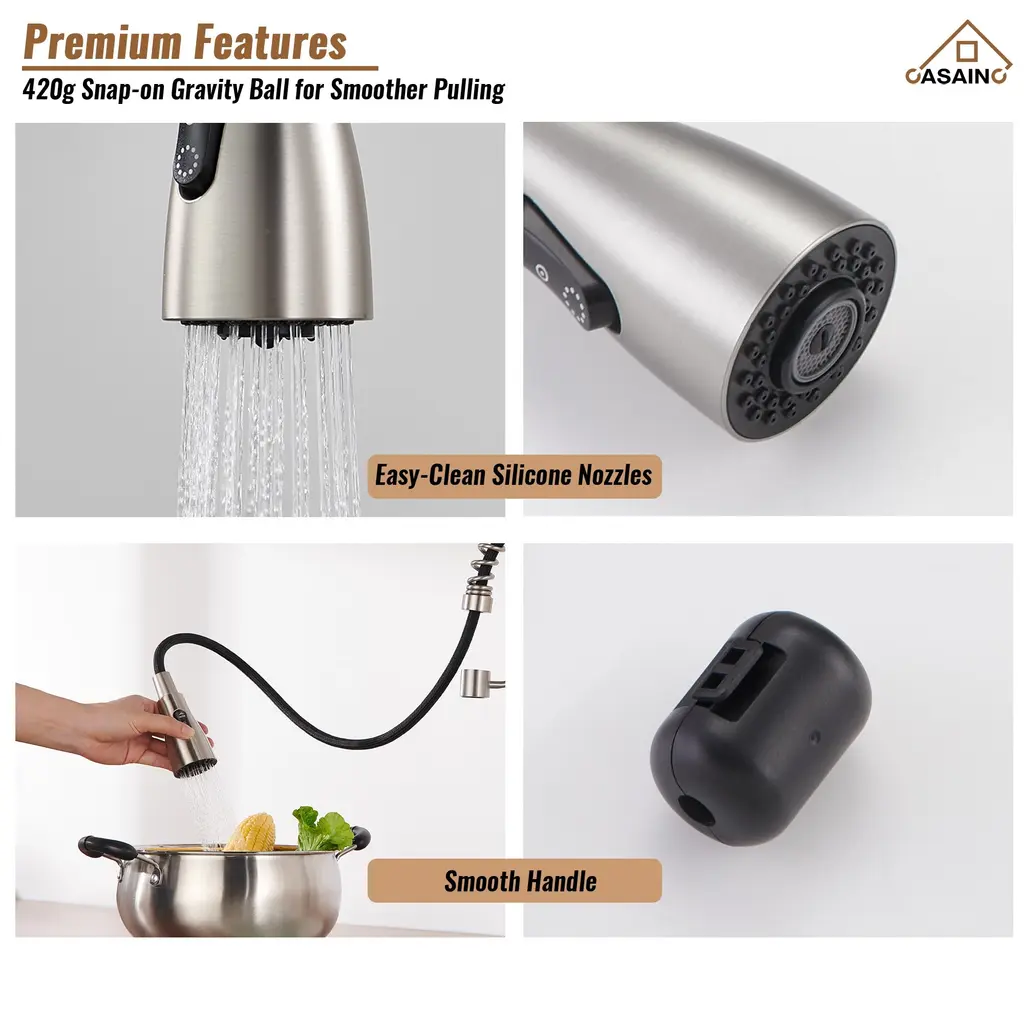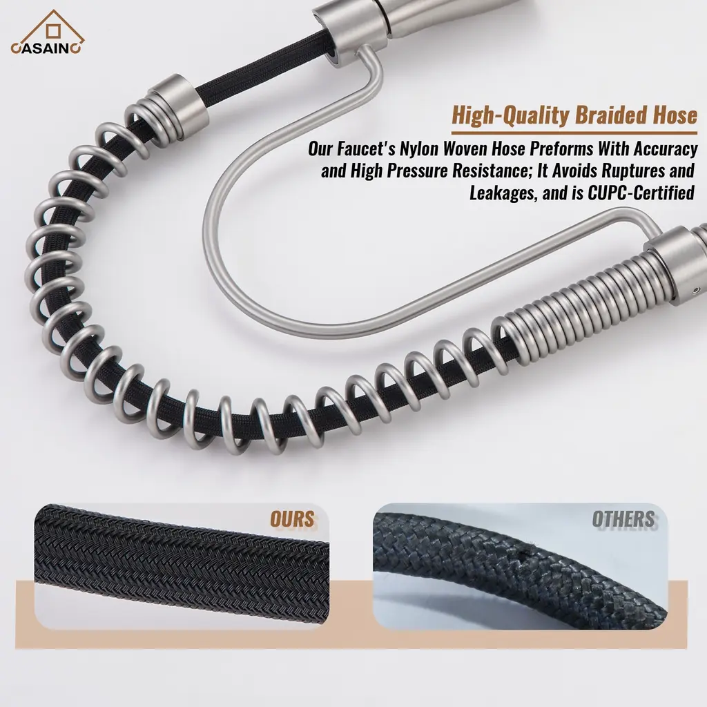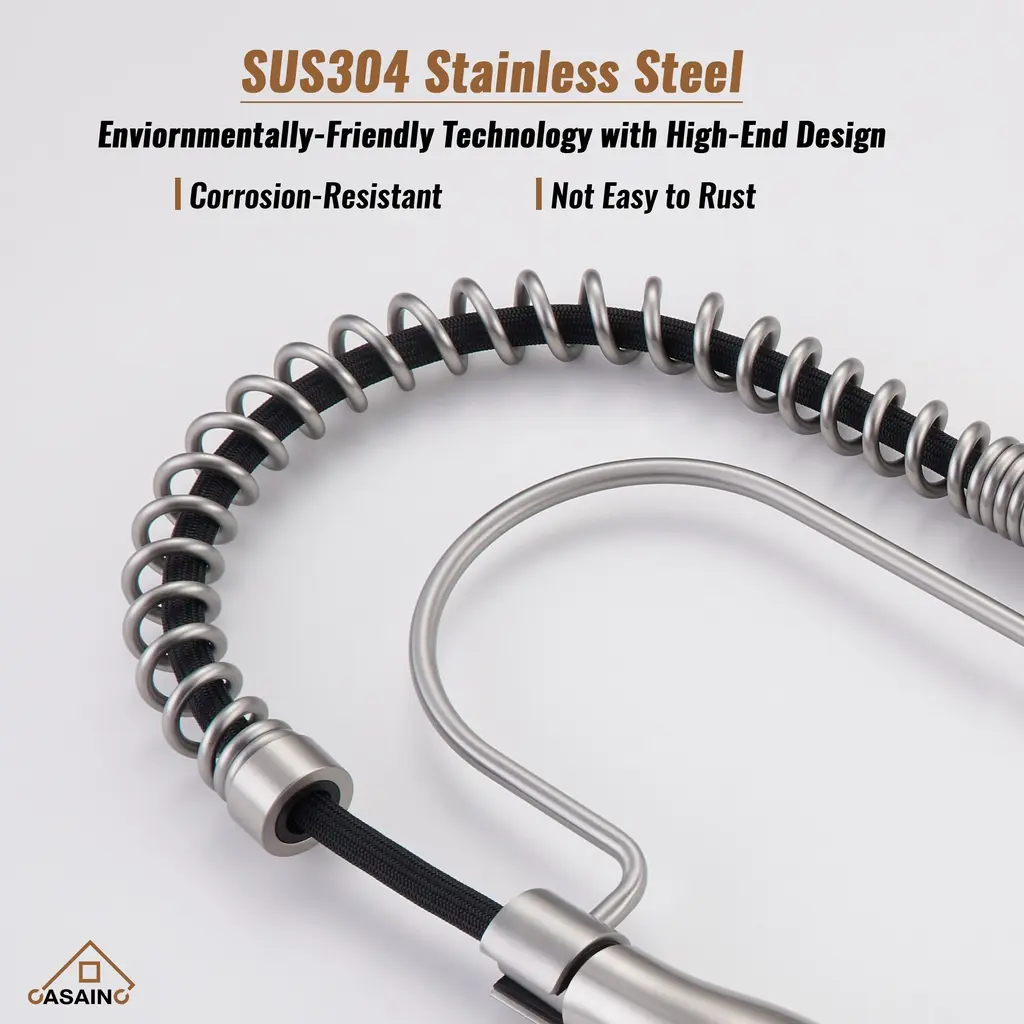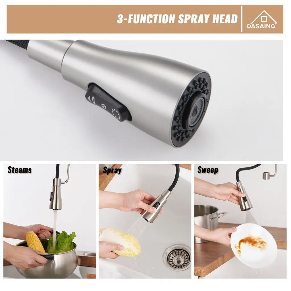 Elevate your kitchen with the CASAINC Kitchen Sink and Faucet Combo, featuring a convenient pull-down sprayer faucet and a sink equipped with a cutting board, colander, roll mat, drainer, and bottom grid - the perfect complement to any kitchen style. Constructed from premium 304 stainless steel, renowned for its corrosion resistance and durability, the sink ensures long-lasting quality. Its 10R round corners facilitate easy cleaning and prevent residue buildup. The classic appeal of the stainless-steel sink, paired with the high-performance faucet, not only enhances your kitchen's aesthetics but also streamlines your culinary tasks, providing an all-in-one solution for your cooking needs.✔The 304 stainless steel, enhanced with a brushed surface treatment, is designed to resist scratches and oil, ensuring durability and longevity✔This farmhouse apron workstation kitchen sink features a unique design that allows the included accessories to slide left and right along a track; it comes with a cutting board, a draining basket, and a rolling drying rack, all designed to glide effortlessly over the counter, making them incredibly convenient to use✔The sink is designed with a scientific X-shaped guideline that ensures effective drainage, preventing water from accumulating inside the sink✔This faucet offers three settings to suit various needs: STREAM for everyday cleaning, SPRAY for splash-free rinsing, and SINGLE BLADE for tackling large areas and tough stains✔The sink faucet features a cUPC-certified ceramic valve core and has undergone extensive testing, ensuring its longevity and durability✔This kitchen sink faucet is both fingerprint-resistant and spot-resistant, making it a breeze to maintain and keep clean✔The kitchen faucets come with an included deck plate, allowing for versatile installation options, whether you prefer a 1 or 3-hole setup