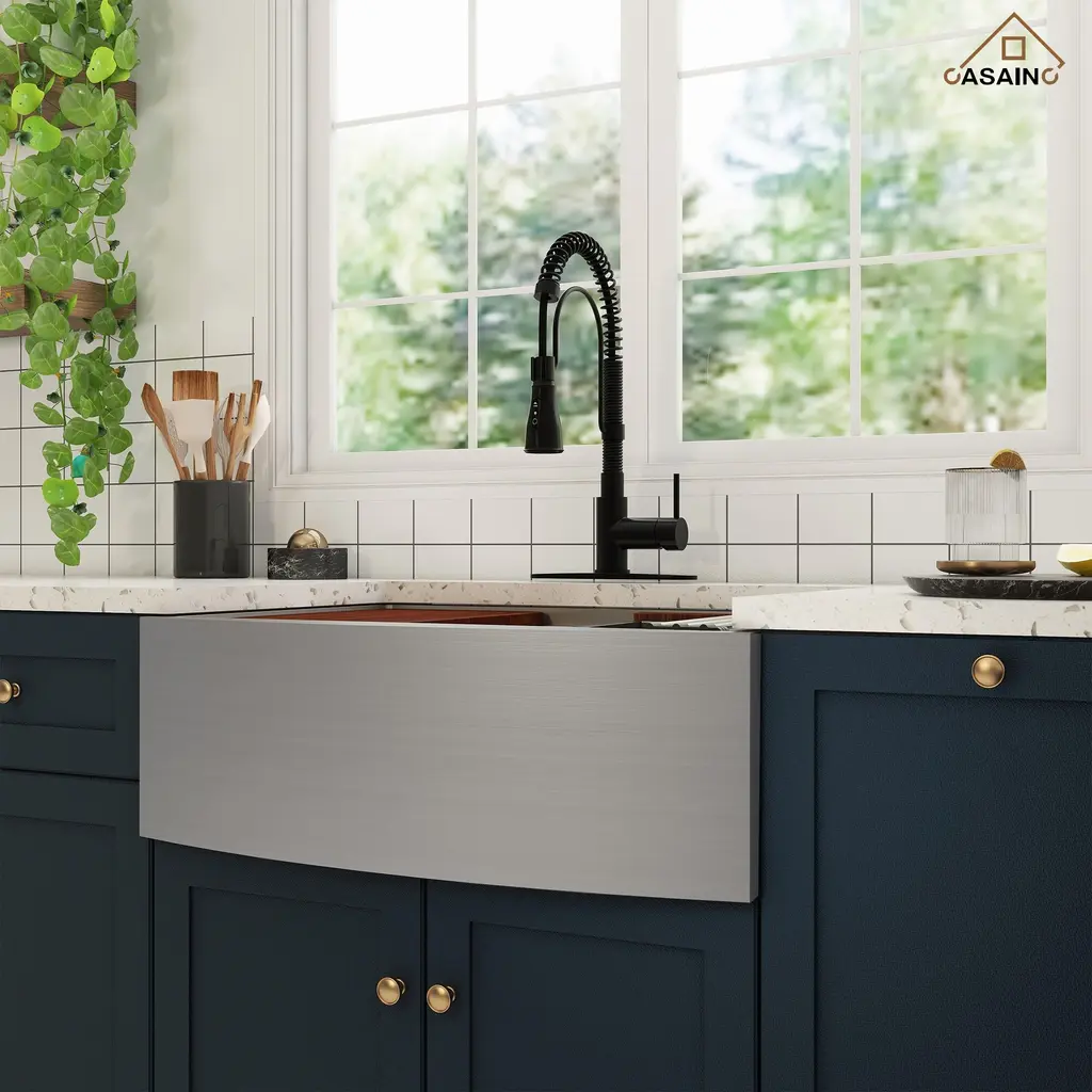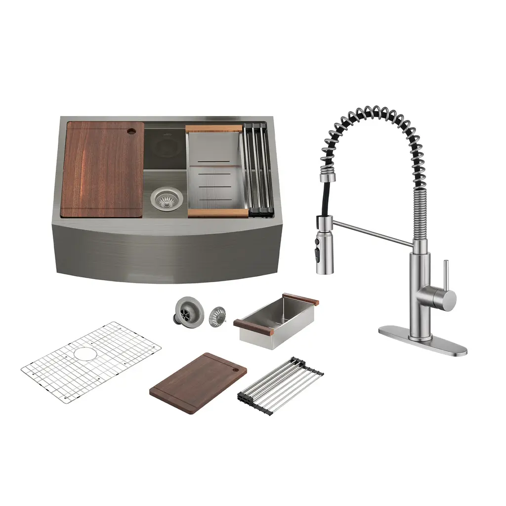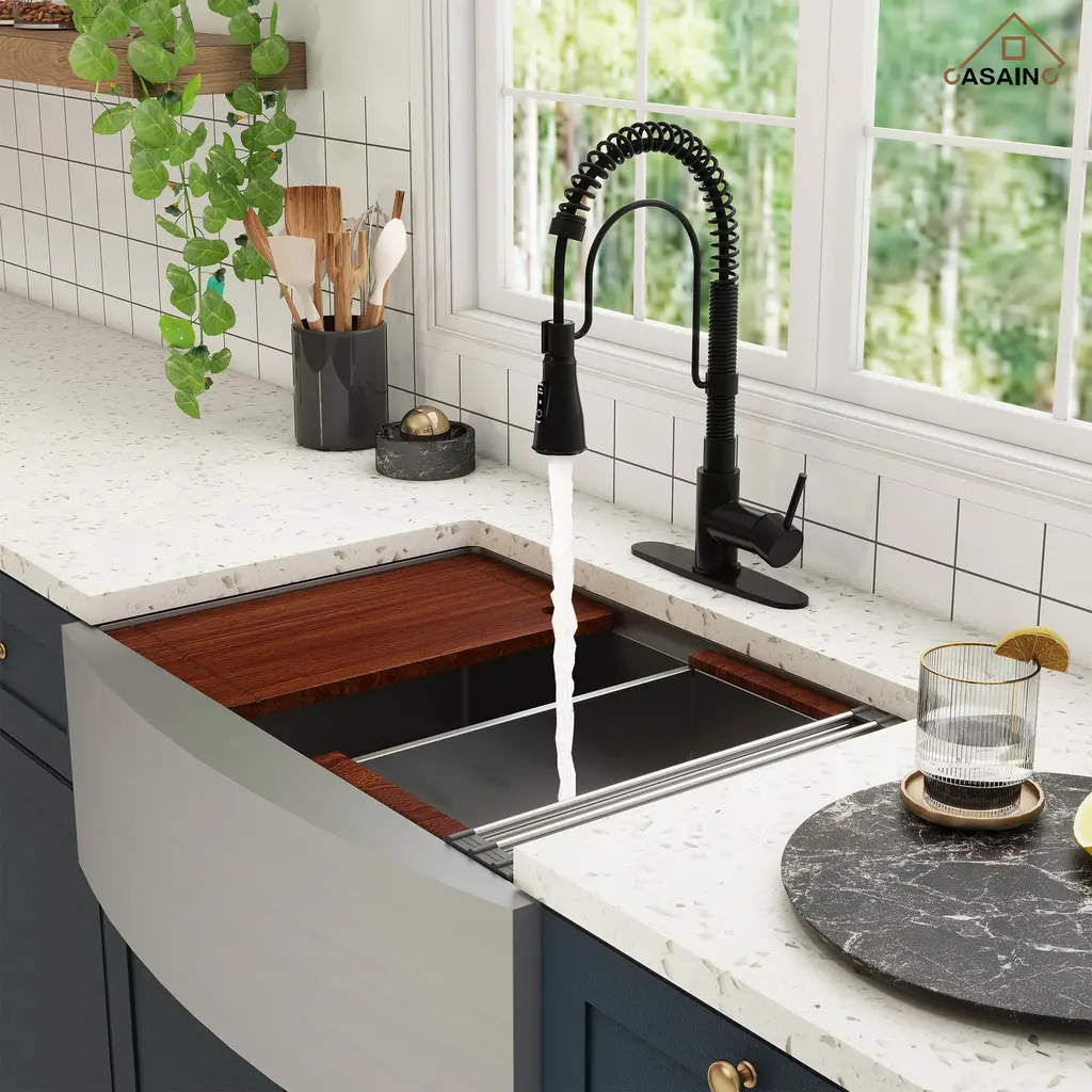 Elevate your kitchen with the CASAINC Kitchen Sink and Faucet Combo, featuring a convenient pull-down sprayer faucet and a sink equipped with a cutting board, colander, roll mat, drainer, and bottom grid - the perfect complement to any kitchen style. Constructed from premium 304 stainless steel, renowned for its corrosion resistance and durability, the sink ensures long-lasting quality. Its 10R round corners facilitate easy cleaning and prevent residue buildup. The classic appeal of the stainless-steel sink, paired with the high-performance faucet, not only enhances your kitchen's aesthetics but also streamlines your culinary tasks, providing an all-in-one solution for your cooking needs.✔The 304 stainless steel, enhanced with a brushed surface treatment, is designed to resist scratches and oil, ensuring durability and longevity✔This farmhouse apron workstation kitchen sink features a unique design that allows the included accessories to slide left and right along a track; it comes with a cutting board, a draining basket, and a rolling drying rack, all designed to glide effortlessly over the counter, making them incredibly convenient to use✔The sink is designed with a scientific X-shaped guideline that ensures effective drainage, preventing water from accumulating inside the sink✔This faucet offers three settings to suit various needs: STREAM for everyday cleaning, SPRAY for splash-free rinsing, and SINGLE BLADE for tackling large areas and tough stains✔The sink faucet features a cUPC-certified ceramic valve core and has undergone extensive testing, ensuring its longevity and durability✔This kitchen sink faucet is both fingerprint-resistant and spot-resistant, making it a breeze to maintain and keep clean✔The kitchen faucets come with an included deck plate, allowing for versatile installation options, whether you prefer a 1 or 3-hole setup