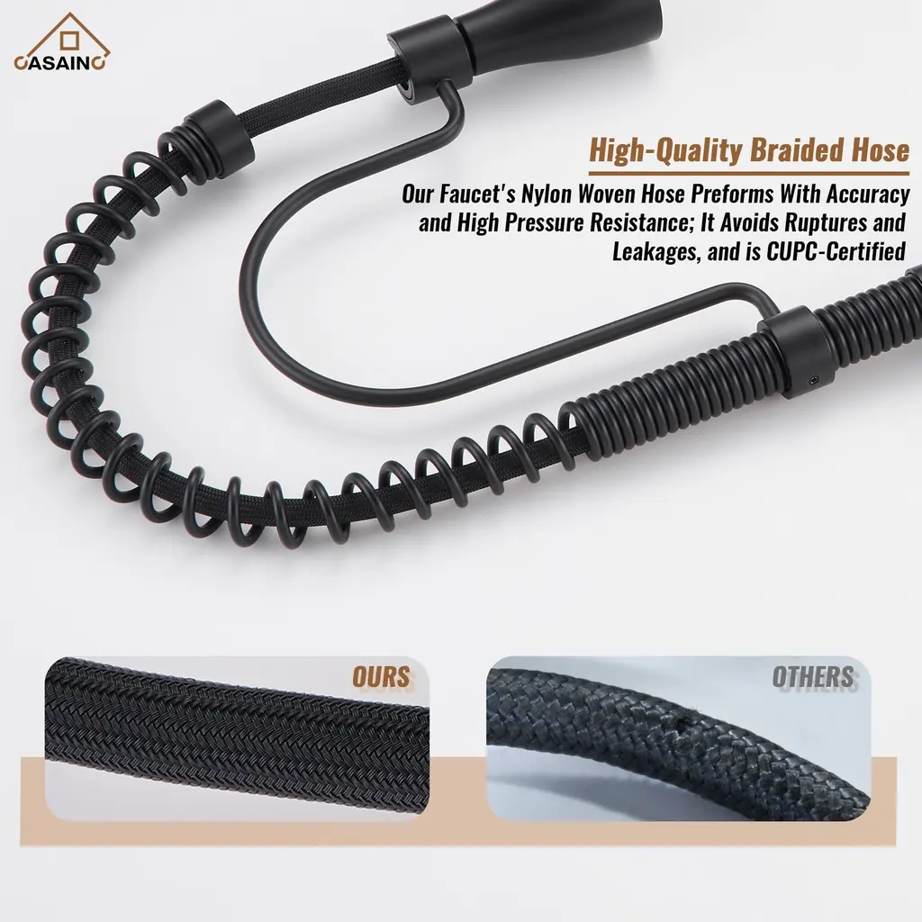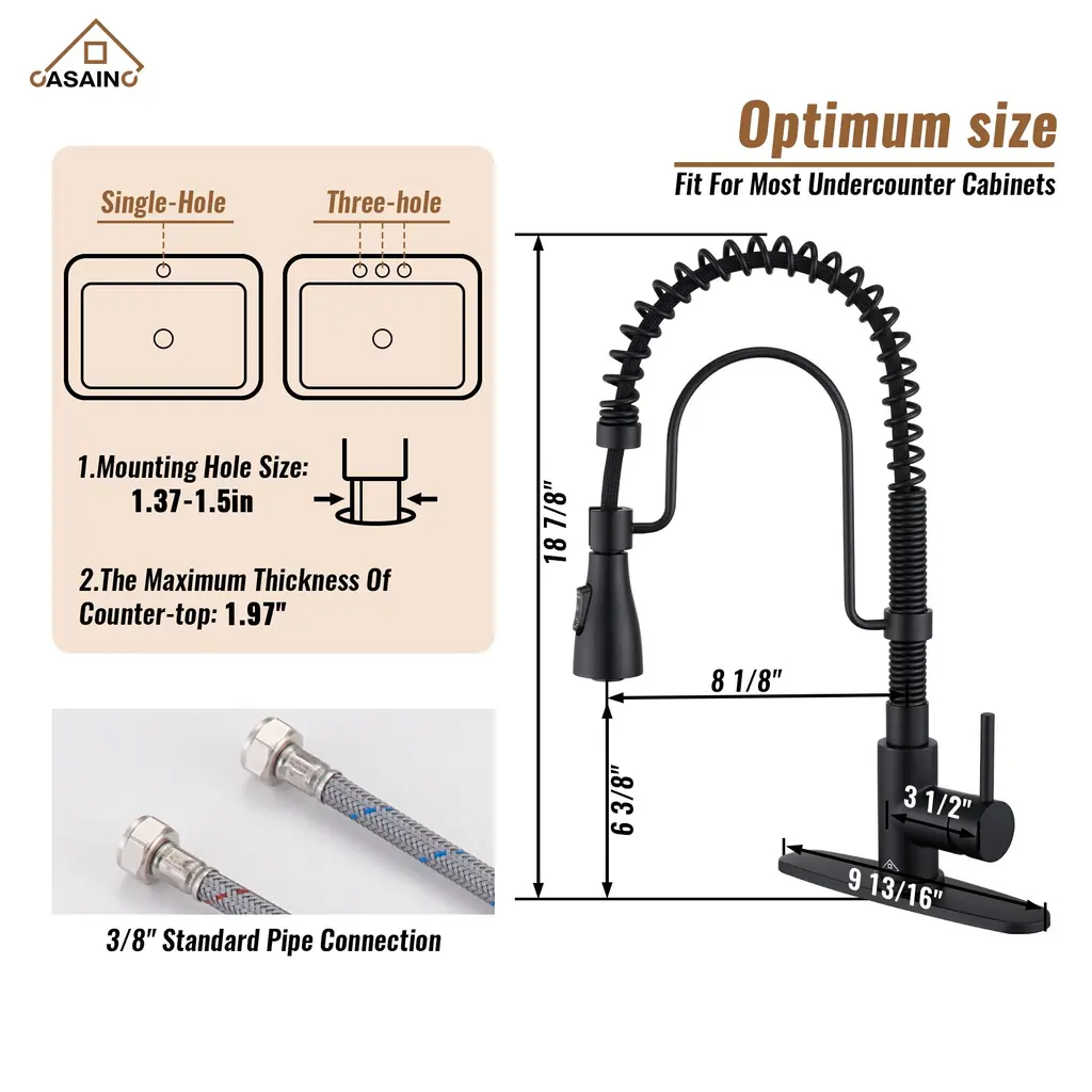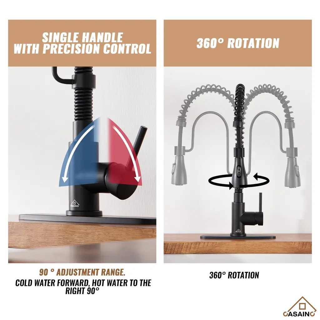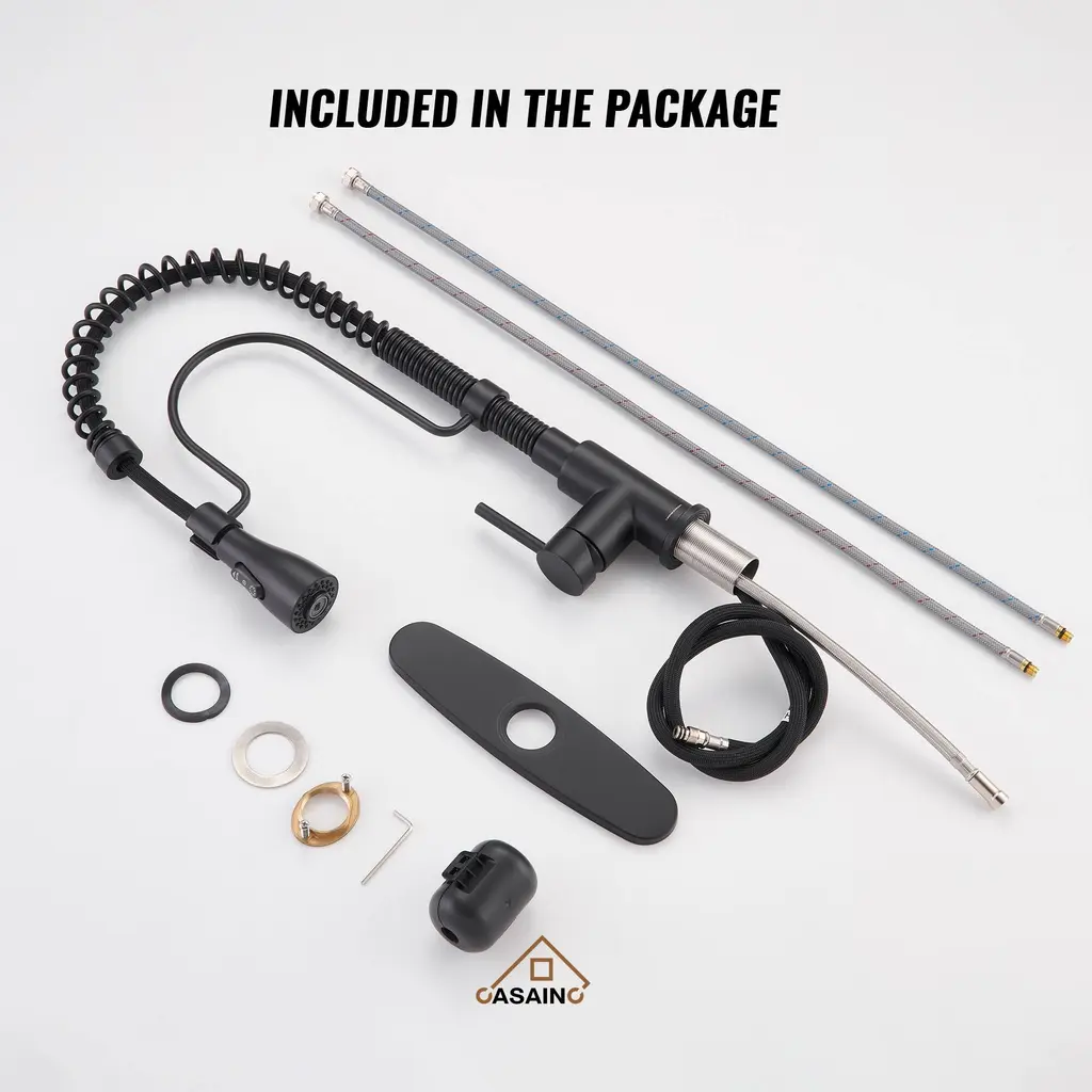 Elevate your kitchen with the CASAINC Kitchen Sink and Faucet Combo, featuring a convenient pull-down sprayer faucet and a sink equipped with a cutting board, colander, roll mat, drainer, and bottom grid - the perfect complement to any kitchen style. Constructed from premium 304 stainless steel, renowned for its corrosion resistance and durability, the sink ensures long-lasting quality. Its 10R round corners facilitate easy cleaning and prevent residue buildup. The classic appeal of the stainless-steel sink, paired with the high-performance faucet, not only enhances your kitchen's aesthetics but also streamlines your culinary tasks, providing an all-in-one solution for your cooking needs.✔The 304 stainless steel, enhanced with a brushed surface treatment, is designed to resist scratches and oil, ensuring durability and longevity✔This farmhouse apron workstation kitchen sink features a unique design that allows the included accessories to slide left and right along a track; it comes with a cutting board, a draining basket, and a rolling drying rack, all designed to glide effortlessly over the counter, making them incredibly convenient to use✔The sink is designed with a scientific X-shaped guideline that ensures effective drainage, preventing water from accumulating inside the sink✔This faucet offers three settings to suit various needs: STREAM for everyday cleaning, SPRAY for splash-free rinsing, and SINGLE BLADE for tackling large areas and tough stains✔The sink faucet features a cUPC-certified ceramic valve core and has undergone extensive testing, ensuring its longevity and durability✔This kitchen sink faucet is both fingerprint-resistant and spot-resistant, making it a breeze to maintain and keep clean✔The kitchen faucets come with an included deck plate, allowing for versatile installation options, whether you prefer a 1 or 3-hole setup