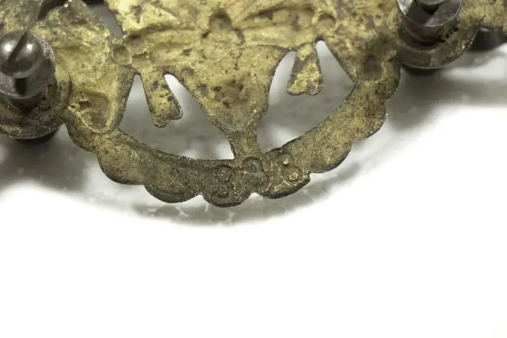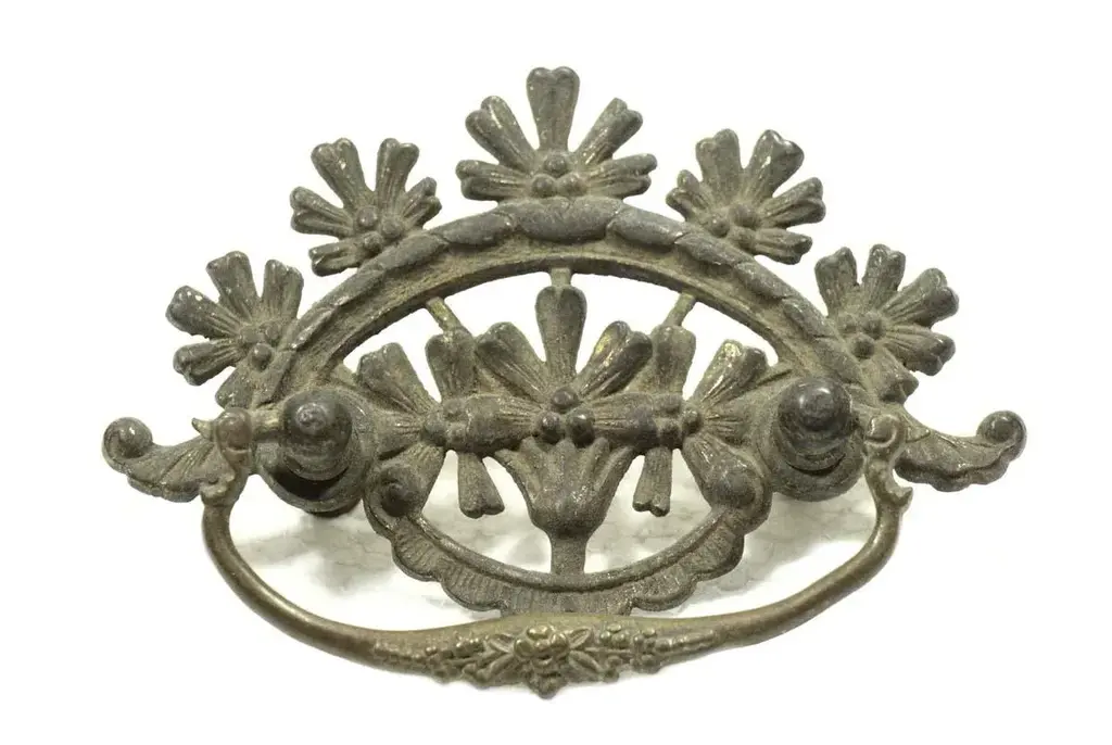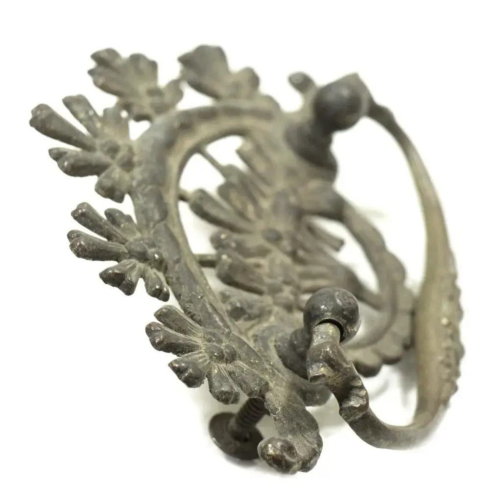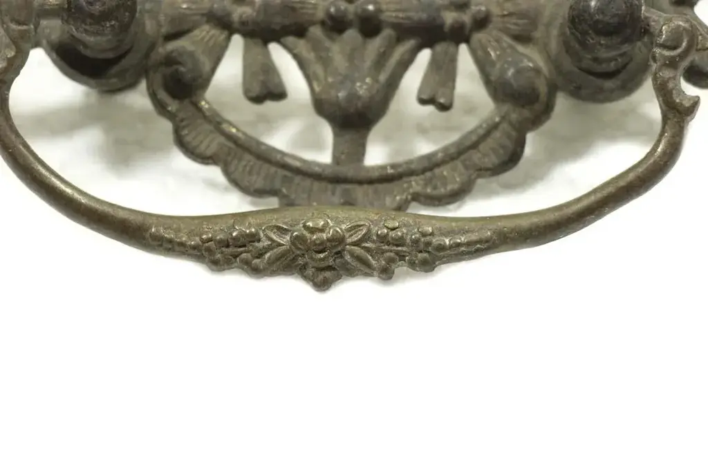 Antique bronze bail pull with an ornate French design. Priced each. The manufacturer and exact date of creation are unknown. The dimensions are 5.75 in. L x 3.875 in. W, center to center 3.125 in..