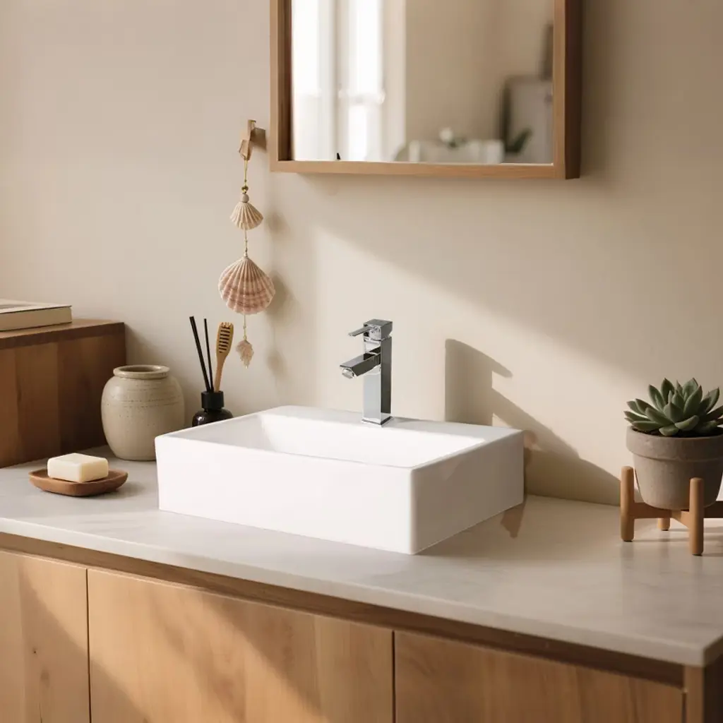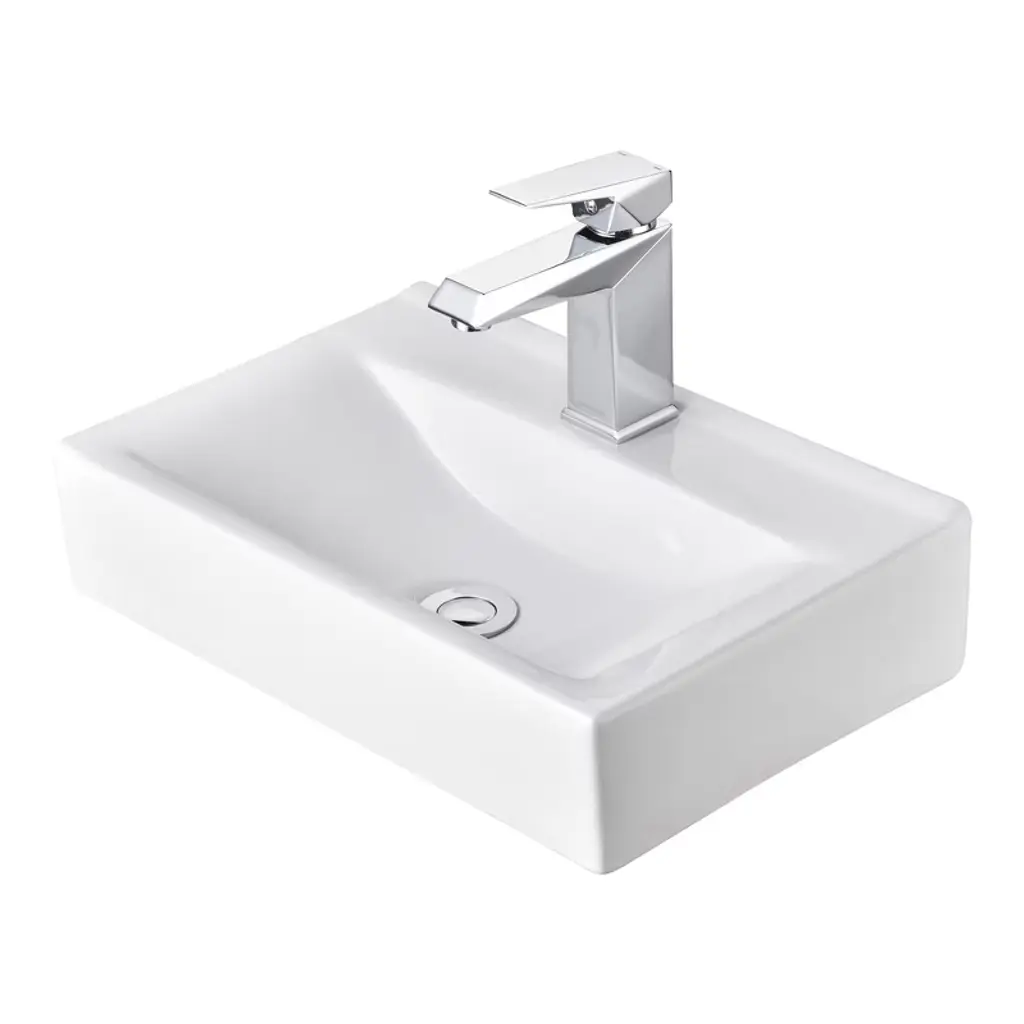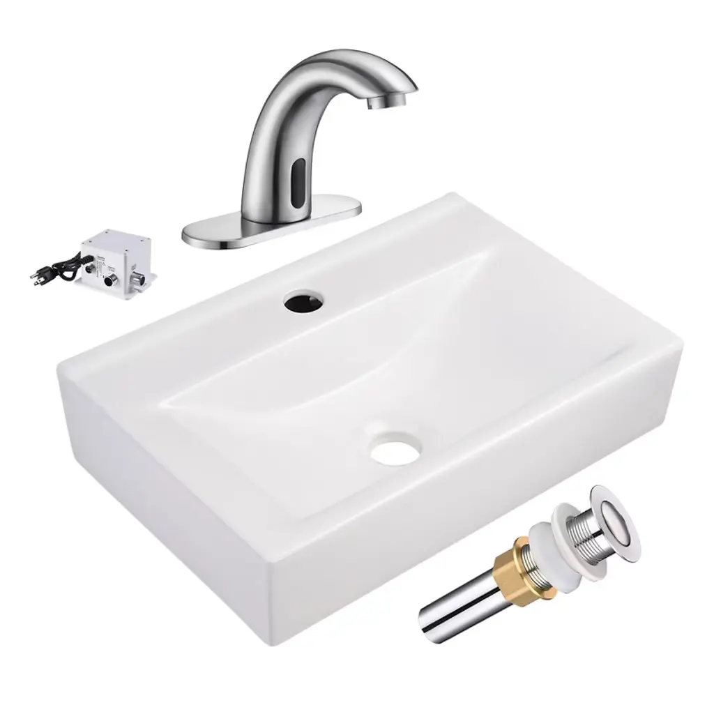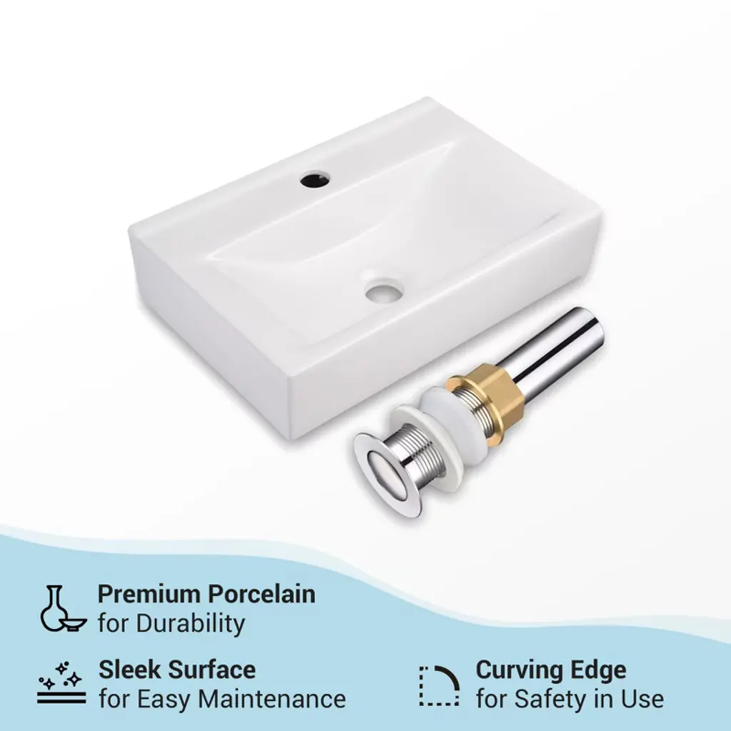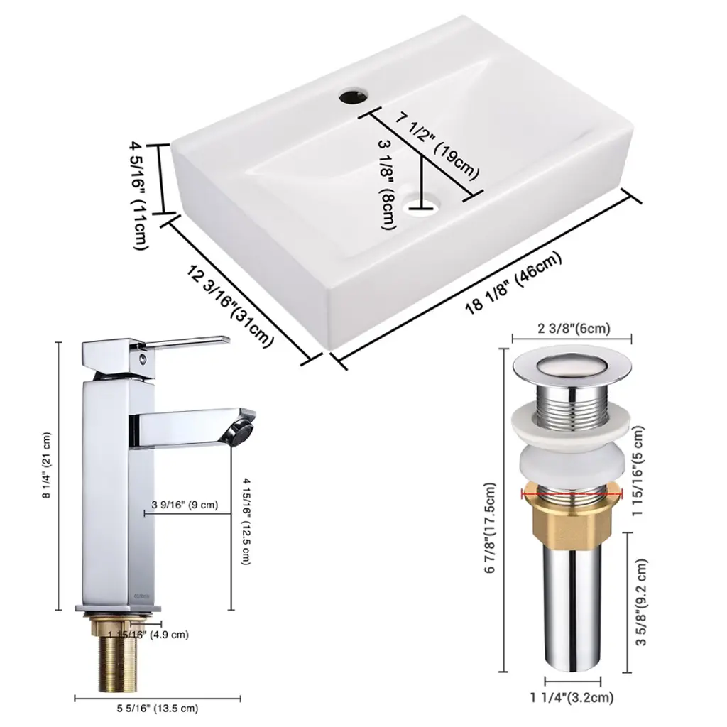Features:- Sink- Compact Design - 18" Rectangle Bathroom Sink with a faucet hole is small-sized, wall & tabletop mountable, making it compact enough to fit in the tightest of spaces and corners and fixable to install, making full use of your limited space- Longtime Use - Carefully crafted with high quality ceramic material with gloss for rust resistance, ease of cleaning and maintenance, ensuring a long lifespan- Customizable Installation - Wall-mountable design allows you to install your sink easily and quickly without replacing the entire vanity, while retaining the versatility and flexibility to cater to users of different heights- Faucet- Aquaterior Simple Designed Single-hole Square faucet with crisp lines, easy to maintain as well as creating a clutter-free bathroom atmosphere- Tool-free Installation within Minutes, features unique Square Nut for fast DIY installation- Upgraded Ceramic Cartridge, supports 500,000 times of opening & closing- Brass Body with Polished Chrome Finish - rust-resistant- Adjustable Water Temperature & Flow Rate (2.2 GPM at 60 PSI max flow rate), easy to operate with Single Lever for effortless flow and precise temperature control as season changes- CUPC & NSF certificated & 5 years warranty, easy & fast replacement is offered for quality issueSpecifications:- Sink- Overall Dimension(LxWxH) 18 1/8" x 12 3/16" x 4 5/16" (46 x 31 x 11 cm)- Drain Cap Dia. 2 3/8" (6 cm)- Drain Height (when Closed) 6 7/8" (17.5 cm)- Tailpiece Outer Dia. 1 1/4" (3.2 cm)- Net Weight 16.5 Lbs (7.5 kg)- Faucet- Overall Dimension(WxDxH) 8 1/4" x 5 5/16" x 1 15/16" (21 x 13.5 x 4.9 cm)- Spout Height 4 15/16" (12.5 cm)- Spout Reach 3 9/16" (9 cm)- Net Weight 4 Lbs (1.8 kg)Package Contents:- 1x Porcelain Sink- 1x Faucet- 2x Hot & Cold Water Hoses- 1x Drain- 2x Manuals