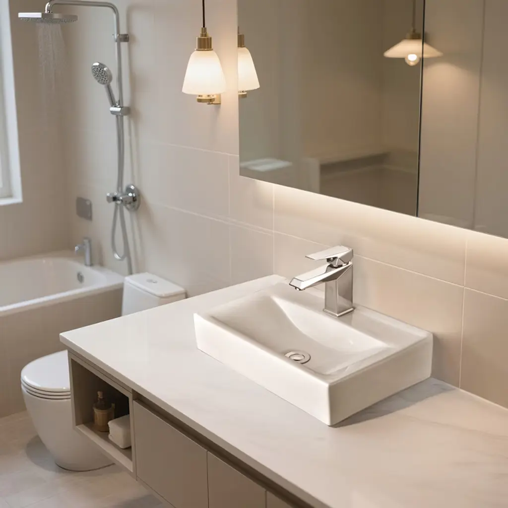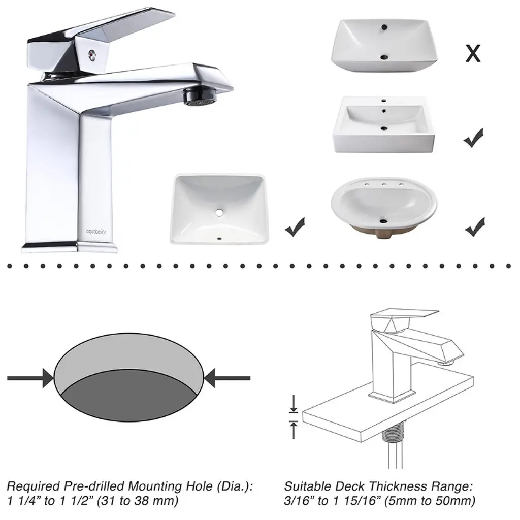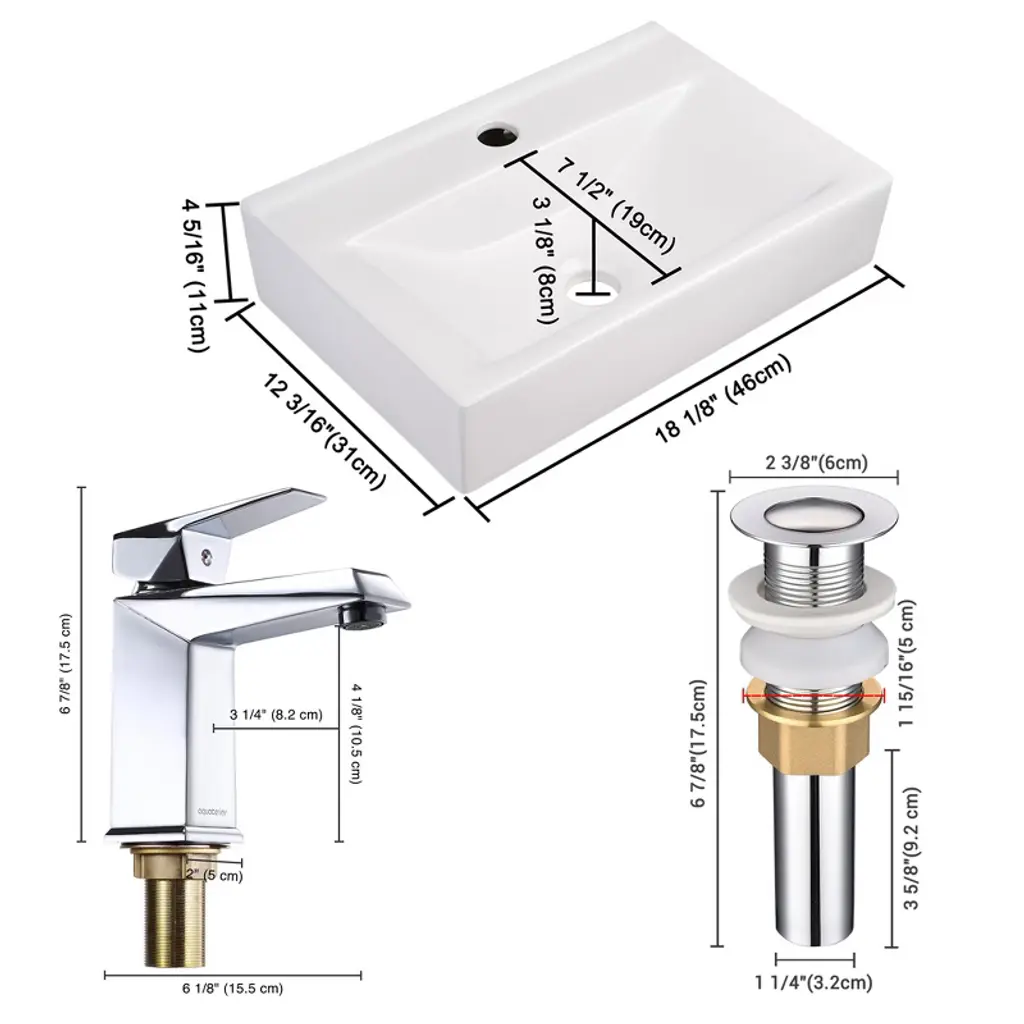 Features:- Sink- Compact Design - 18" Rectangle Bathroom Sink with a faucet hole is small-sized, wall & tabletop mountable, making it compact enough to fit in the tightest of spaces and corners and fixable to install, making full use of your limited space- Longtime Use - Carefully crafted with high quality ceramic material with gloss for rust resistance, ease of cleaning and maintenance, ensuring a long lifespan- Faucet- Sleek & Modern Design - Aquaterior Single Hole Square Faucet boasts its classic geometric shape and crisp lines, providing a sleek yet stylish accent to your modern-styled interior decor as well as creating a clutter-free bathroom atmosphere, perfect for hotel, spa, restaurant and more- Durability - Optimized ceramic cartridge structure is strong enough to withstand 500,000 times of opening and closing, effectively preventing leaking or dripping; Solid brass construction provides supreme durability, along with polished chrome finish for rust & corrosion resistance- Single Level Handle - Comes with an easy-to-operate single lever handle, simply lift up the handle to control the water flow volume with a maximum flow rate of 2.2 GPM at 60 PSI, and precisely switch hot or cold water by rotating the handle to left or right side to adjust water temperatureSpecifications:- Sink- Overall Dimension(LxWxH) 18 1/8" x 12 3/16" x 4 5/16" - Drain Cap Dia. 2 3/8" - Drain Height (when Closed) 6 7/8" - Tailpiece Outer Dia. 1 1/4" - Net Weight 16.5 Lbs - Faucet- Overall Dimension(WxDxH) 2" x 6 1/8" x 6 7/8" - Spout Height 4 1/8" - Spout Reach 3 1/4" - Net Weight 3.3 LbsPackage Contents:- 1x Porcelain Sink- 1x Faucet- 1x Drain- 2x Water Hoses- 2x Manuals