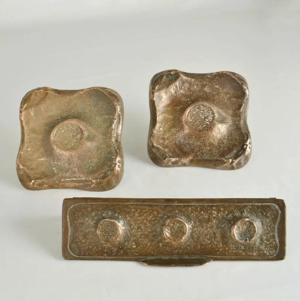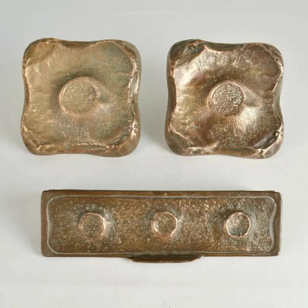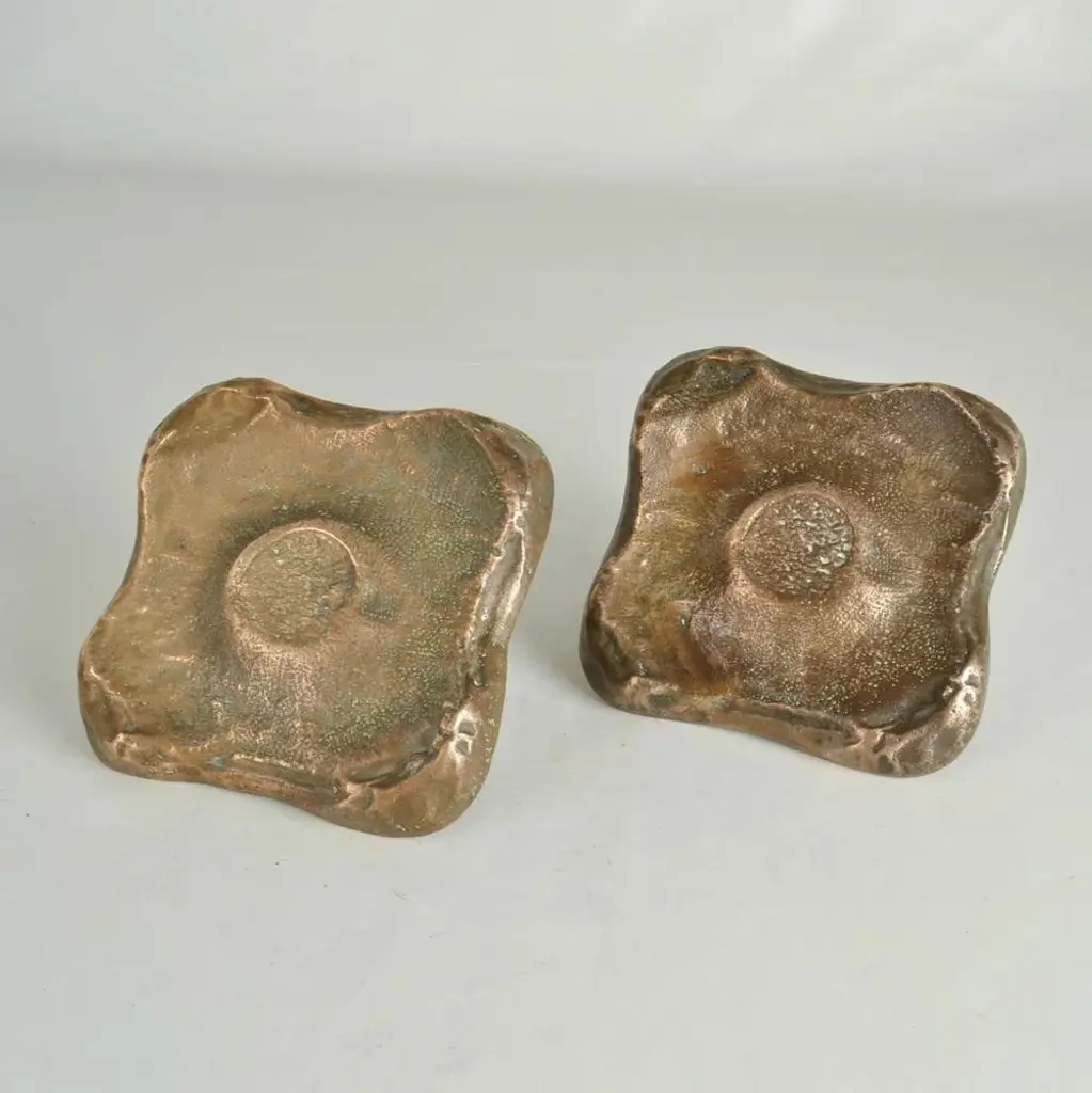 Square pair of push and pull bronze door handles with rounded edges and matching letterbox have an expressionist relief of poppy flowers, (sold as a set of 3 items). They are designed for double doors or a single door on both sides. They are works of art for your doors. These door handles were designed in the 1970s for front doors. They are multi purpose and can be used in or outside on doors. They can be applied on cupboard doors for bespoke furniture as well. These heavy pieces made of cast bronze are in perfect condition. The bronze is oxidized with its original patina adds textured to the surface due to its age . The identical handles can be applied inside or outside on double or single doors next to each other or on opposite sides. They can also be used cupboard doors and kitchen units. These handles have brackets that are attached to the main plate by two fixings, they can be positioned in two ways, inwards outwards. The handles will be fitted to the door with two long standard bolts (not supplied) suiting the thickness of the doors. Approximate dimensions: Main plate H 17 cm x W 13 cm x D 2.5 cm Depth from the face of the door to the front of the handle, including the bracket 6 cm. The price is for the total set of 3 items. We have a large collection of bronze door handles available in all sorts of materials such as glass, wood and petrified wood as well as in with a different patinas.