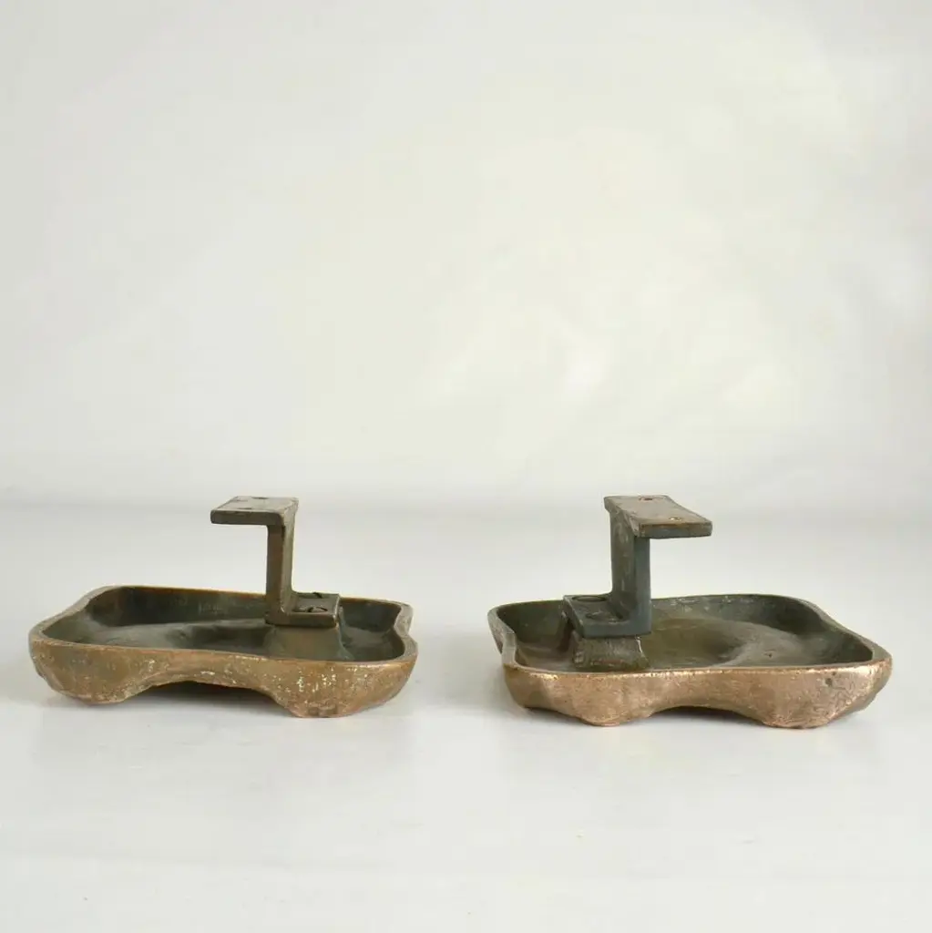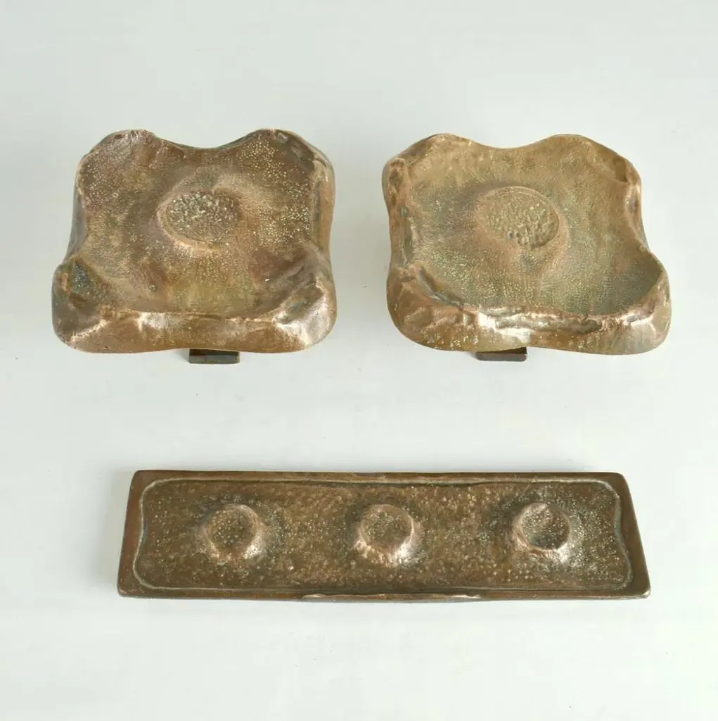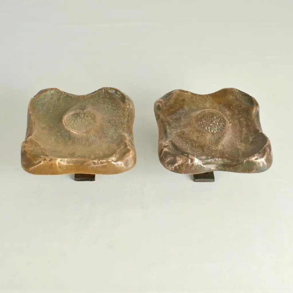 Square pair of push and pull bronze door handles with rounded edges and matching letterbox have an expressionist relief of poppy flowers, (sold as a set of 3 items). They are designed for double doors or a single door on both sides. They are works of art for your doors. These door handles were designed in the 1970s for front doors. They are multi purpose and can be used in or outside on doors. They can be applied on cupboard doors for bespoke furniture as well. These heavy pieces made of cast bronze are in perfect condition. The bronze is oxidized with its original patina adds textured to the surface due to its age . The identical handles can be applied inside or outside on double or single doors next to each other or on opposite sides. They can also be used cupboard doors and kitchen units. These handles have brackets that are attached to the main plate by two fixings, they can be positioned in two ways, inwards outwards. The handles will be fitted to the door with two long standard bolts (not supplied) suiting the thickness of the doors. Approximate dimensions: Main plate H 17 cm x W 13 cm x D 2.5 cm Depth from the face of the door to the front of the handle, including the bracket 6 cm. The price is for the total set of 3 items. We have a large collection of bronze door handles available in all sorts of materials such as glass, wood and petrified wood as well as in with a different patinas.