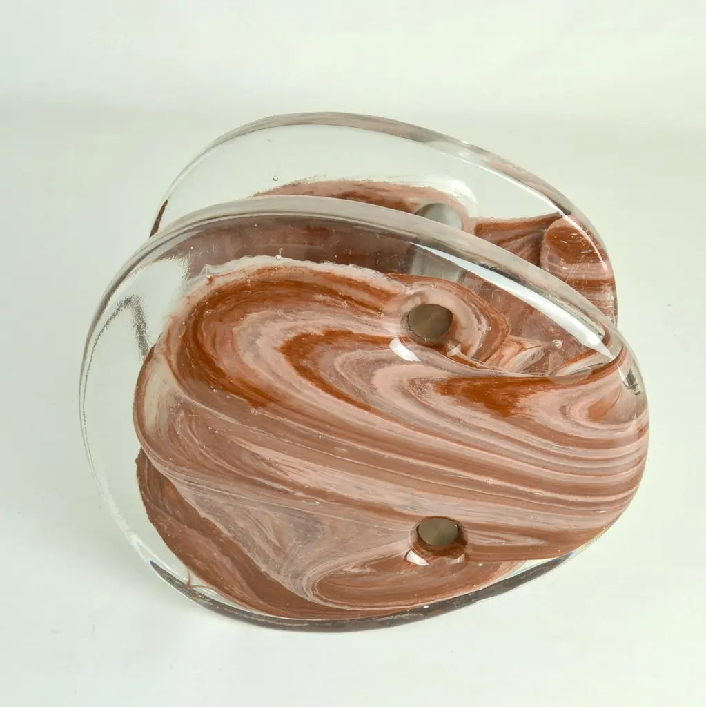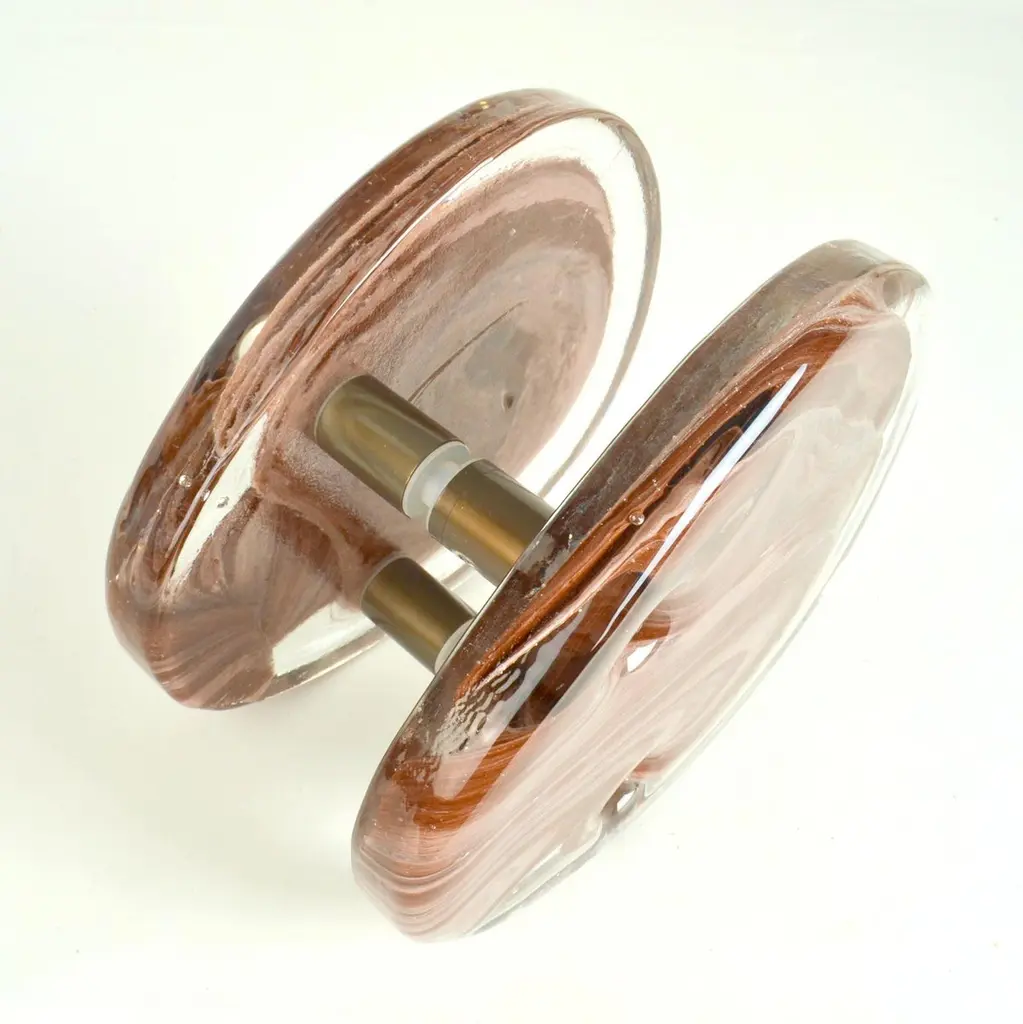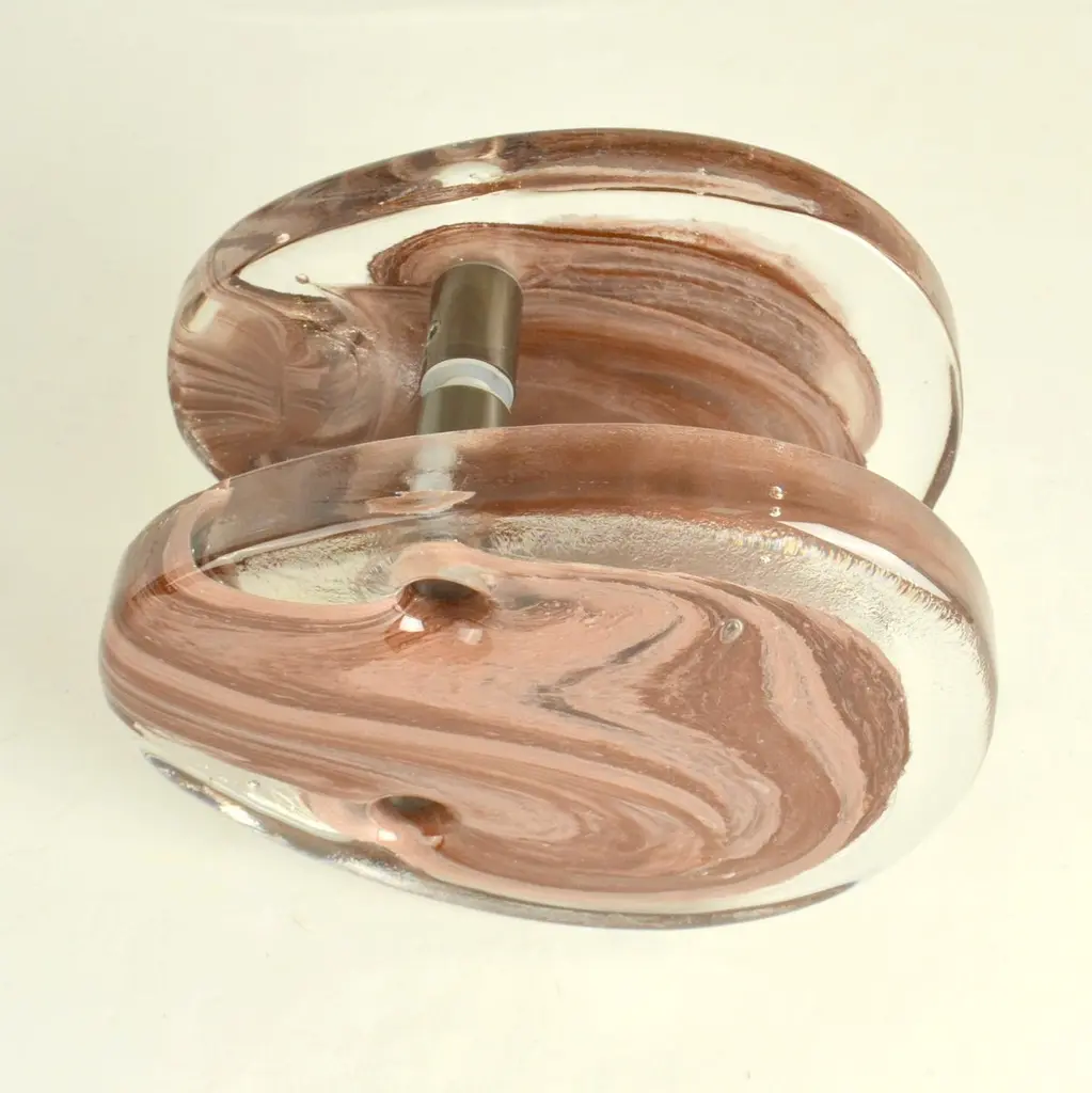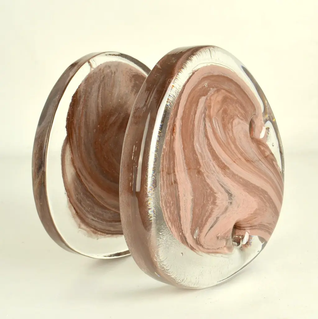 Two sets of oval double door push and pull handles in clear glass with swirls of old pink and burgundy. They are cast glass (2.2cm thick) with bronze anodized fittings, They are designed for a glass doors but suitable for any kind of doors including wooden doors. The glass slabs are cast by directing molten glass into a mould where it solidifies. The surface of the mould gives an uneven effect of diffusion and part translucency around the edges when held to the light. The simple form of the door handles will perform as bold decorative features as well as functional implements. They will work inside or outside any contemporary building today. They can be used on furniture as well as on entry doors.They are priced per set of double door handles. In the first picture you see two sets, priced per set.We have a large collection of door handles available, see all listings by The moderns in the category Building and Garden elements.