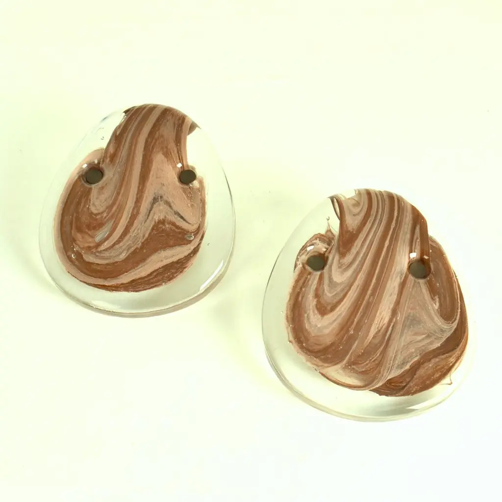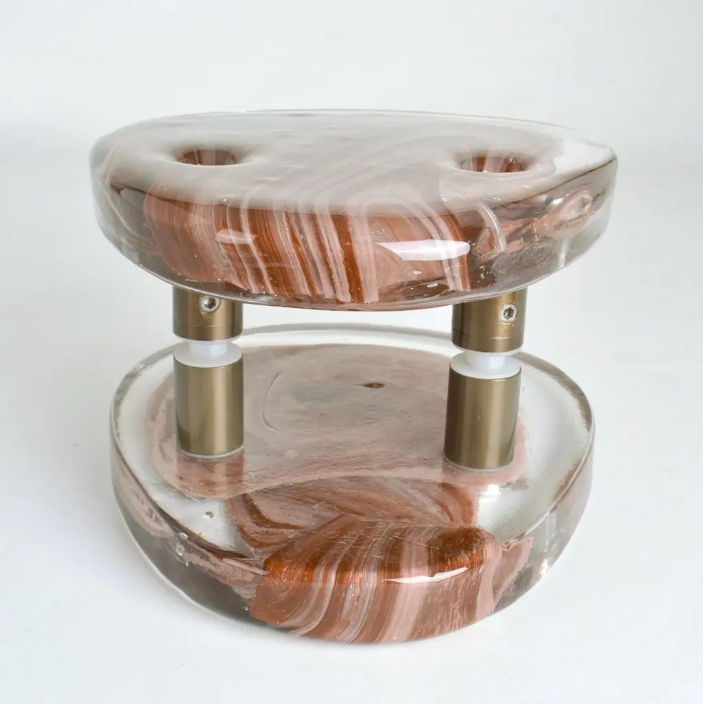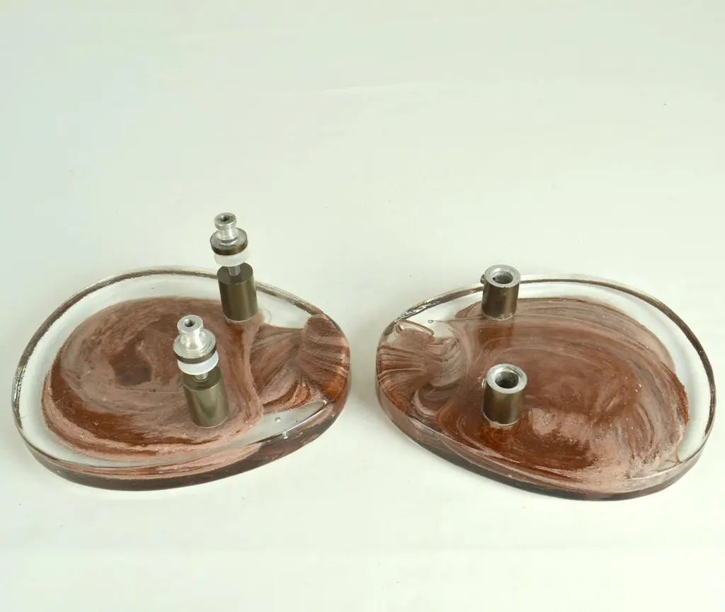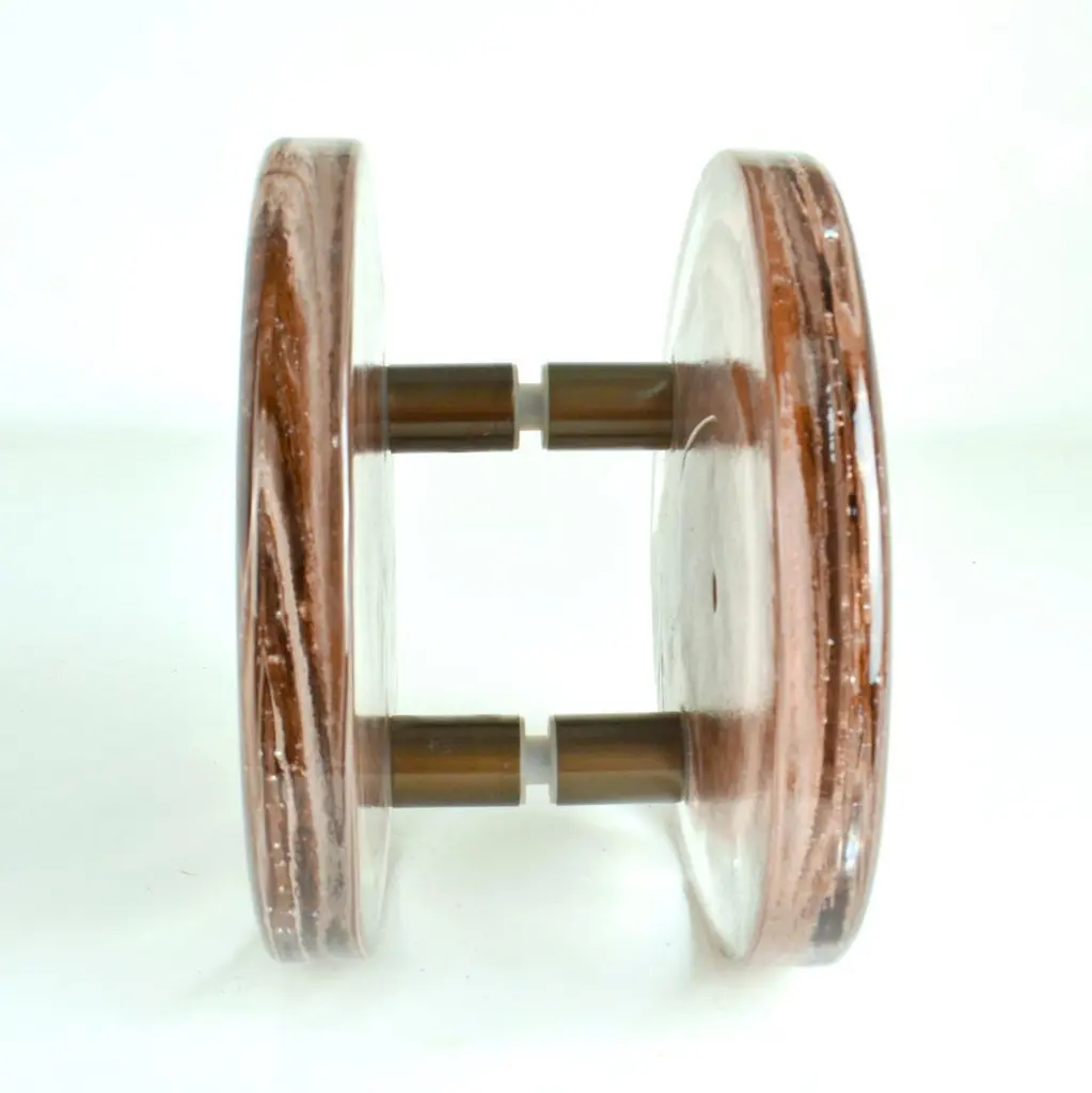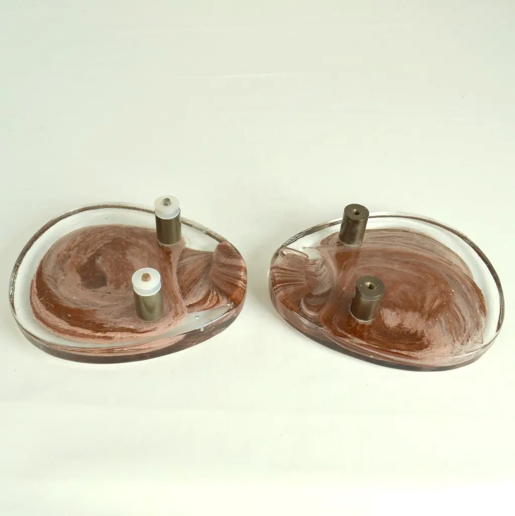 Two sets of oval double door push and pull handles in clear glass with swirls of old pink and burgundy. They are cast glass (2.2cm thick) with bronze anodized fittings, They are designed for a glass doors but suitable for any kind of doors including wooden doors. The glass slabs are cast by directing molten glass into a mould where it solidifies. The surface of the mould gives an uneven effect of diffusion and part translucency around the edges when held to the light. The simple form of the door handles will perform as bold decorative features as well as functional implements. They will work inside or outside any contemporary building today. They can be used on furniture as well as on entry doors.They are priced per set of double door handles. In the first picture you see two sets, priced per set.We have a large collection of door handles available, see all listings by The moderns in the category Building and Garden elements.