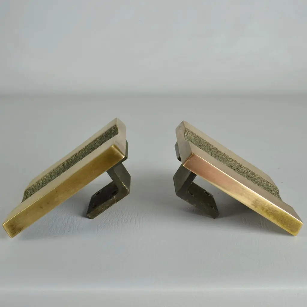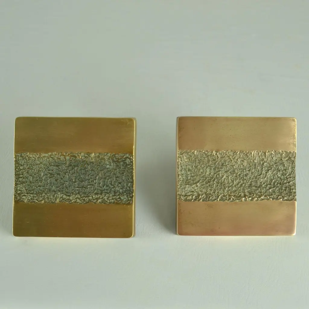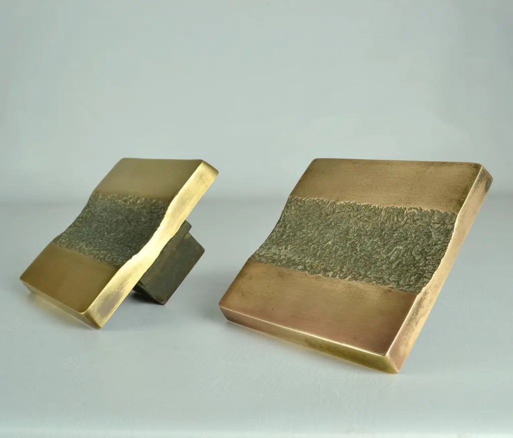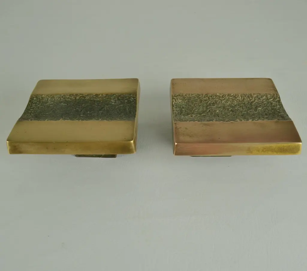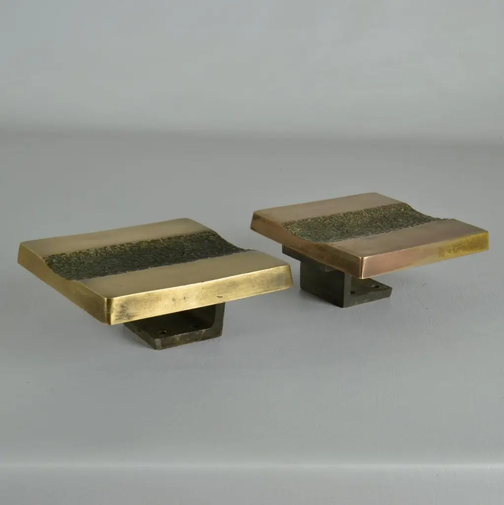 Pair of square bronze push and pull door handles and matching bell with central horizontal border of Brutalist relief creating a stunning detail to the door. They can be mounted on any kind of door. They have great original patina, the deep area's there is a strong oxidized green texture and on the flat surface they are smooth.The pieces are fitted to the door with two standard nuts and bolt fixings (not included) to suit the thickness of your door/s.There is a third handle available + matching bell. Pictures and prices on request.We have a large collection of door handles available. We can also provide matching letter boxes, bells and key hole covers on request.