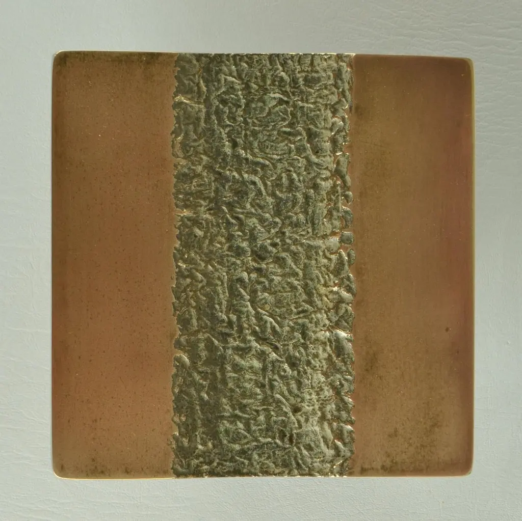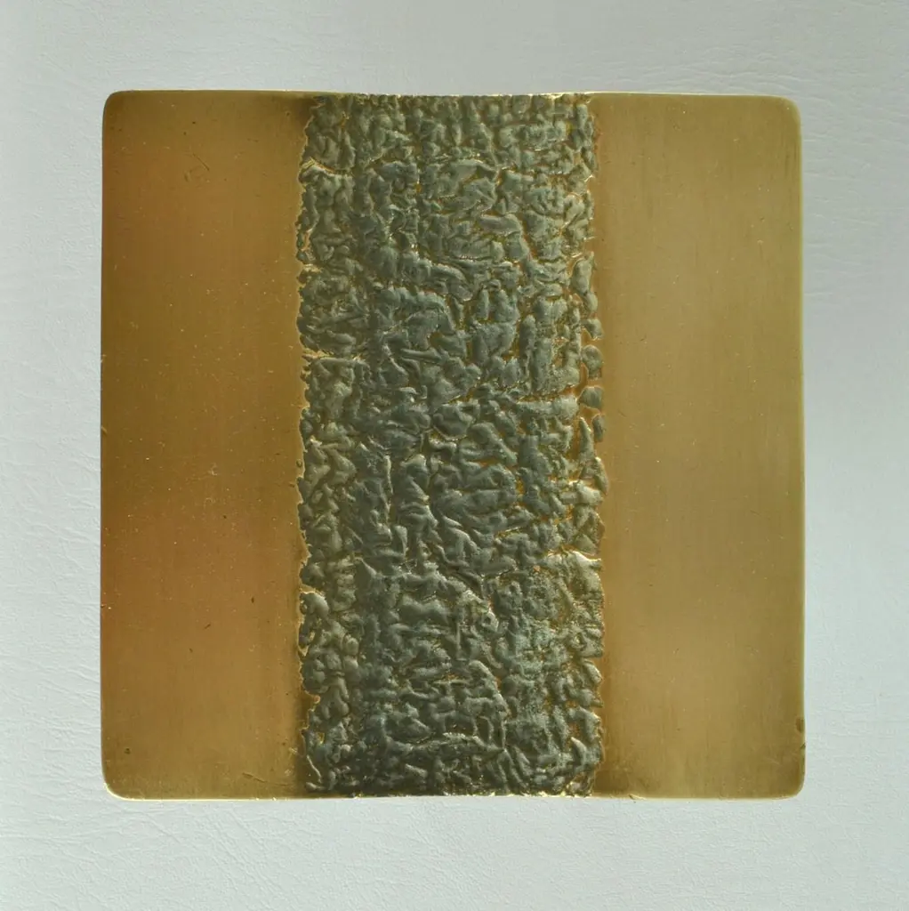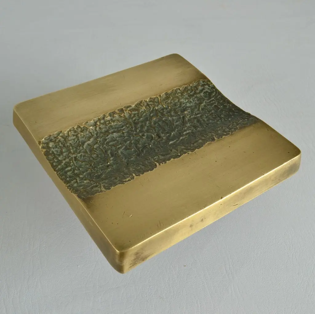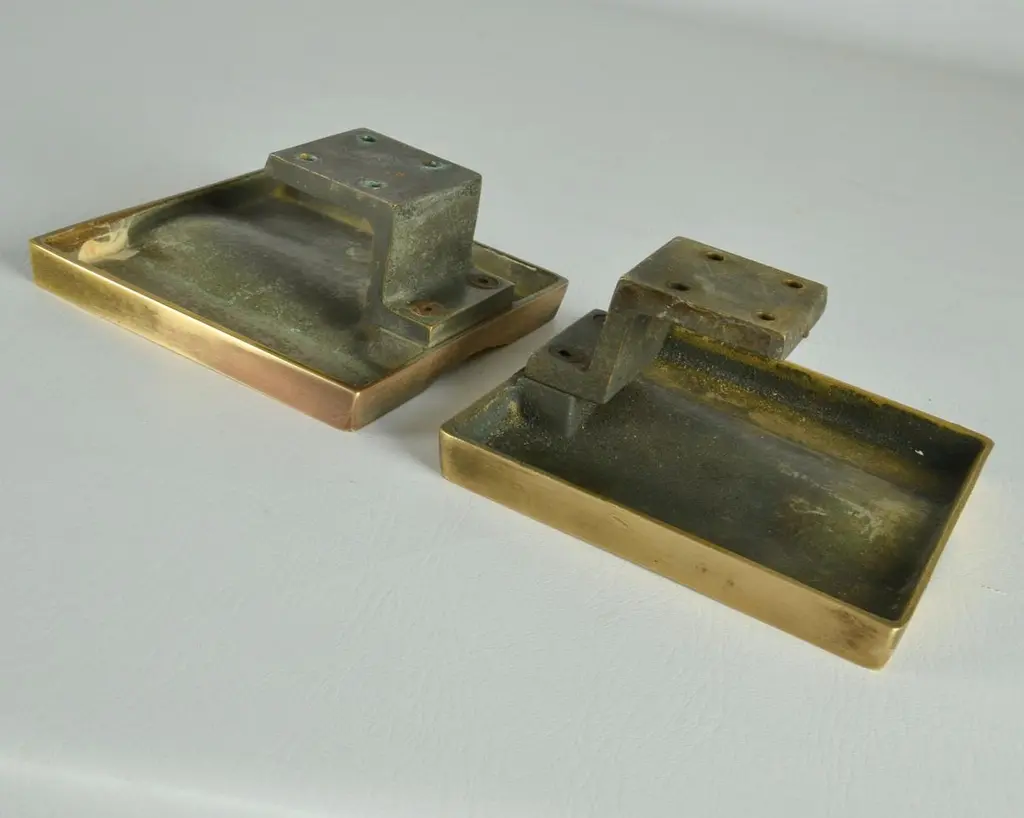 Pair of square bronze push and pull door handles and matching bell with central horizontal border of Brutalist relief creating a stunning detail to the door. They can be mounted on any kind of door. They have great original patina, the deep area's there is a strong oxidized green texture and on the flat surface they are smooth.The pieces are fitted to the door with two standard nuts and bolt fixings (not included) to suit the thickness of your door/s.There is a third handle available + matching bell. Pictures and prices on request.We have a large collection of door handles available. We can also provide matching letter boxes, bells and key hole covers on request.