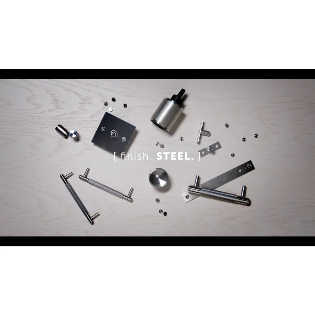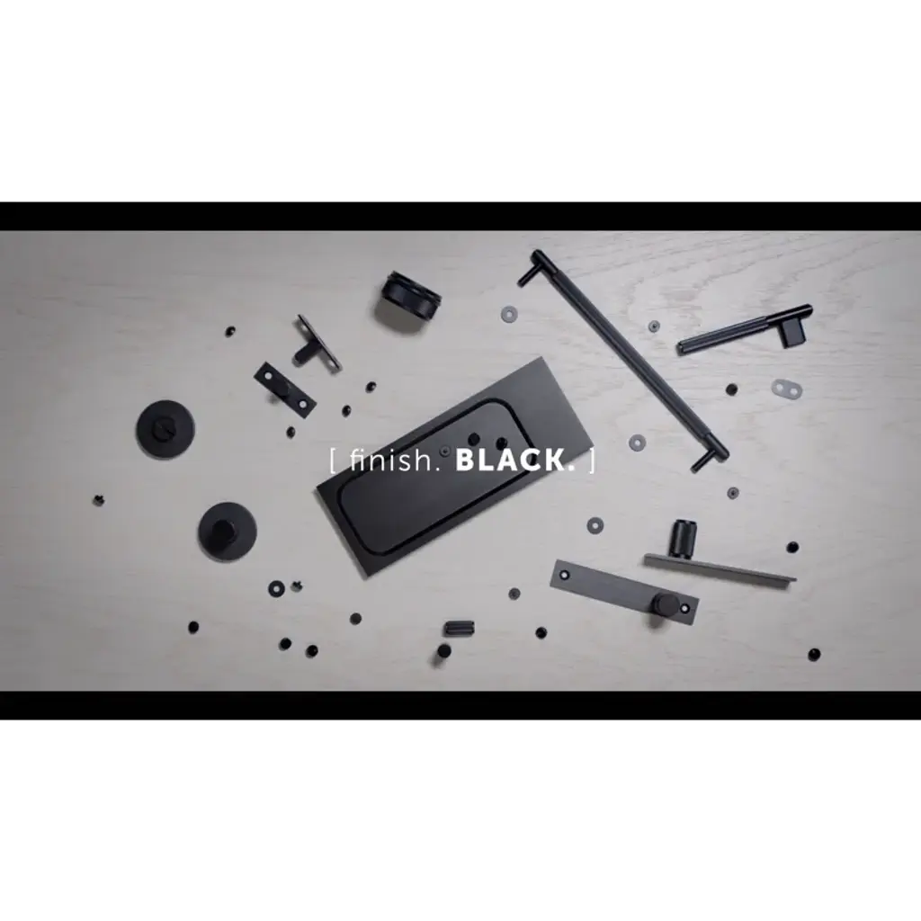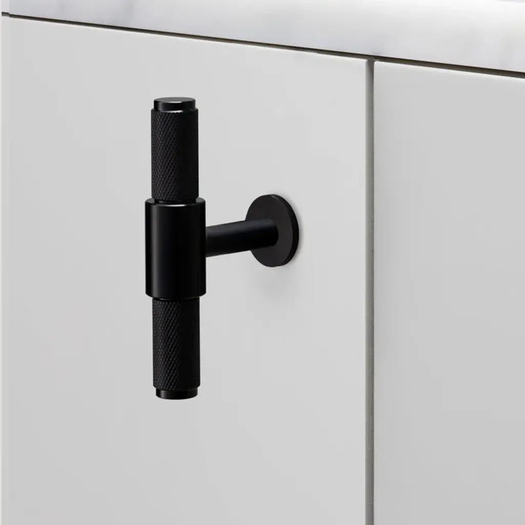 A T-bar made from solid black anodised metal. This T-bar features our signature, diamond-cut, cross-knurl pattern and is refined by hand. They work great on cabinet doors, cupboards, kitchen units and just about anything that can open.