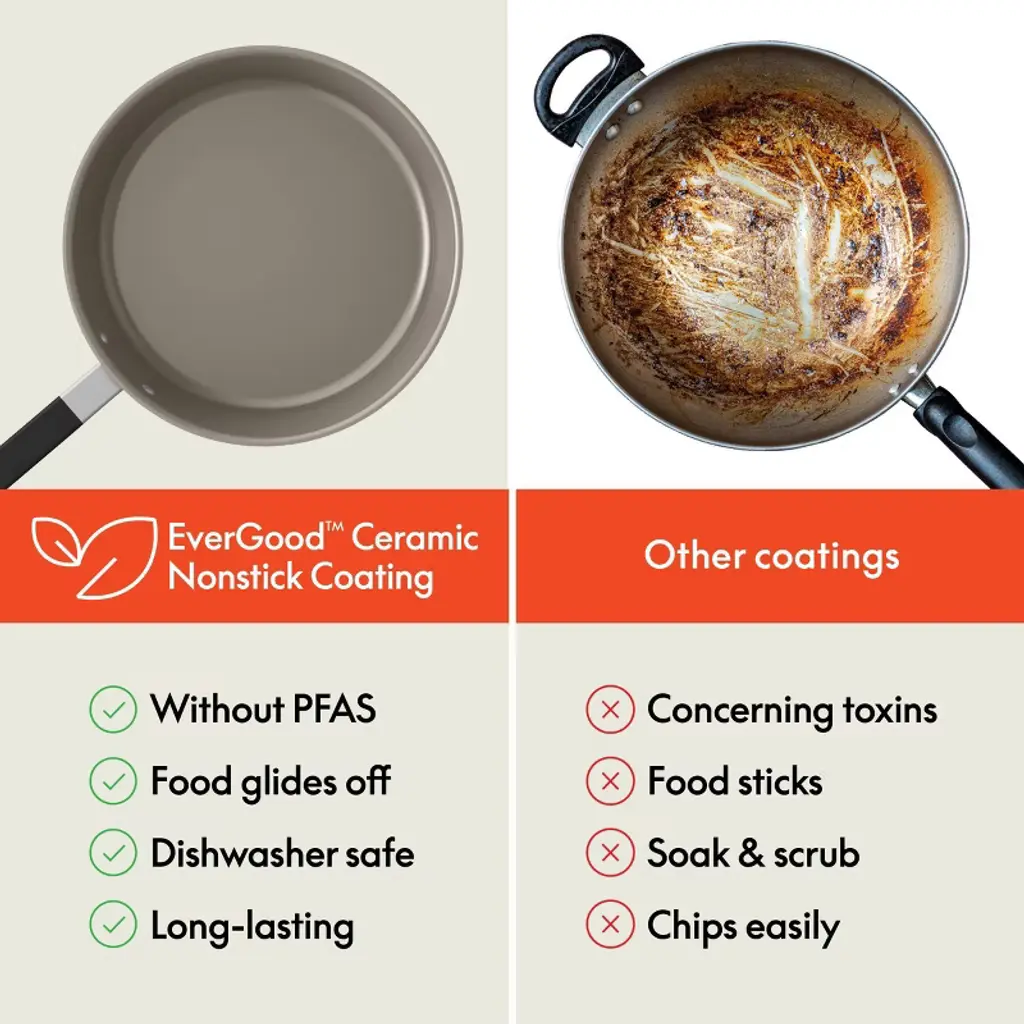 Part of our Fits-anywhere ™ kitchenware system, all the pieces in the bella 9-Piece StoreMore Cookware Set nest together for a convenient space saving solution. Made for home cooks that want performance but need more space, this set delivers. And, it features our EverGood™ Ceramic Nonstick Coating that’s made without PFAS, PFOA, PTFE, lead and cadmium. The set includes 2 universal lids compatible with each vessel – reducing piece count. Safe for all cooktops, including induction.