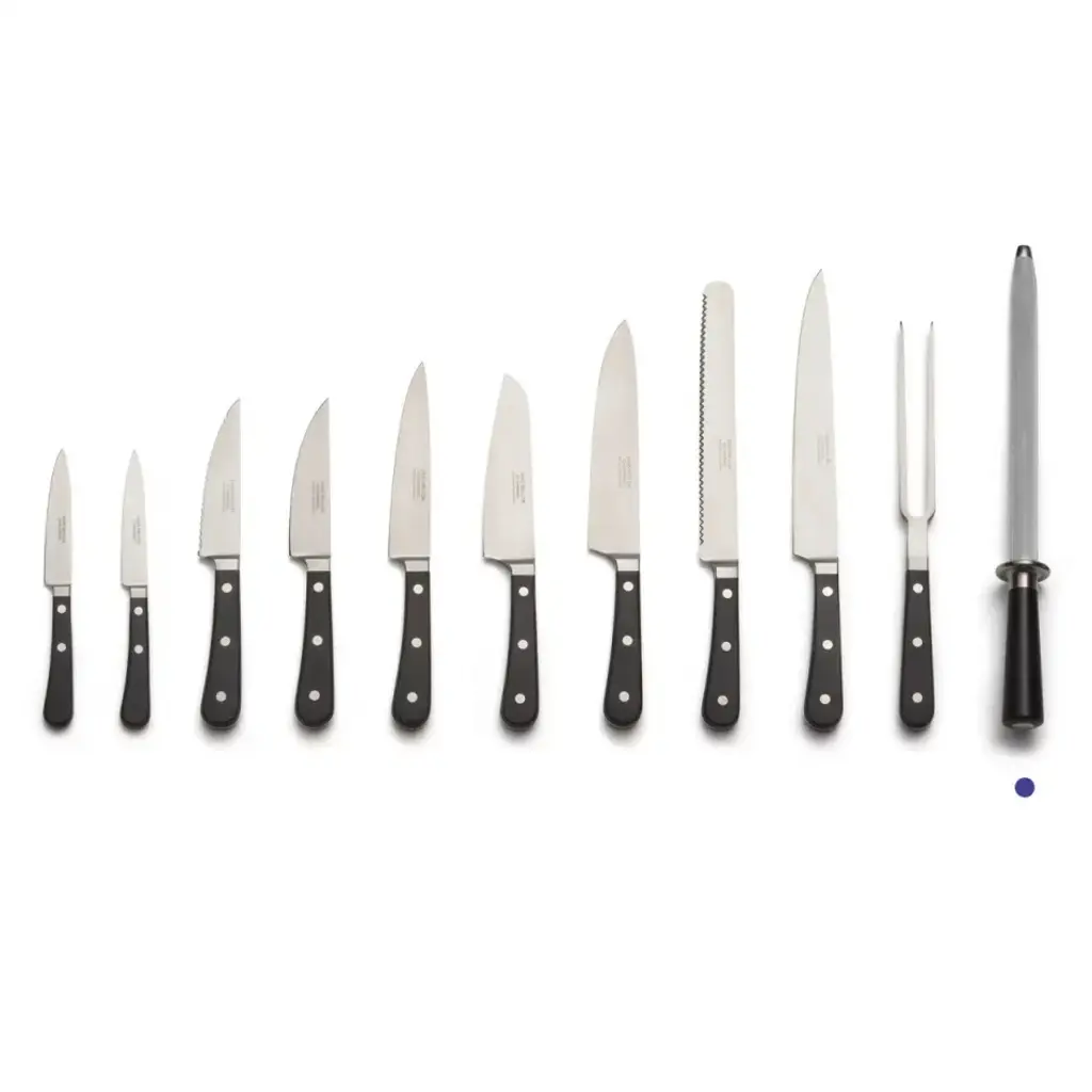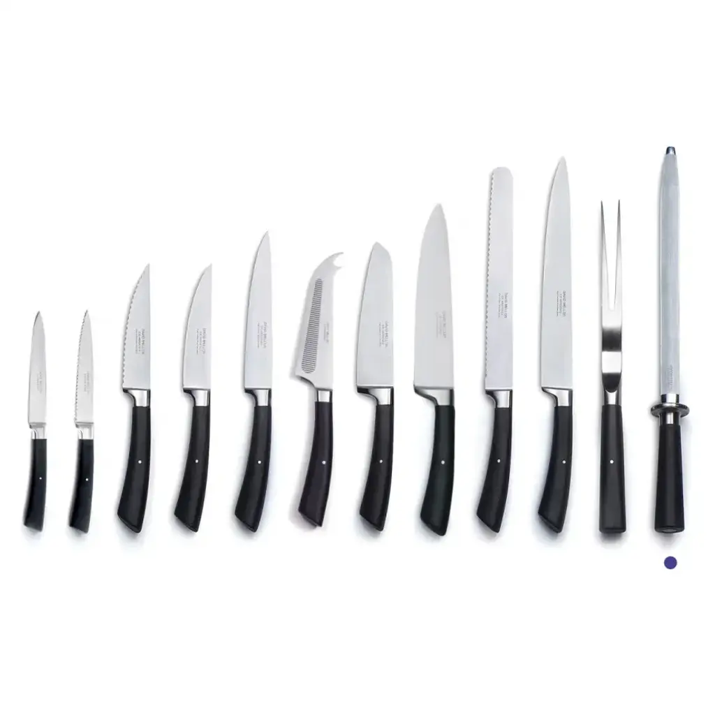 Corin Mellor's 'Black Handle' stainless steel kitchen knives, specially developed for David Mellor Design, have proved enormously popular since they were first introduced. The collection has a very distinctive modern look and high levels of performance, using the latest innovative manufacturing techniques. Ice hardening processes make the blades exceptionally sharp. These are really professional kitchen knives, superb in quality and beautiful to use. These are razor sharp knives. The high carbon stainless steel blades exploit the latest techniques of steel casting and are then ice hardened to minus 80°c. This innovative process stabilizes the metallurgical structure of the steel, creating an extremely hard and durable cutting edge. The knives are taper ground with the forging running down the full length of the handle. Each knife handle incorporates an internal back weight, giving an excellent balance and grip. All knives are supplied in individual David Mellor boxes.
