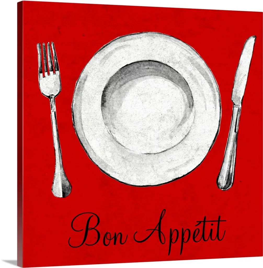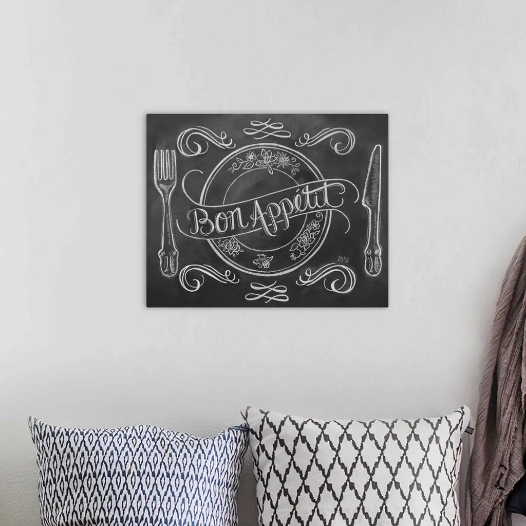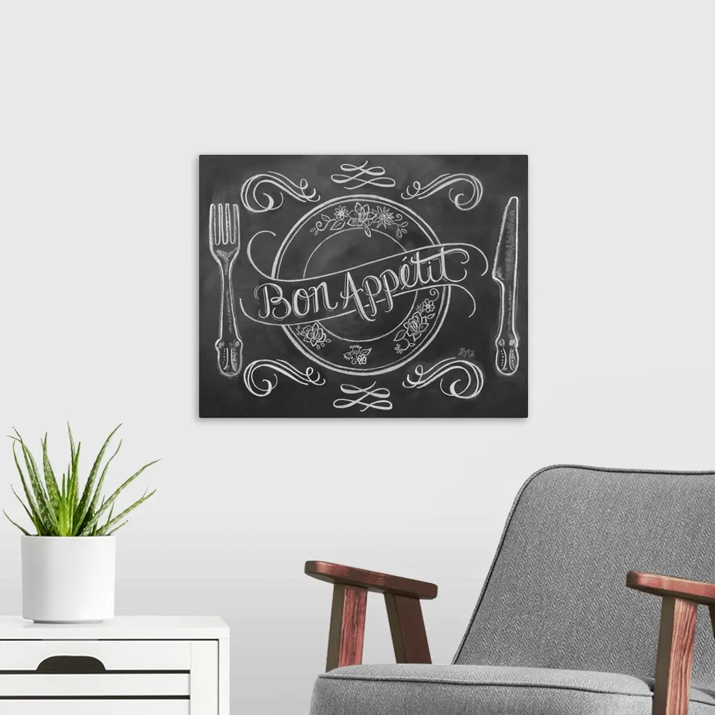 "Bon Appetit" handwritten on a drawing of a place setting in white chalk on a black background.