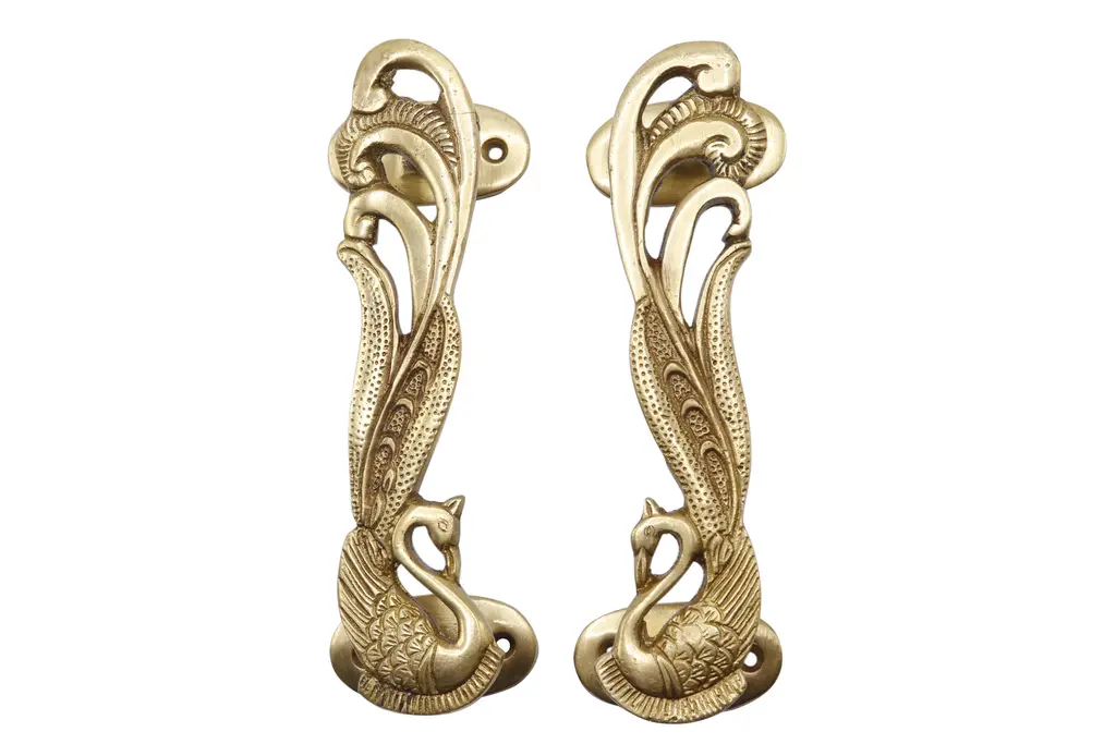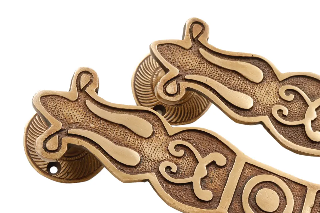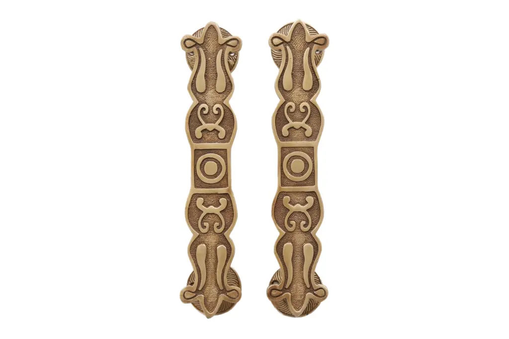 A pair of brass door handles. Flat bar shaped handles are embossed with simple wave and circle patterns. Dimensions per handle.